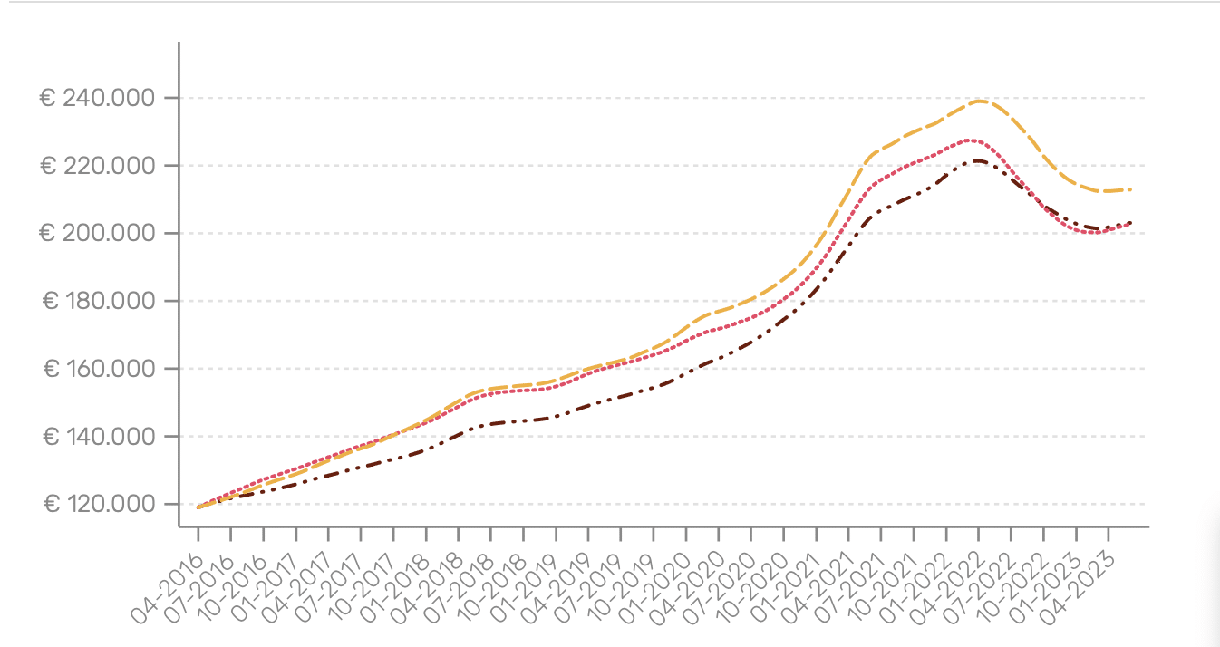 In onderstaande tabel vindt u een prijsontwikkelingsgrafiek. De gele lijn geeft de gemeente Zaanstad aan, de roze lijn de provincie Noord-Holland en paarse lijn de ontwikkeling in heel Nederland.