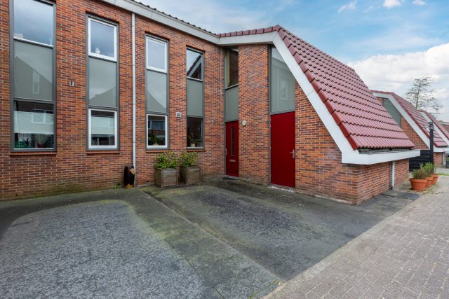 We zetten de auto op de eigen oprit en bereiken de voordeur. De entree kan ook via de inpandige (fietsen)berging worden bereikt. In deze berging is nog veel opbergruimte beschikbaar.