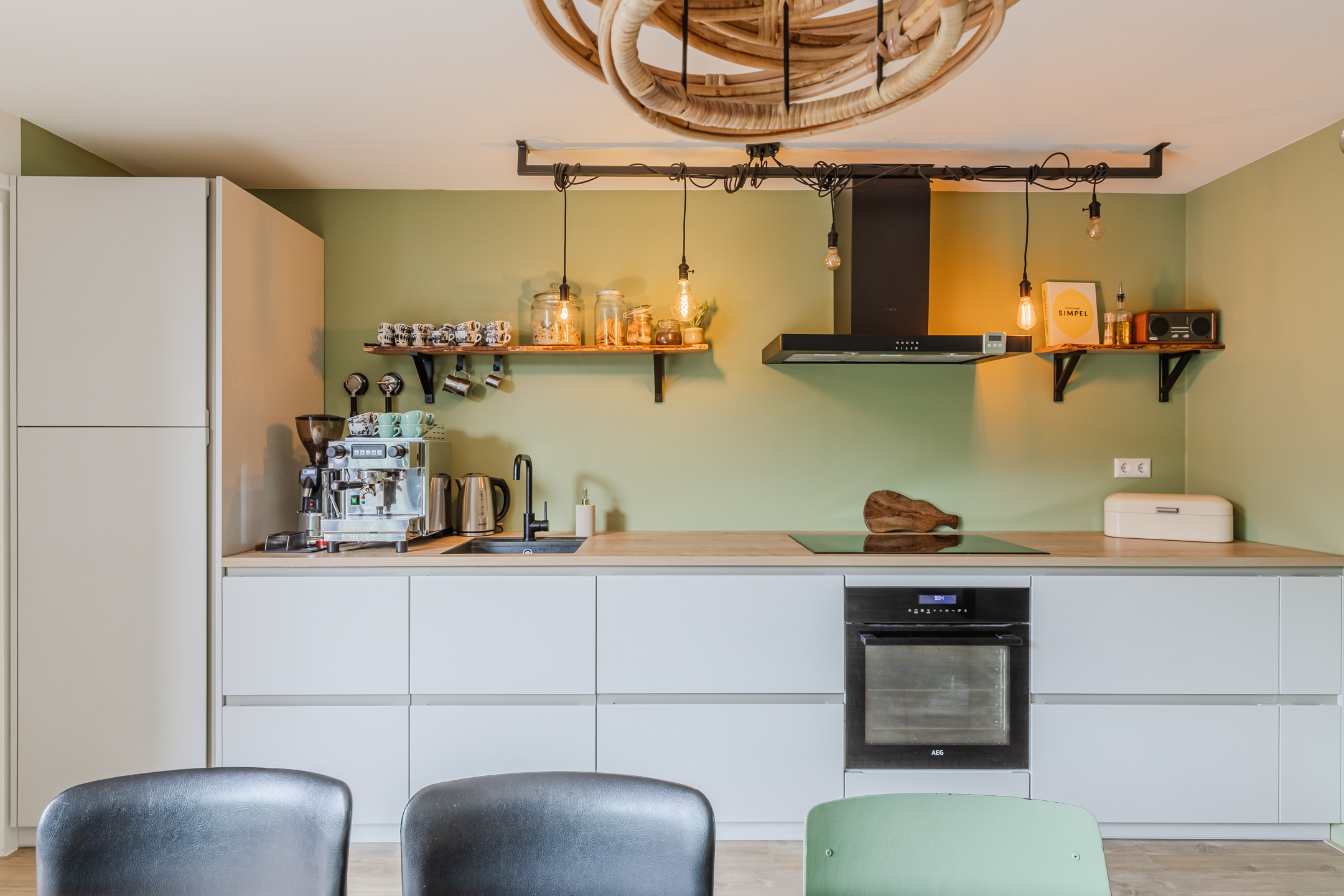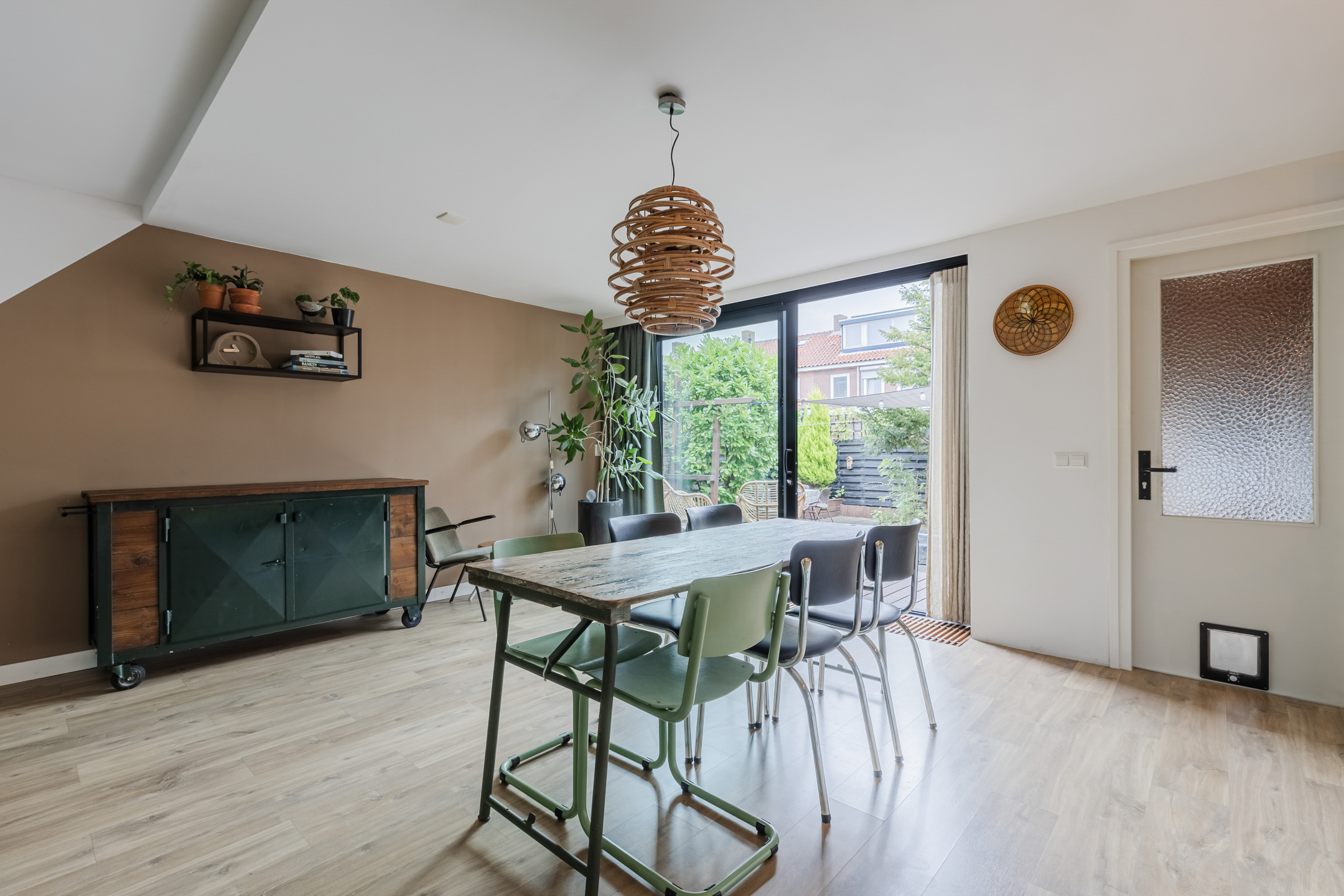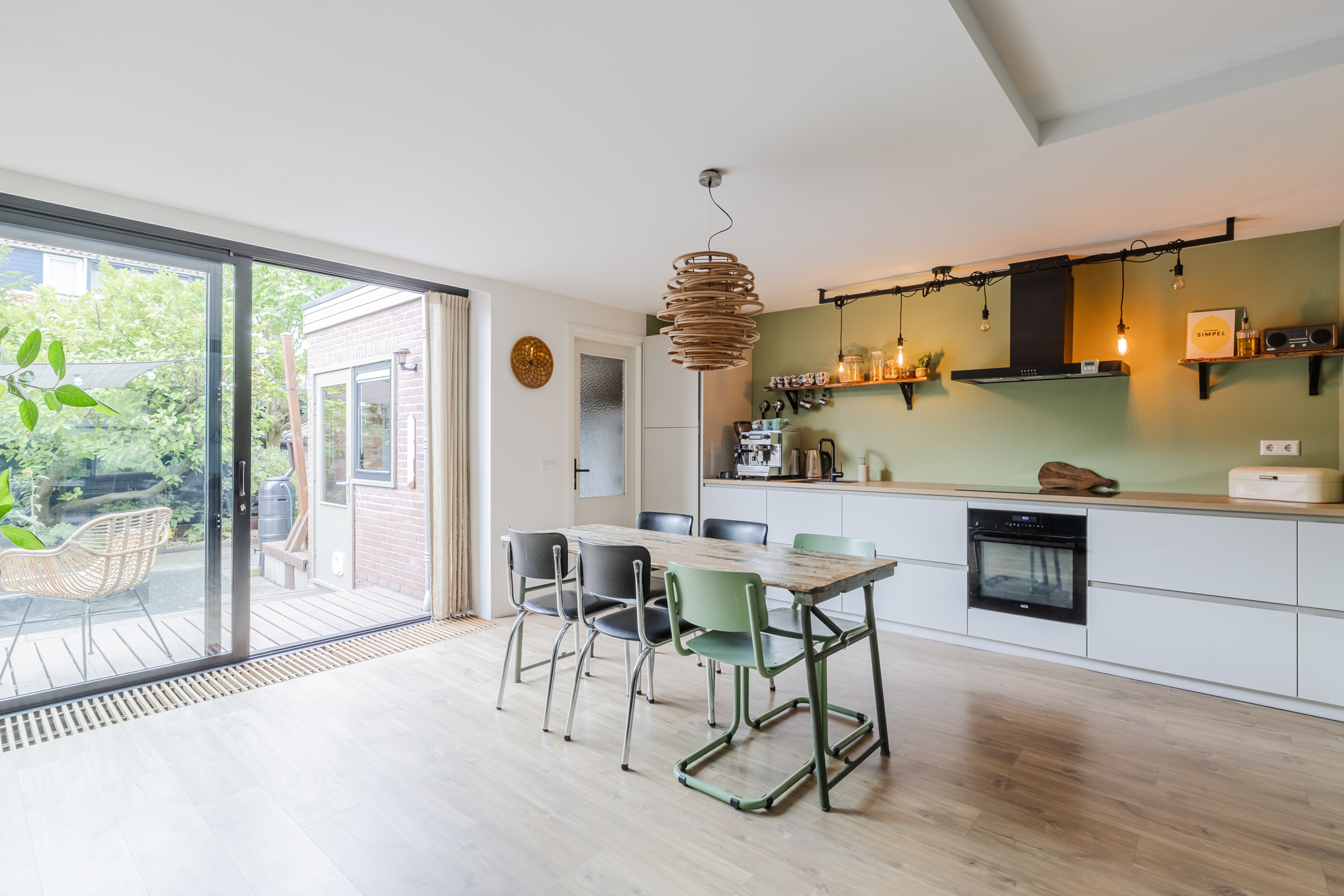 De netjes afgewerkte eetkamer biedt genoeg ruimte voor een grote eettafel. Dankzij de schuifpui naar de tuin is ook hier de lichtinval uitstekend. De open keuken komt uit 2018 en is uitgevoerd in een rechte opstelling. De keuken heeft een fraai design met witte keukenkastjes en een extra diep houtkleurig werkblad. Moderne apparatuur is er in de vorm van een XL-vaatwasser, inductie kookplaat, afzuigkap, oven en koelkast.