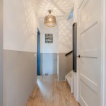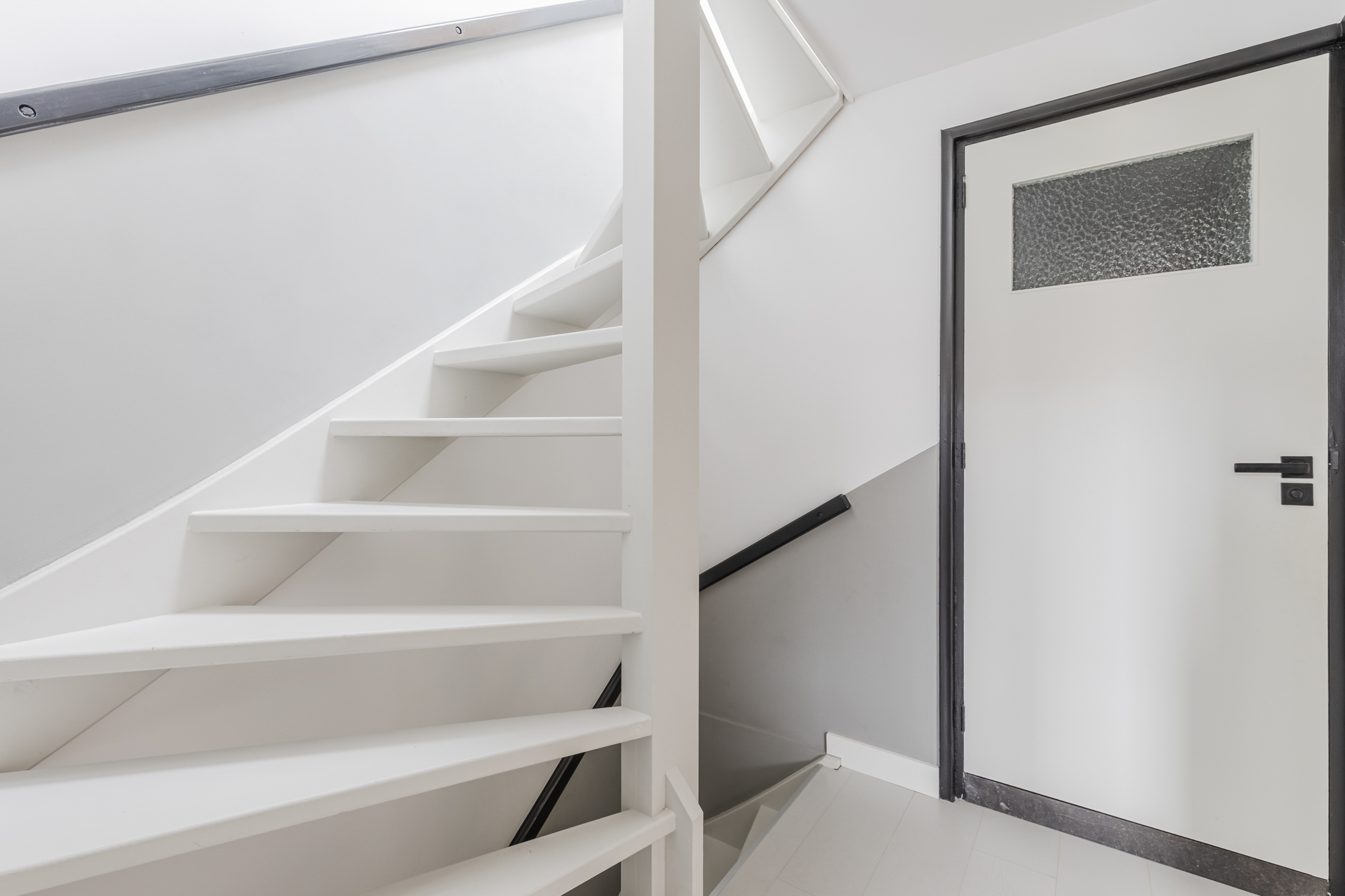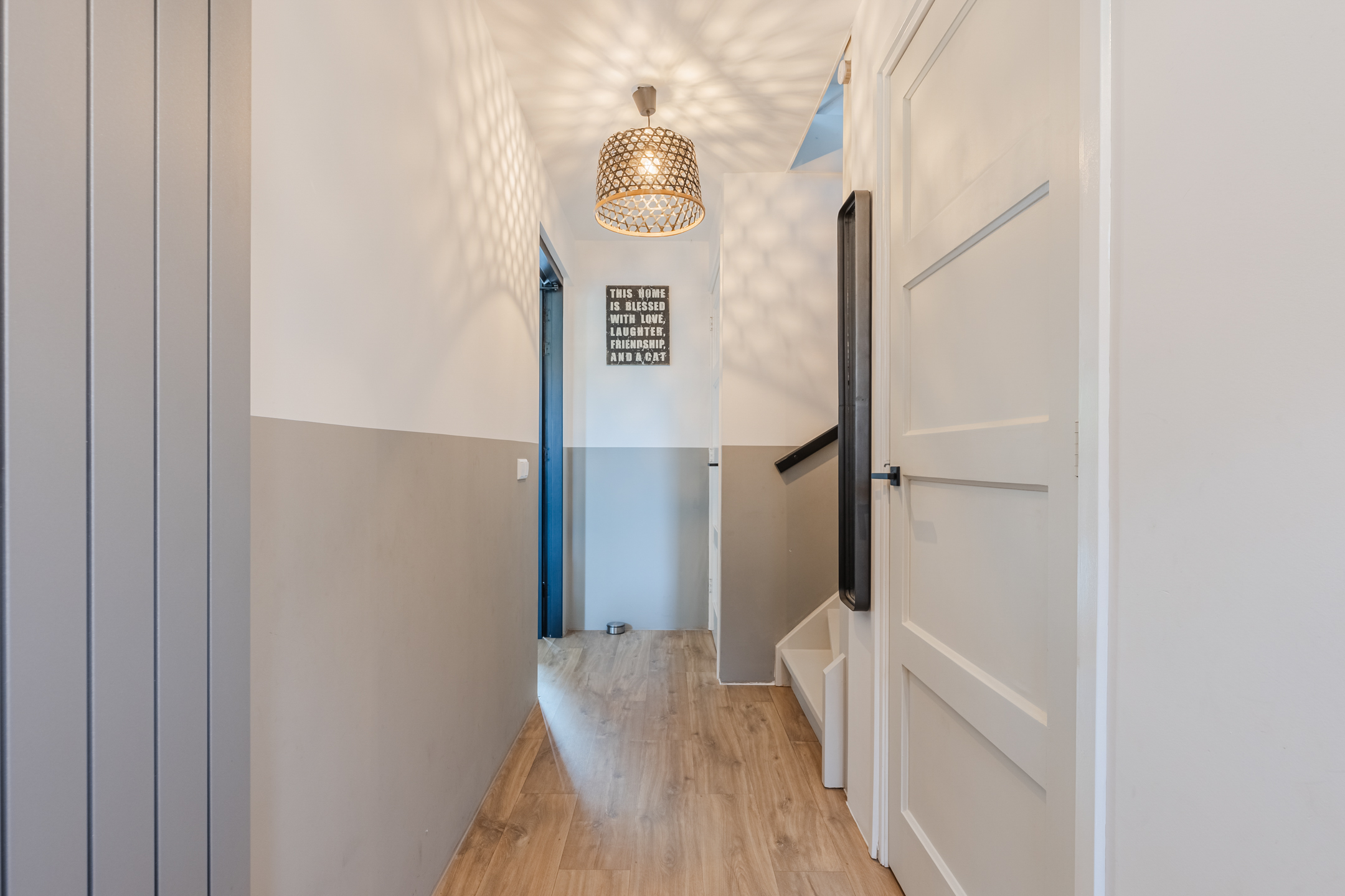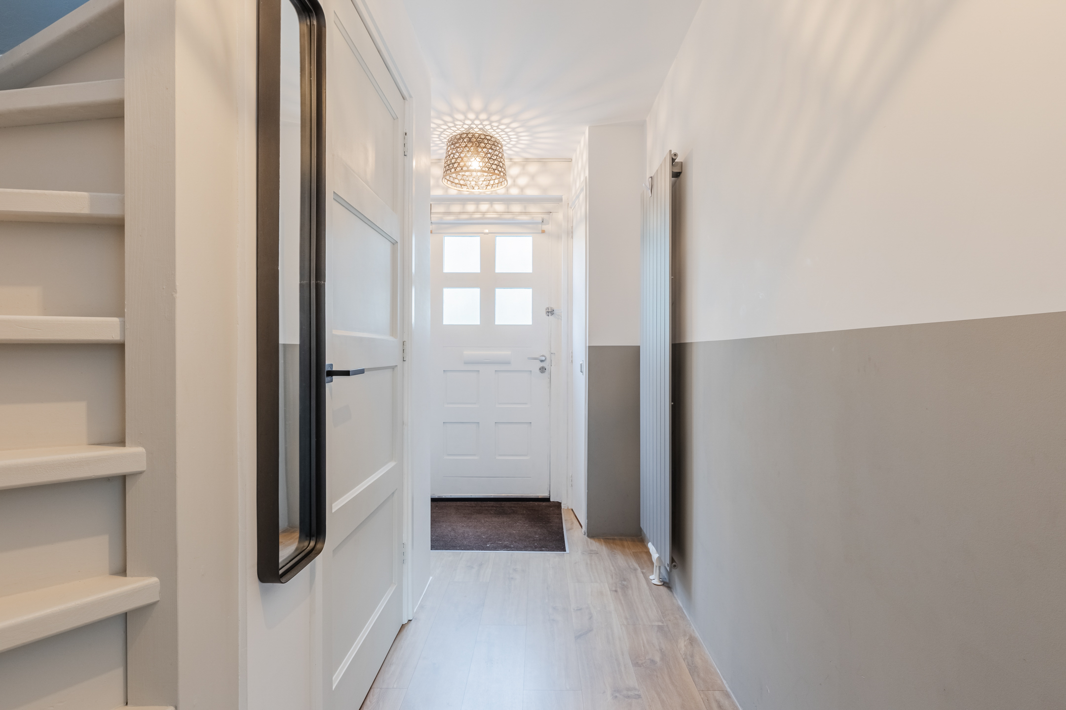 Via de deels groene en deels betegelde voortuin bereik je de voordeur van deze mooie woning. Na binnenkomst word je verwelkomd in een ruime en fraai afgewerkte entreehal met meterkast, opbergbankje voor schoenen, een grote trapkast, de trap naar de eerste verdieping en een toiletruimte met zwevend toilet. Vanuit de hal heb je toegang tot de woonkamer.