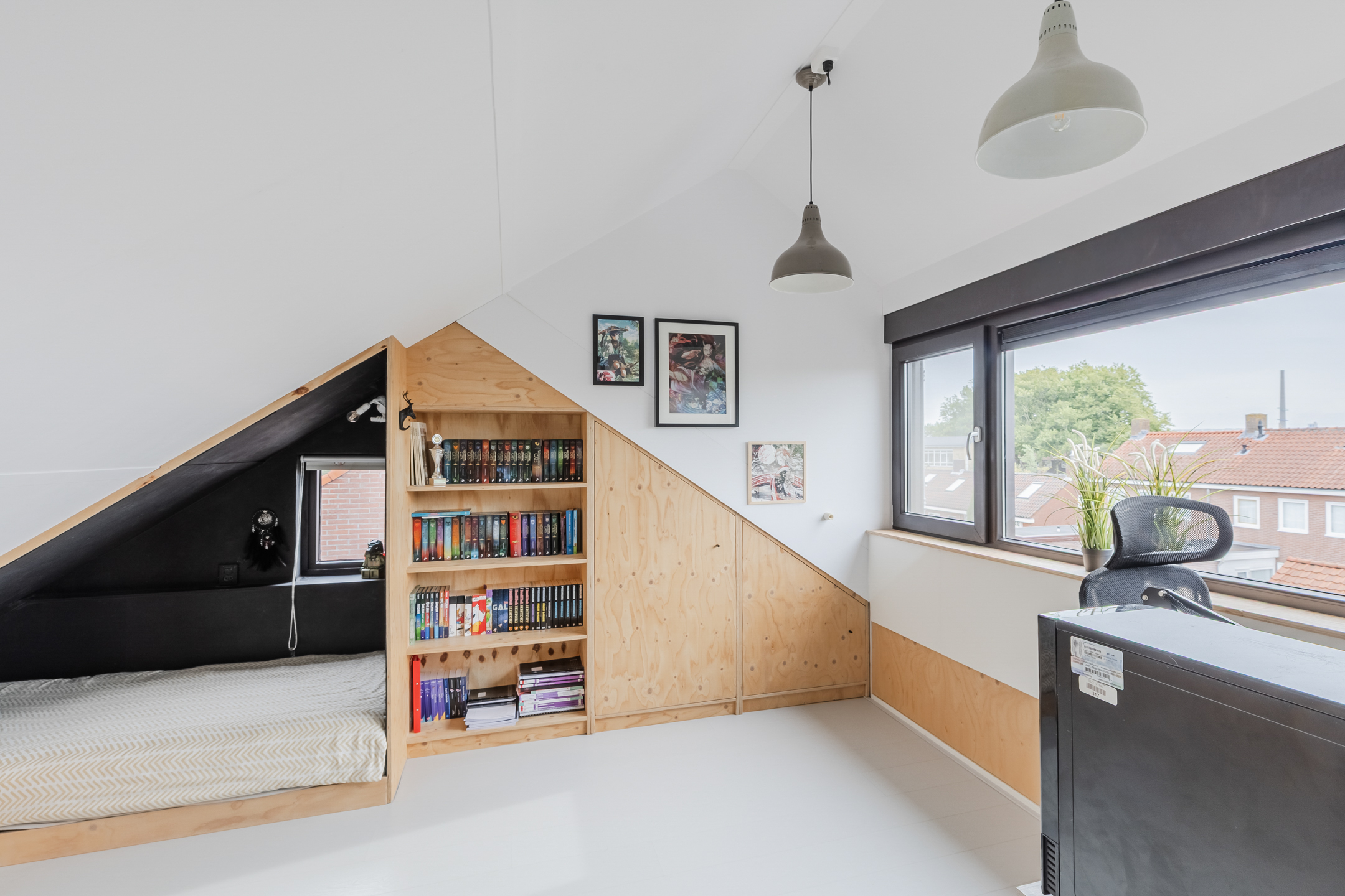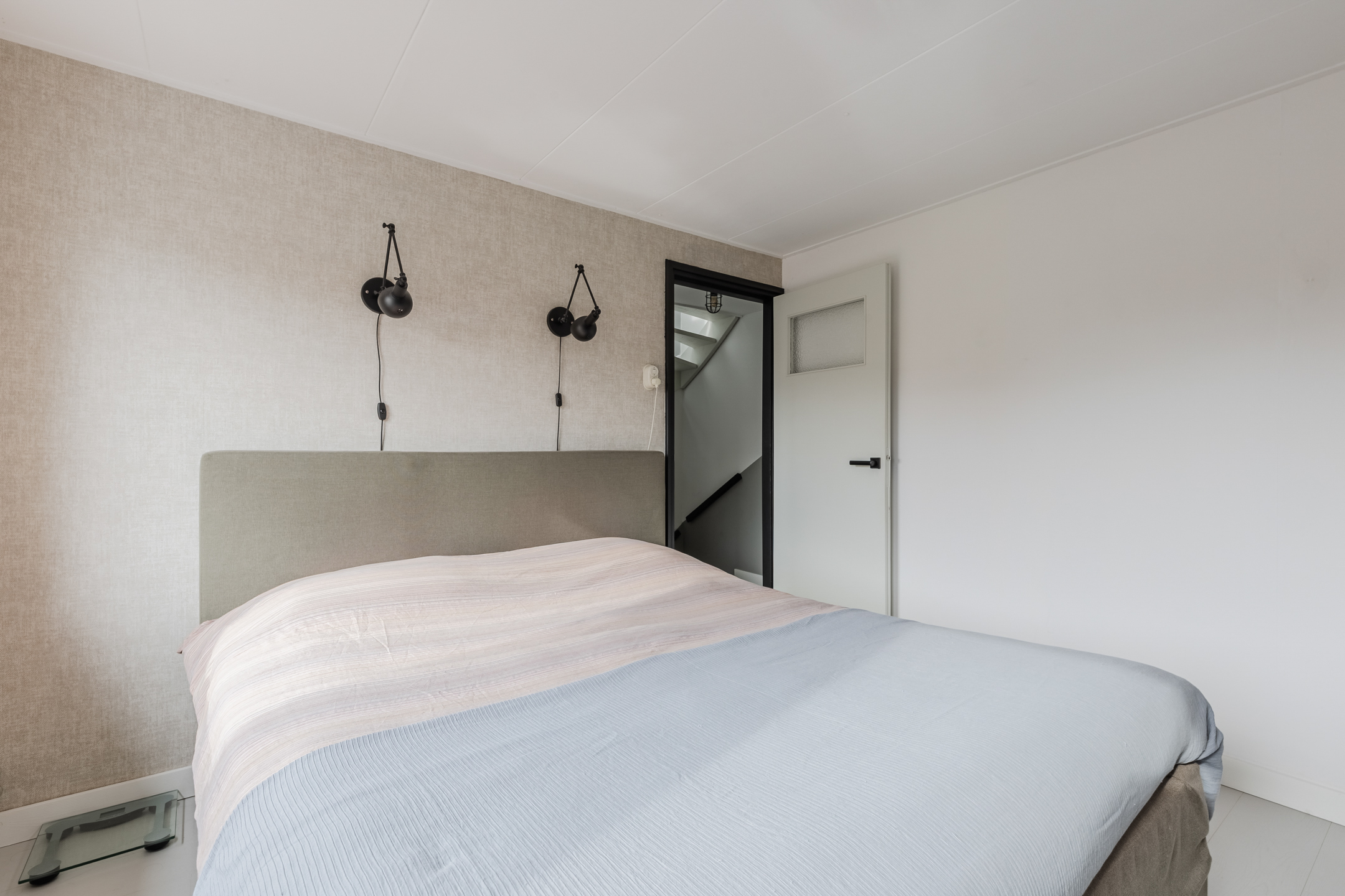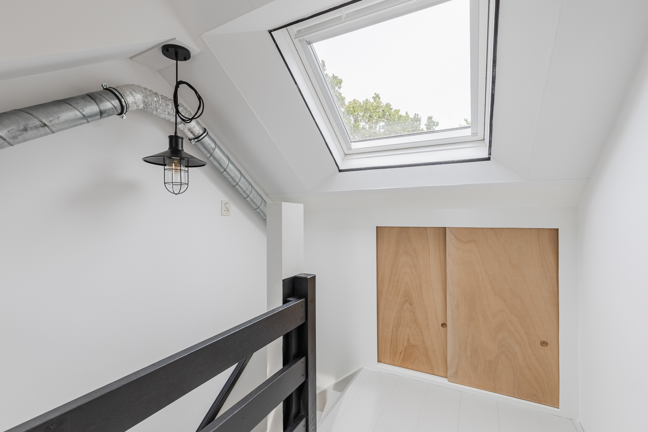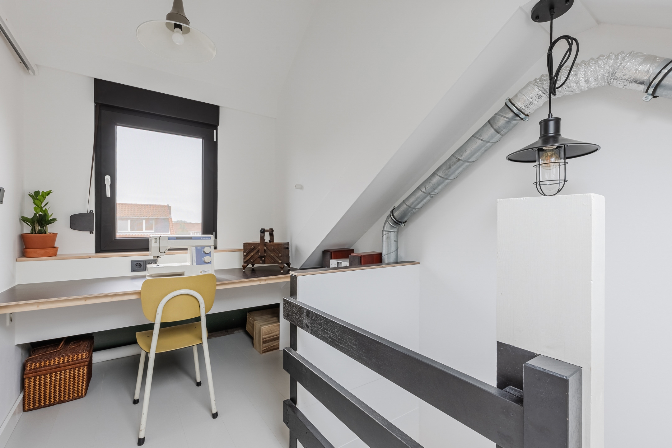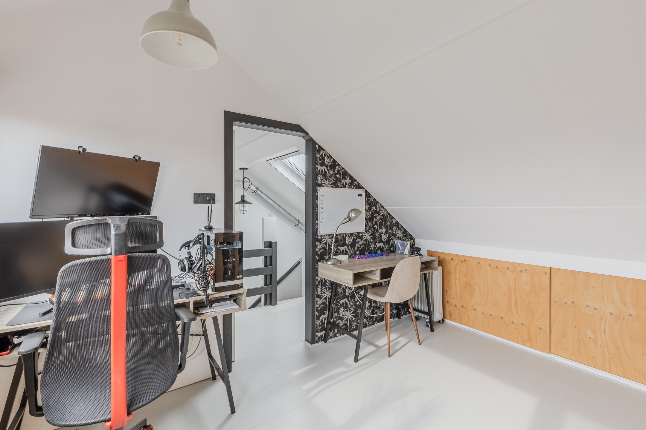 Een vaste trap geeft toegang tot de ruime overloop van de tweede verdieping. Hier is alle ruimte om een werkplek te creëren. De overloop biedt toegang tot een berging en de vierde slaapkamer. De kamer op deze verdieping is heerlijk ruim en licht dankzij de dakopbouw. Er is aan beide kanten bergruimte gecreëerd.