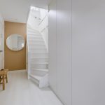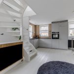This floor contains the living area with a living room and open kitchen. The living room has light-colored flooring and the walls are partially covered with modern wall panels. Thanks to the presence of multiple windows, there is plenty of natural light. The room is also illuminated by recessed spotlights. The staircase to the second floor is located in the center of the living room.