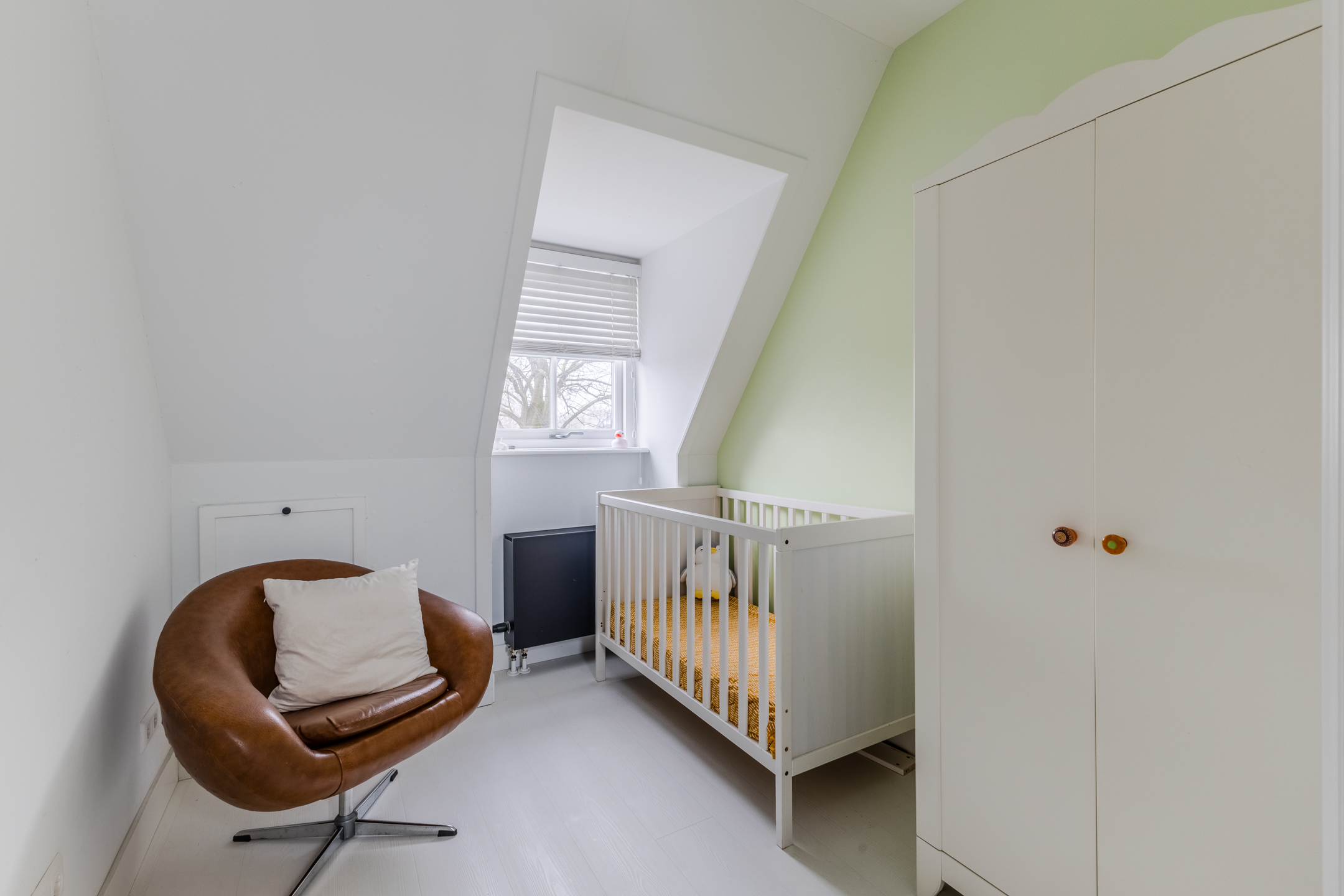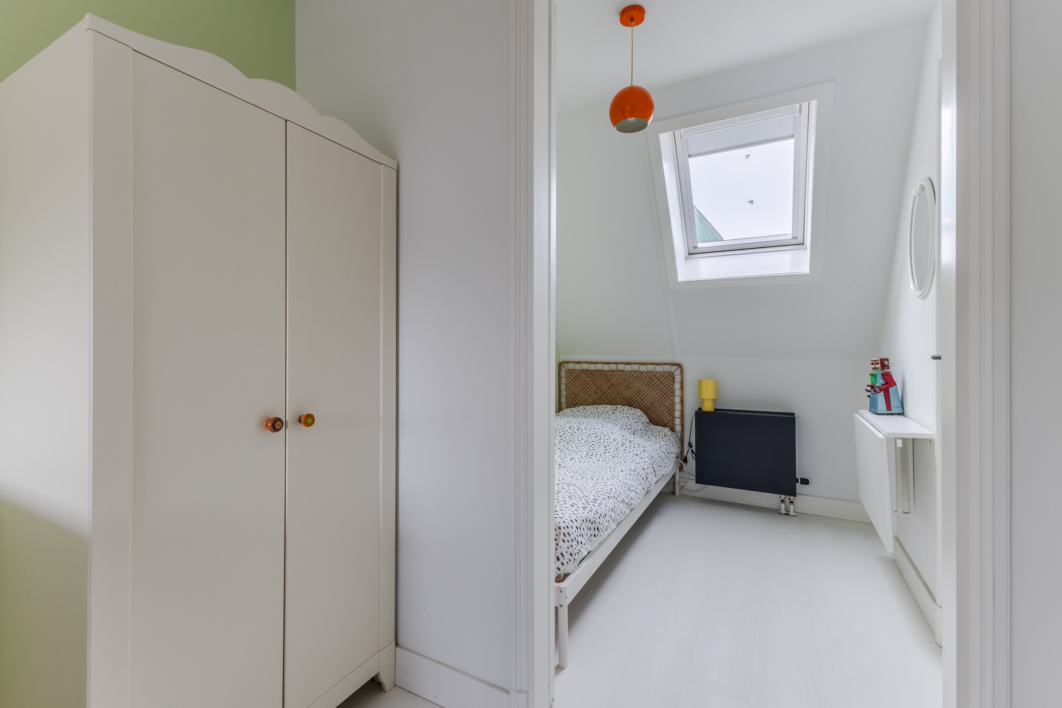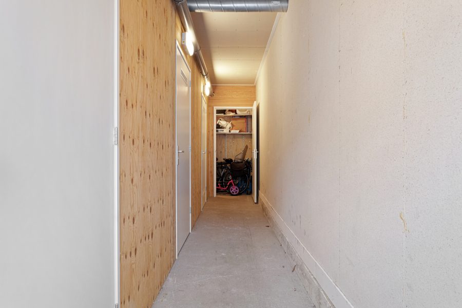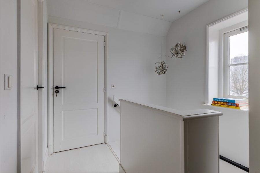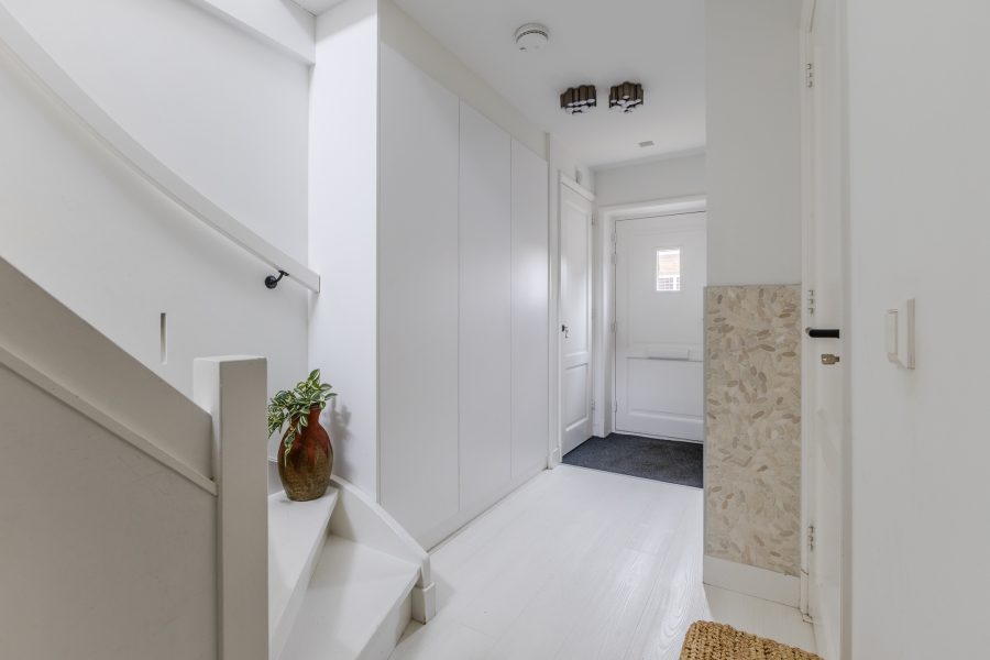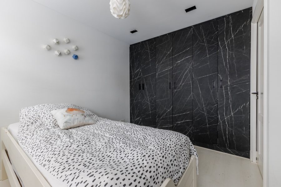 Behind the front door is a spacious, neatly finished entrance hall. From here you have access to the meter cupboard, storage cupboards, the stairs to the upper floor, the first bedroom and the bathroom. The bedroom is spacious and modernly furnished with beautiful flooring and sleek walls. Two large windows provide pleasant natural light. This room is equipped with a black built-in wardrobe.
