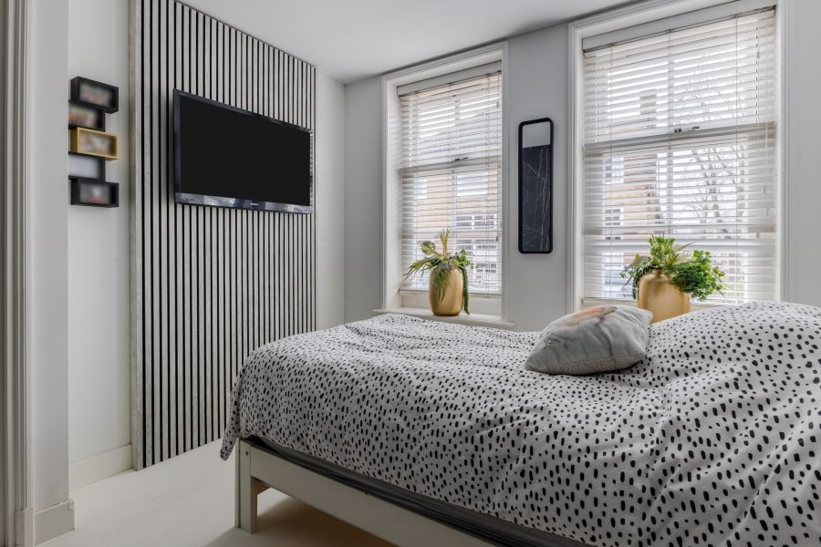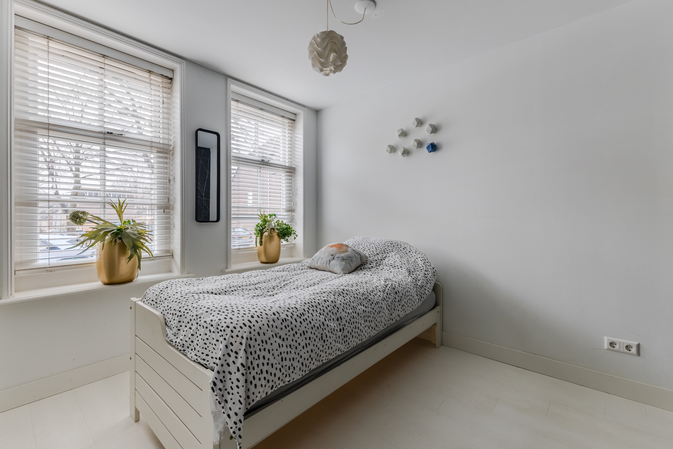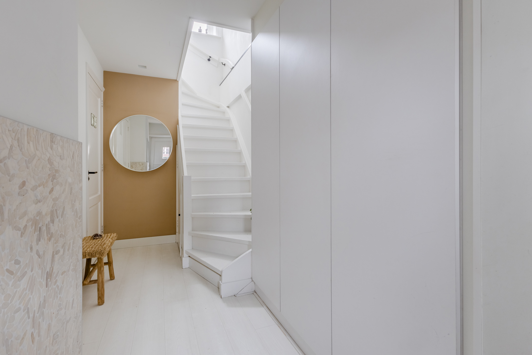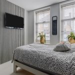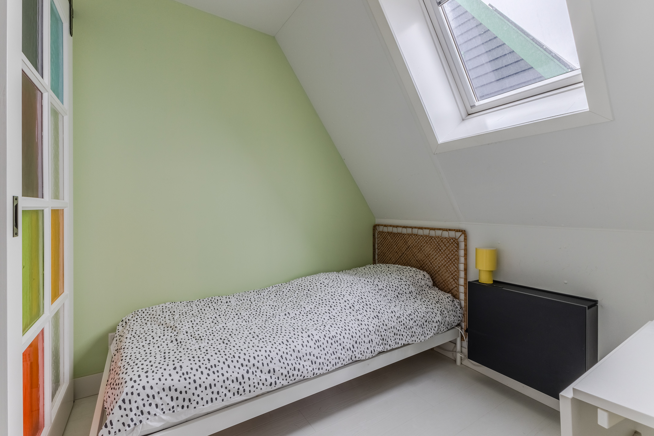 Behind the front door is a spacious, neatly finished entrance hall. From here you have access to the meter cupboard, storage cupboards, the stairs to the upper floor, the first bedroom and the bathroom. The bedroom is spacious and modernly furnished with beautiful flooring and sleek walls. Two large windows provide pleasant natural light. This room is equipped with a black built-in wardrobe.