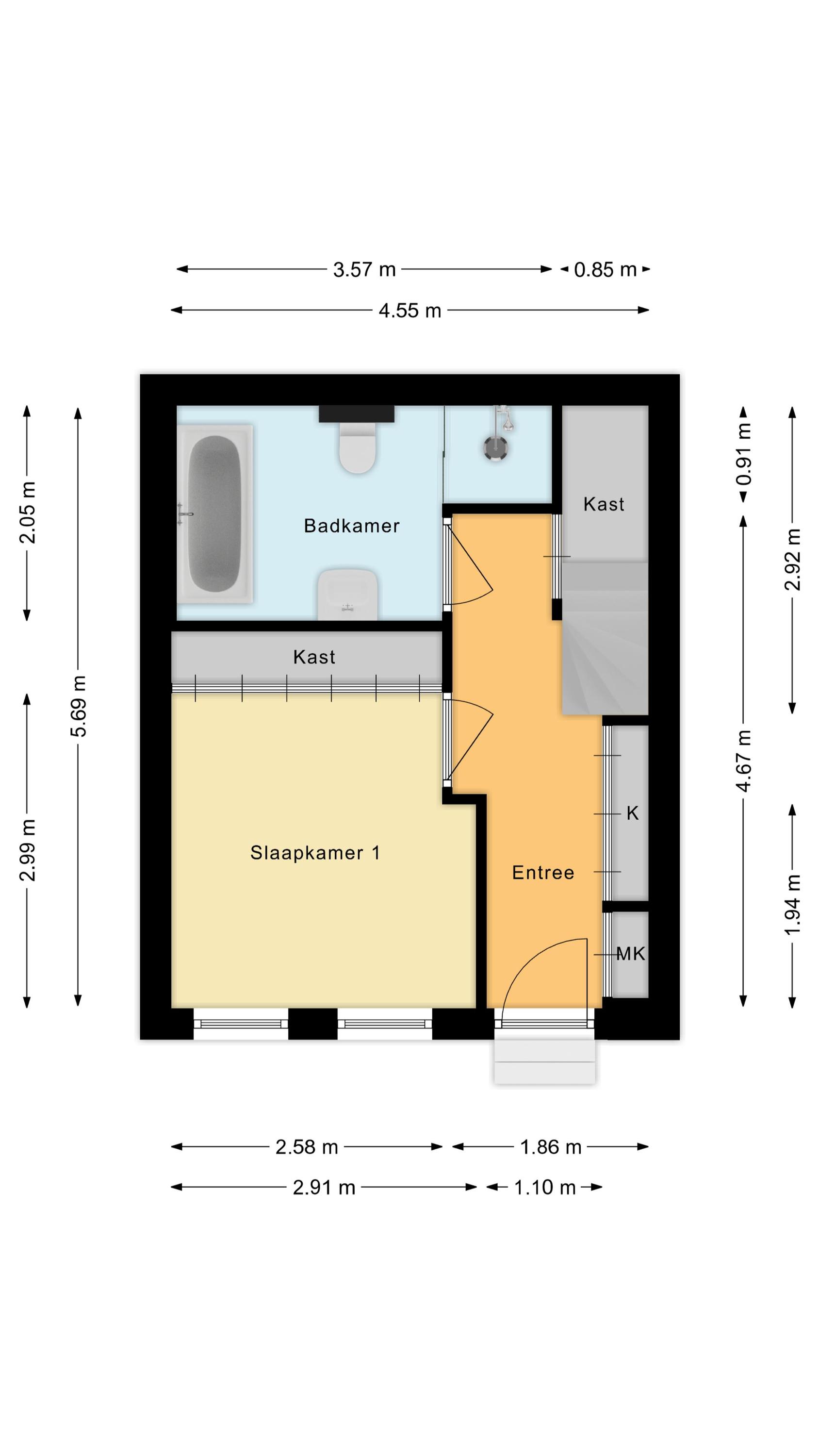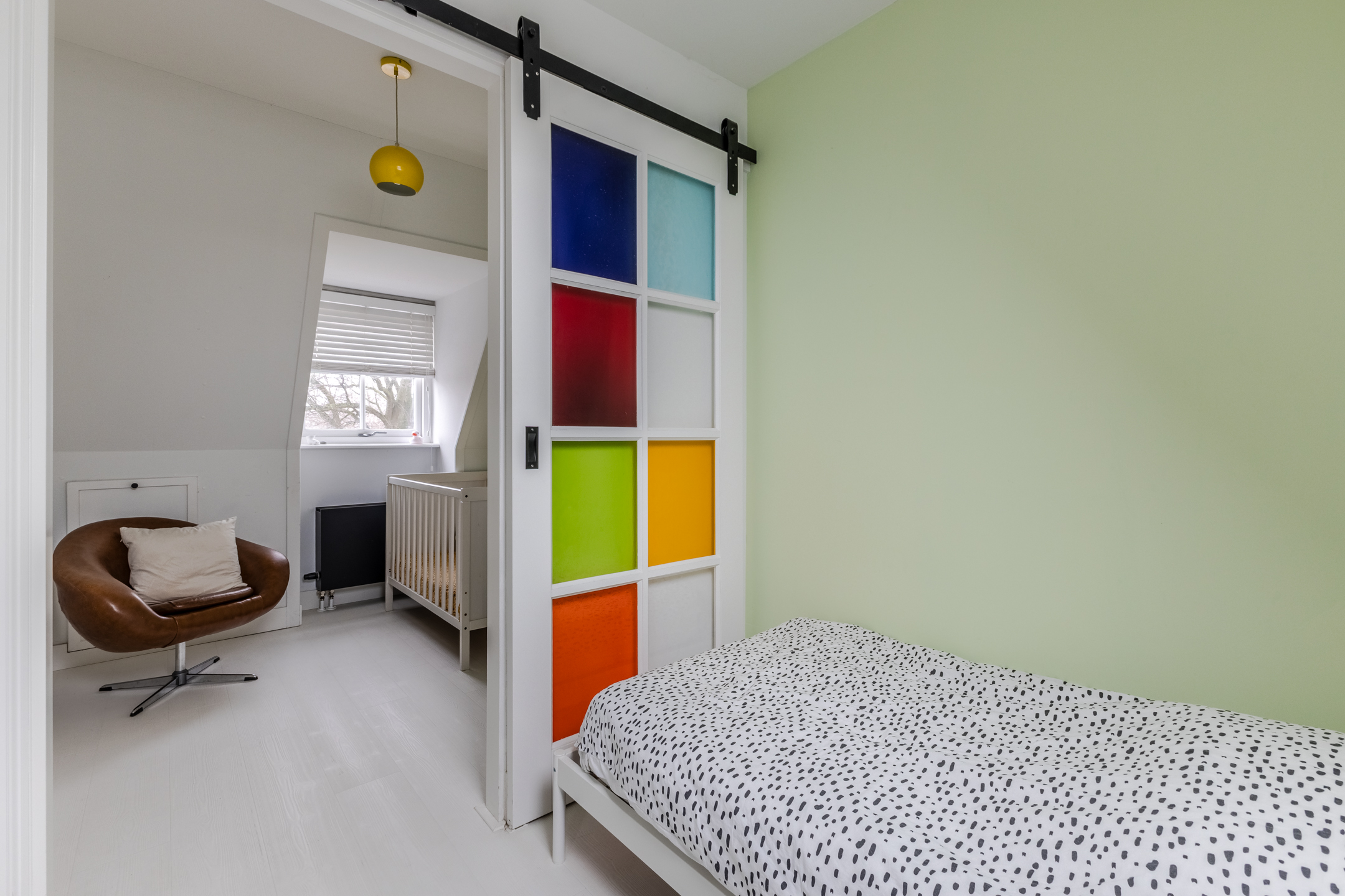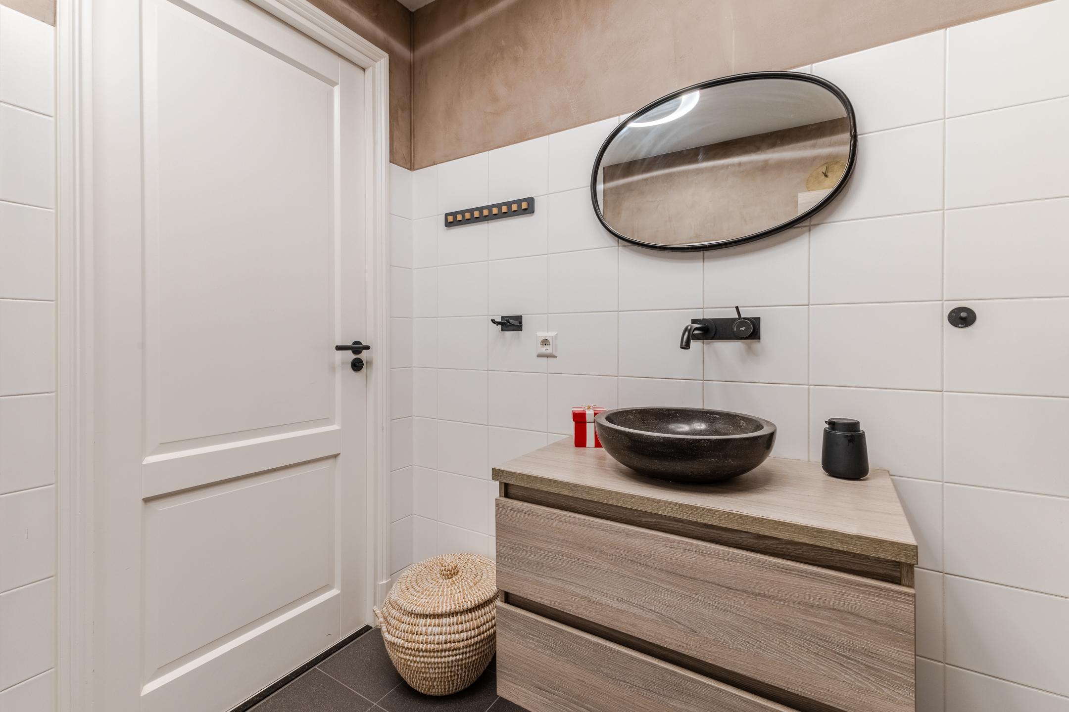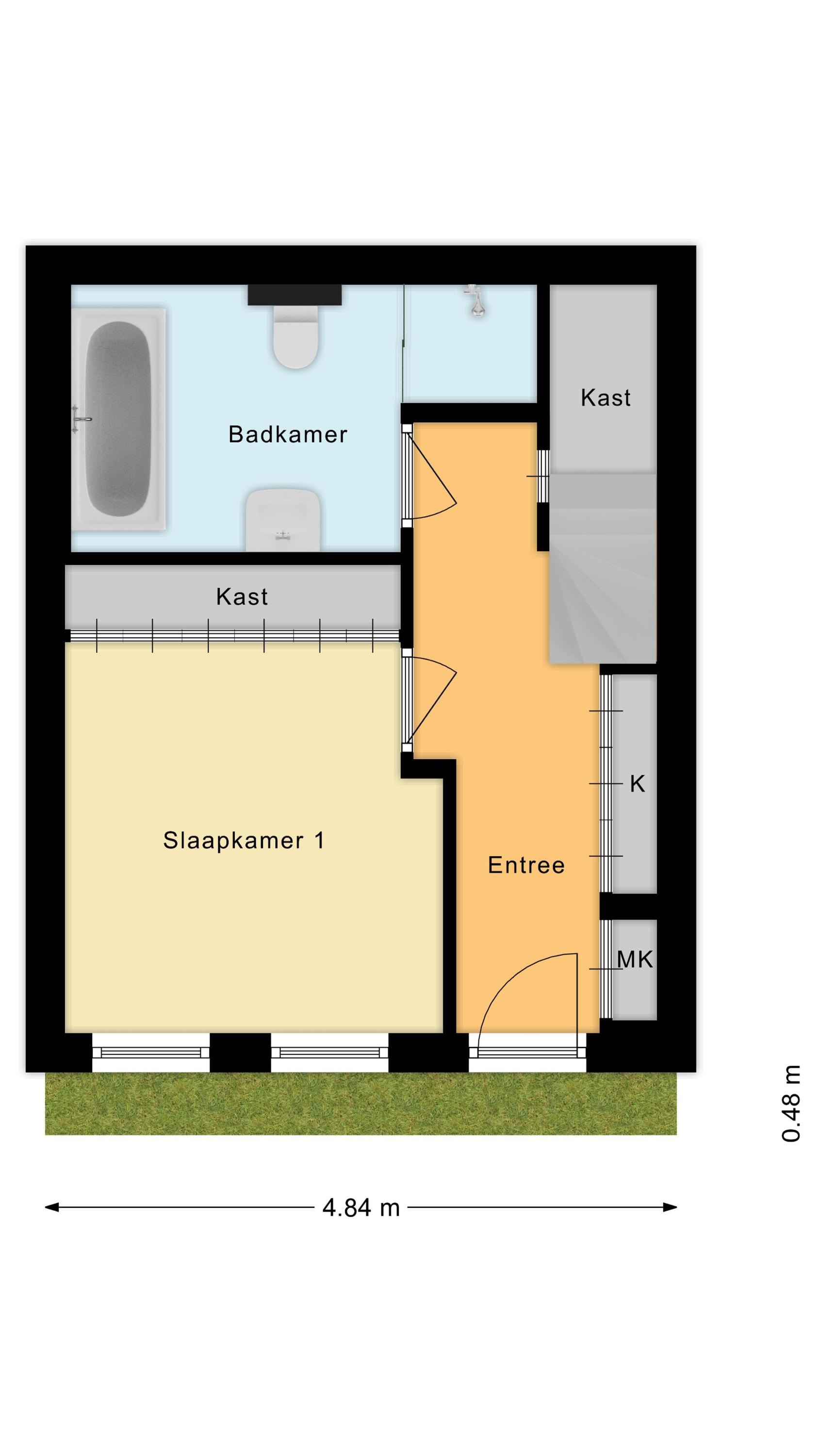 Behind the front door is a spacious, neatly finished entrance hall. From here you have access to the meter cupboard, storage cupboards, the stairs to the upper floor, the first bedroom and the bathroom. The bedroom is spacious and modernly furnished with beautiful flooring and sleek walls. Two large windows provide pleasant natural light. This room is equipped with a black built-in wardrobe.