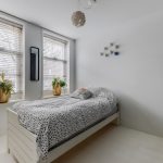 Achter de voordeur bevindt zich een ruime, netjes afgewerkte entreehal. Vanuit hier heb je toegang tot de meterkast, bergkasten, de trap naar boven, de eerste slaapkamer en de badkamer. De slaapkamer is ruim van formaat en modern ingericht met een fraaie vloer en strakke wanden. Twee grote ramen zorgen hier voor een prettige lichtinval. De kamer is uitgerust met een zwarte inbouwkast.