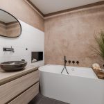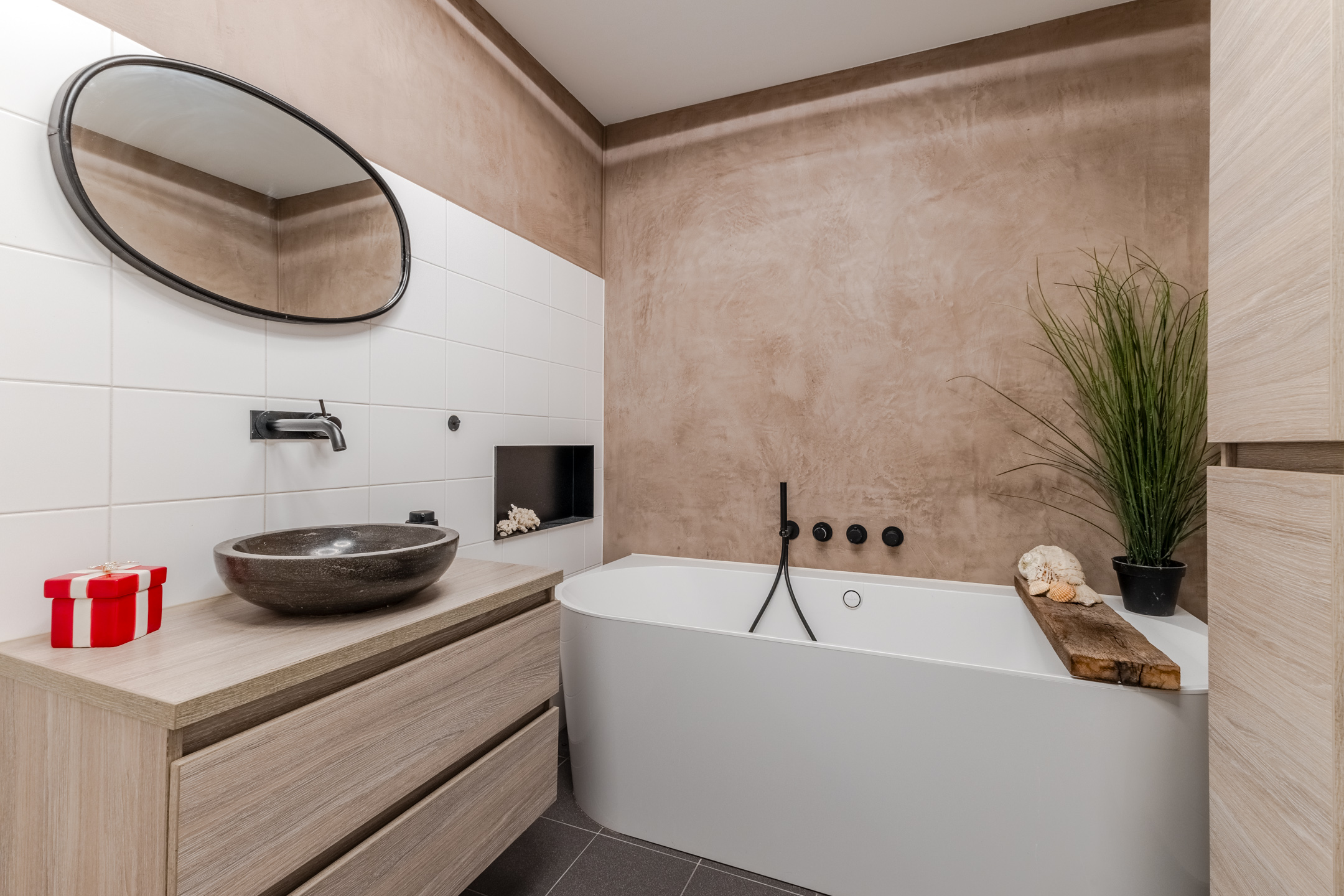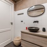 De ruime badkamer is prachtig betegeld en straalt volop luxe uit. Deze ruimte is voorzien van een zwevend toilet, een badmeubel met waskom, ligbad, een wandkast en een douchecabine met regendouche.
