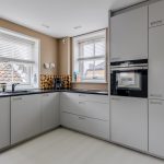 The kitchen is a corner unit and has a sleek design with gray cabinets and a black countertop. It is equipped with the following appliances: dishwasher, induction stove with integrated extractor, oven, refrigerator and freezer.