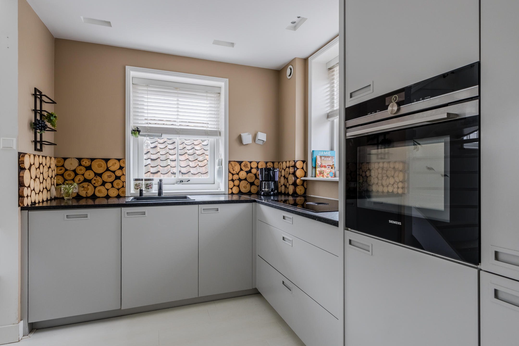 De keuken is uitgevoerd in een hoekopstelling en heeft een strak design met grijze kastjes en een zwart werkblad. Hier tref je de volgende apparatuur aan: vaatwasser, inductie fornuis met geïntegreerde afzuiging, oven, koelkast en vriezer.