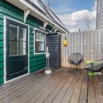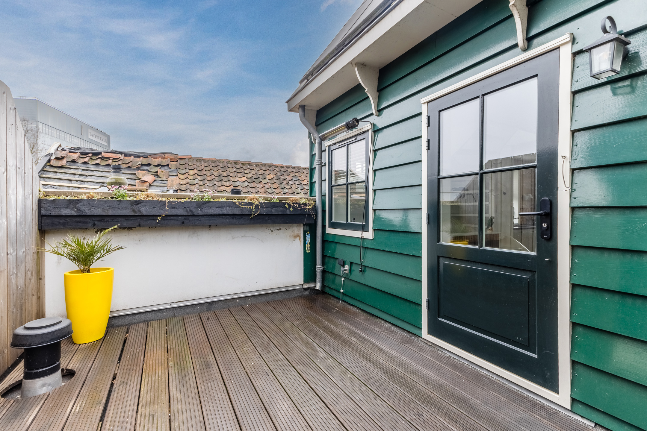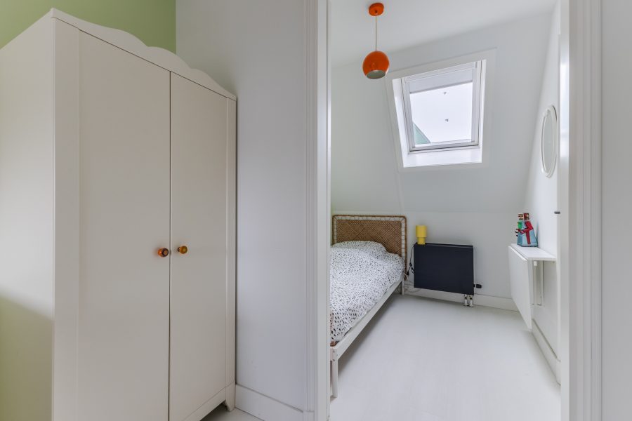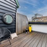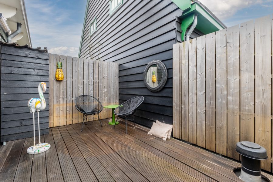 At the back of the living room, a door opens onto the roof terrace. The terrace faces east and is nicely laid out with wooden decking. There is enough space for a cozy seating area, so you can enjoy the sunshine to the fullest. The roof terrace is also well sheltered, giving you plenty of privacy.