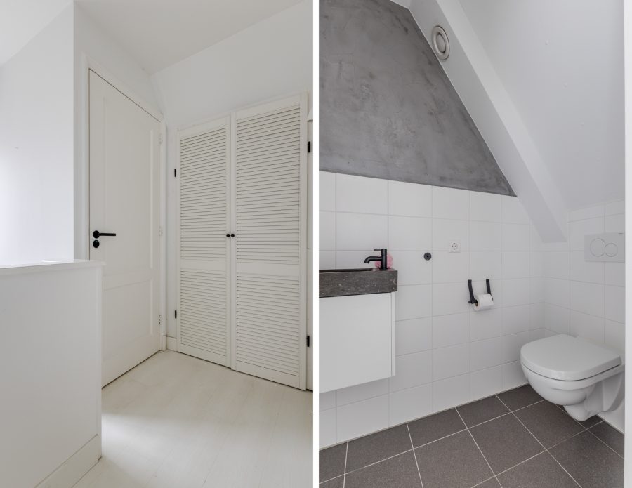 Een vaste trap geeft toegang tot de tweede verdieping. Hier vind je de tweede en derde slaapkamer, een toiletruimte met zwevend toilet en fonteintje en handige bergkasten.
