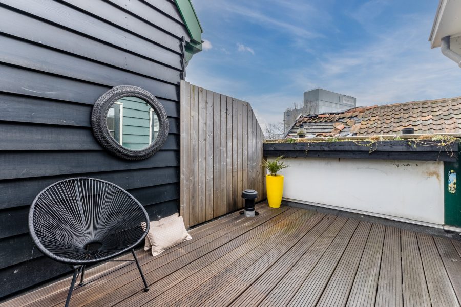 Aan de achterzijde van de woonkamer geeft een openslaande deur toegang tot het dakterras. Het terras ligt op het oosten en is netjes aangelegd met houten vlonderplanken. Er is genoeg ruimte voor een gezellig zitje, zodat je optimaal van het zonnetje kunt genieten. Het dakterras is bovendien goed beschut, waardoor je veel privacy hebt.
