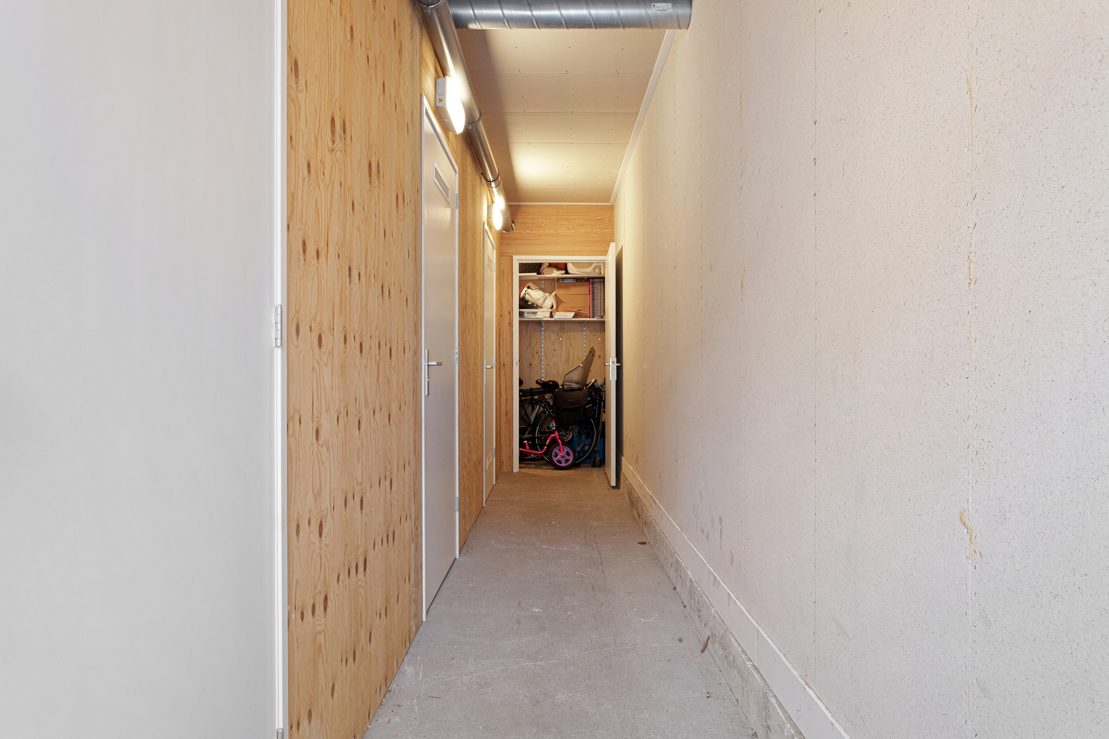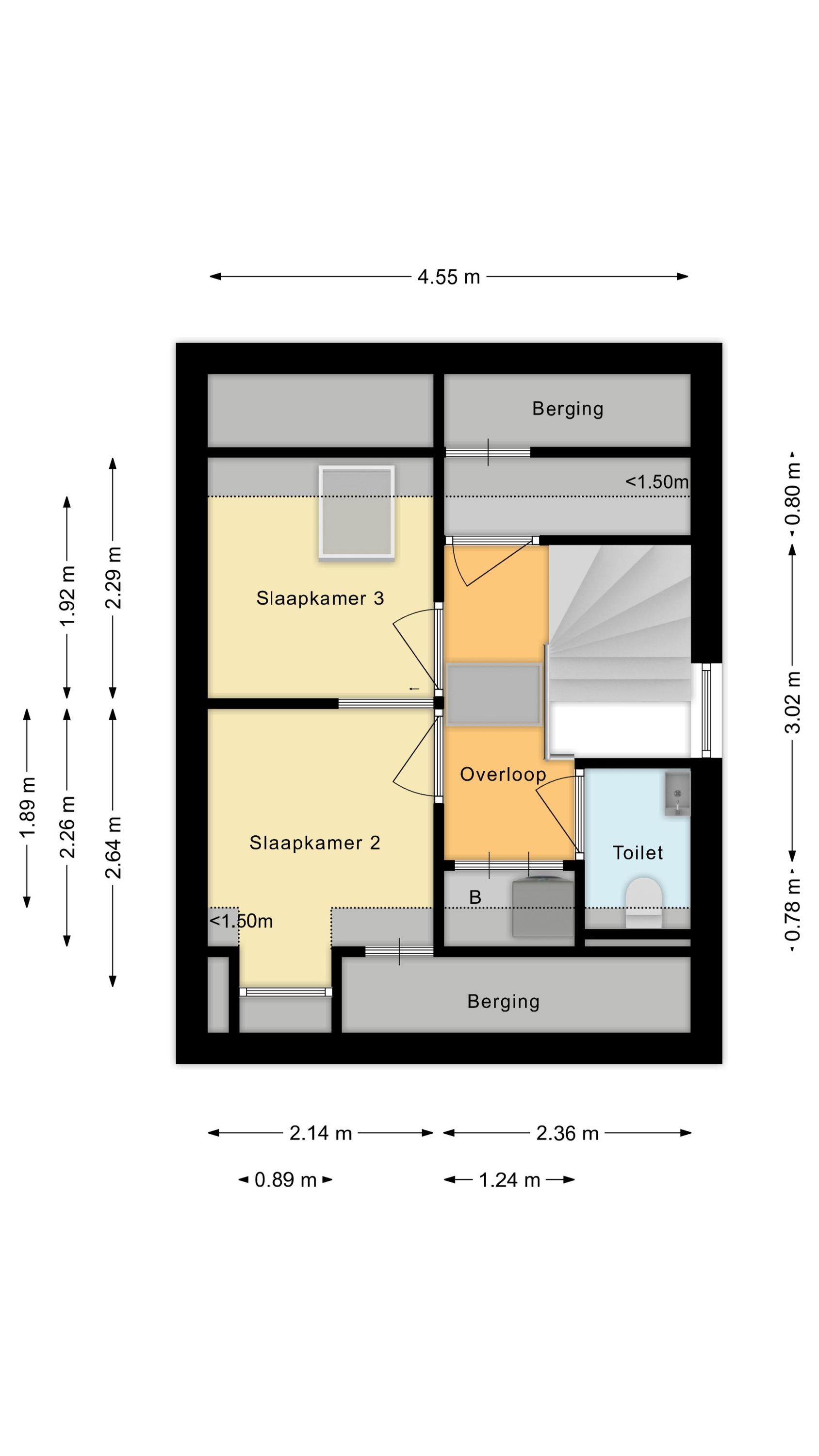 A fixed staircase provides access to the second floor. Here you will find the second and third bedrooms, a toilet room with a floating toilet and washbasin, and handy storage cupboards.