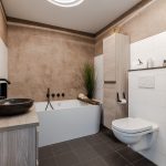 • Spacious bathroom with toilet, sink, bathtub and shower cabin