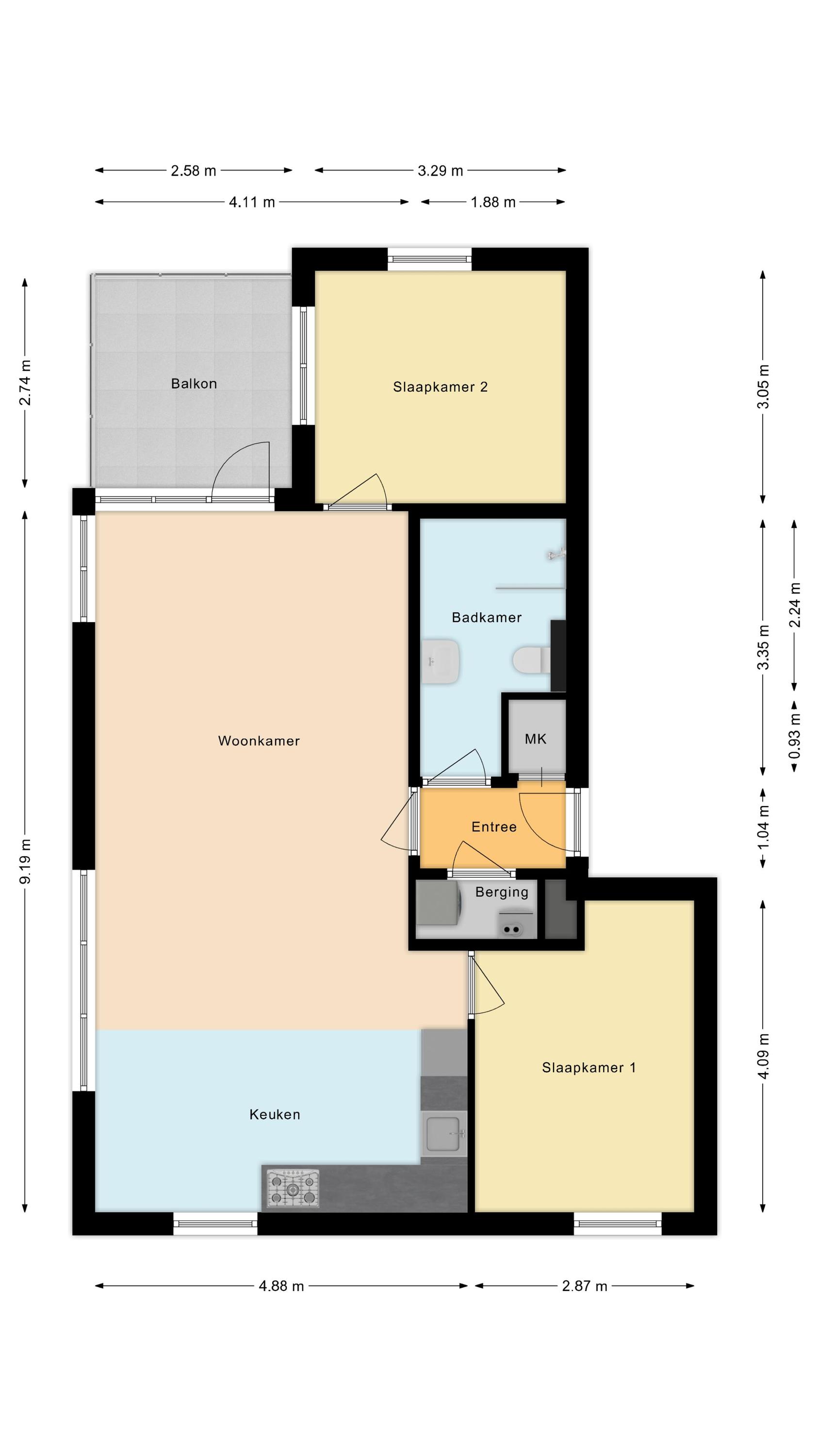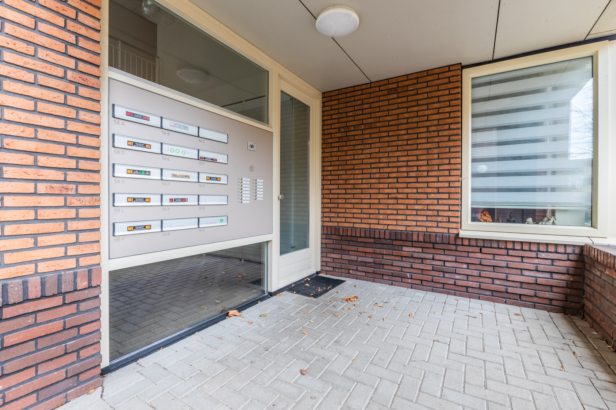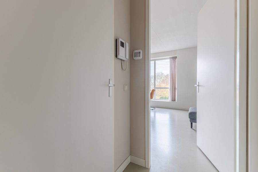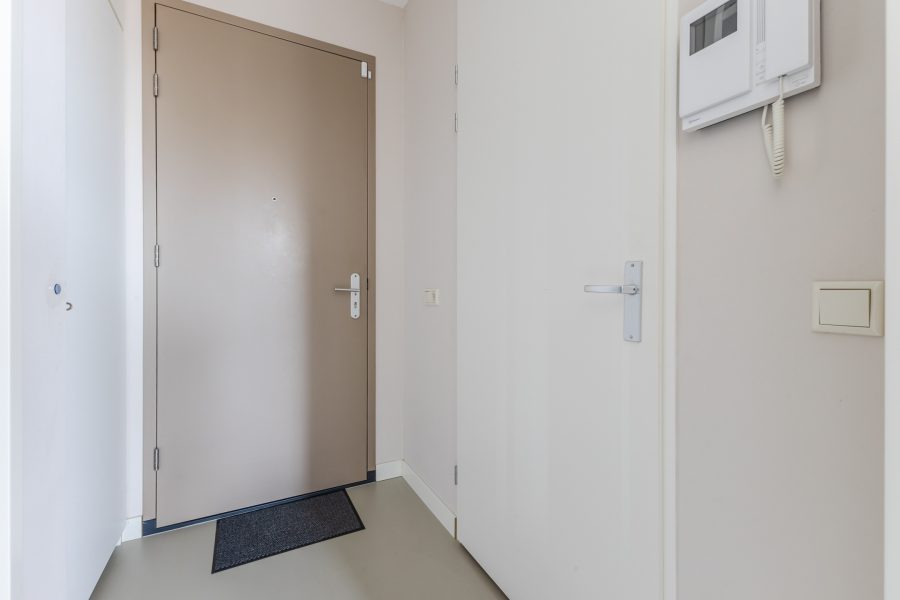 Na binnenkomst in het appartement beland je eerst in een kleine entreehal. Vanuit hier heb je toegang tot de meterkast, een berging met daarin de wasmachine- en drogeraansluitingen, de badkamer en de woonkamer.