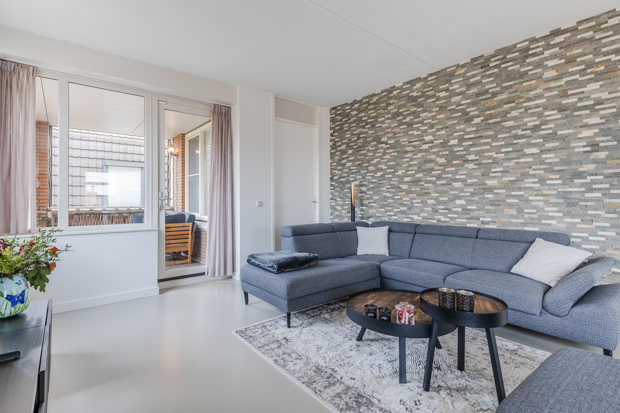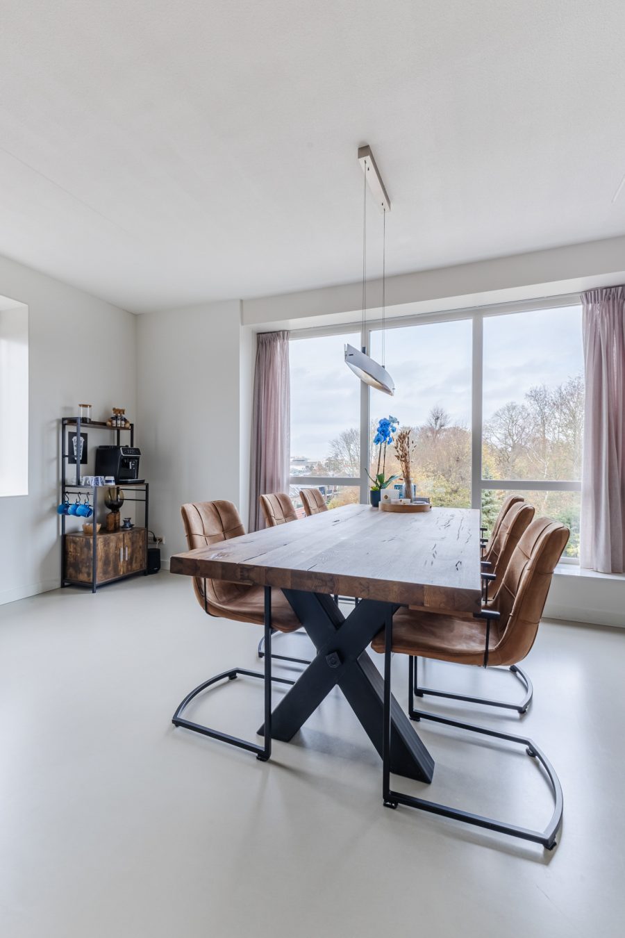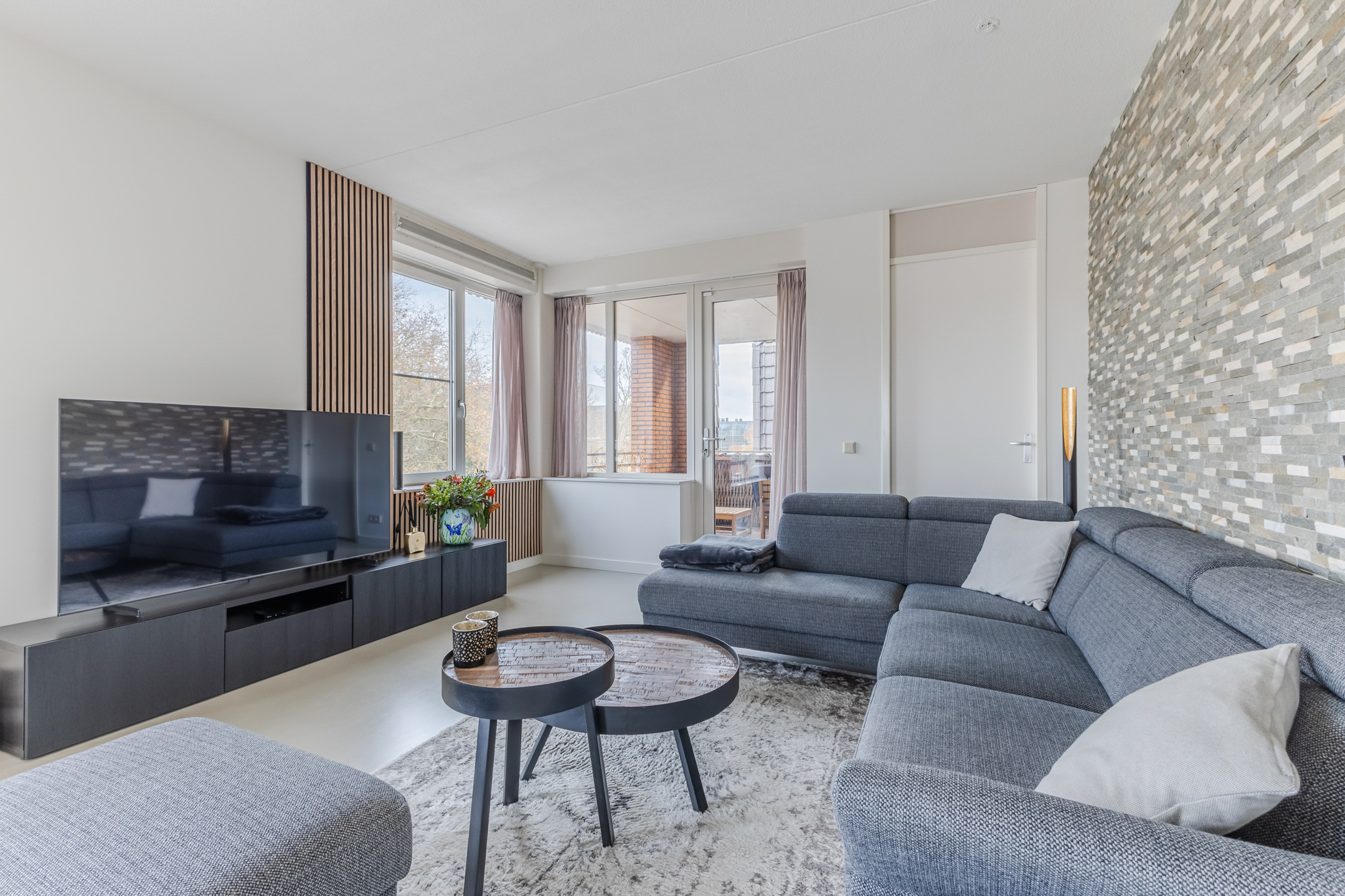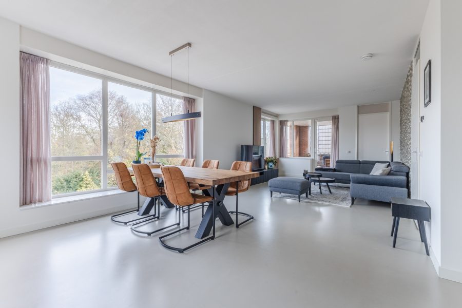 De sfeervolle en ruime woonkamer vormt het hart van het appartement. Hier is gekozen voor een nette vloer en zijn de wanden fraai afgewerkt. Dankzij de aanwezigheid van meerdere grote raampartijen geniet de woonkamer van een overvloed aan natuurlijk licht. Vanuit hier kijk je prachtig uit op de groene omgeving. De woonkamer heeft een openslaande deur naar het overdekte balkon. Het balkon is ruim van formaat en netjes aangelegd. Hier is genoeg ruimte om een fijne loungeplek in te richten. Op het balkon geniet je ultiem van het lekkere weer en een fraai uitzicht op de omgeving.