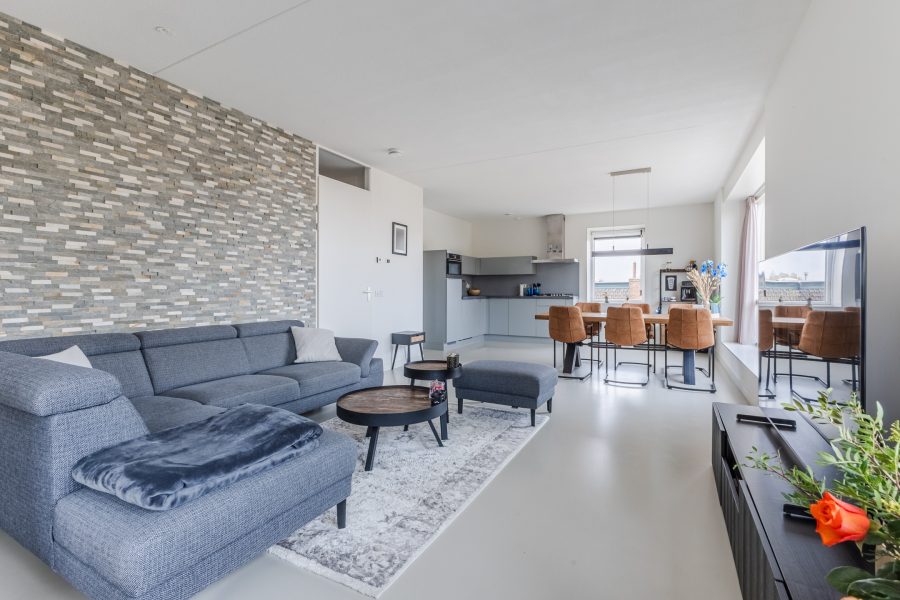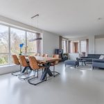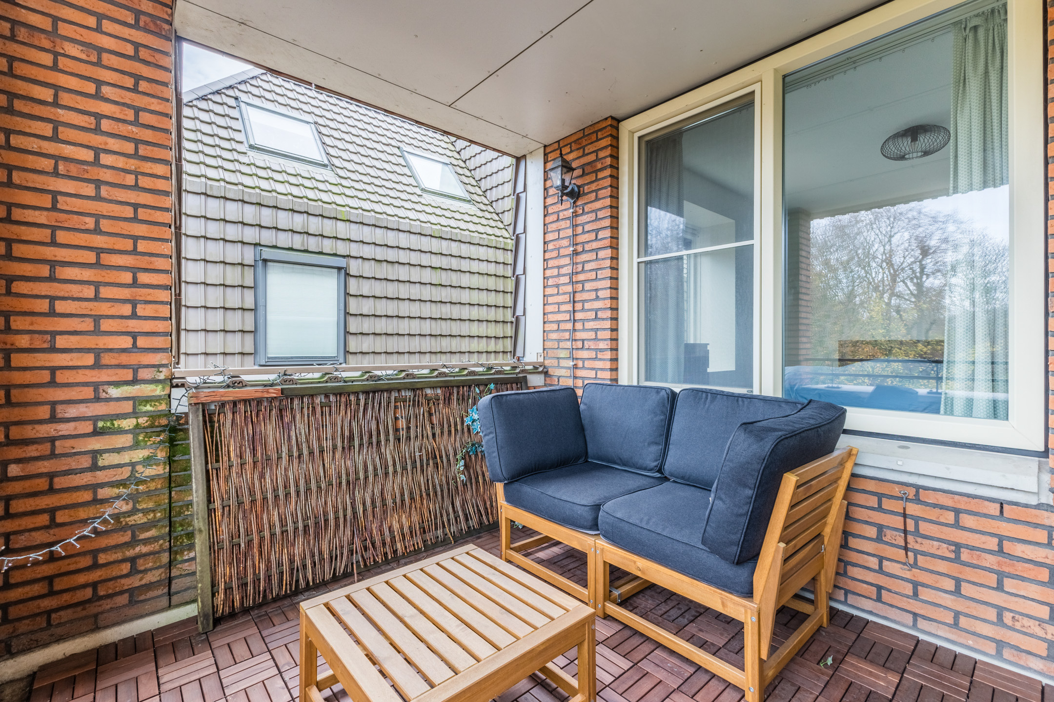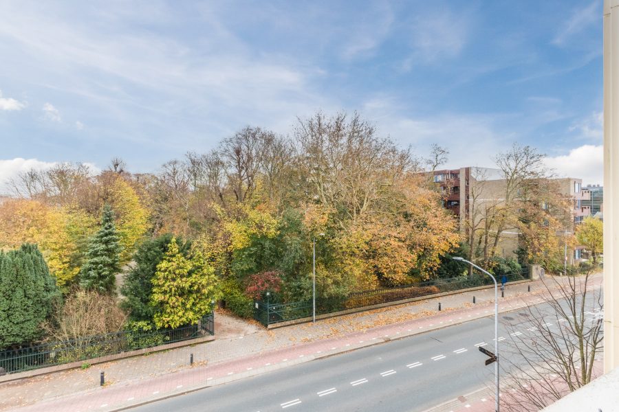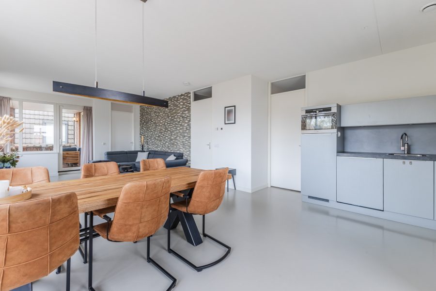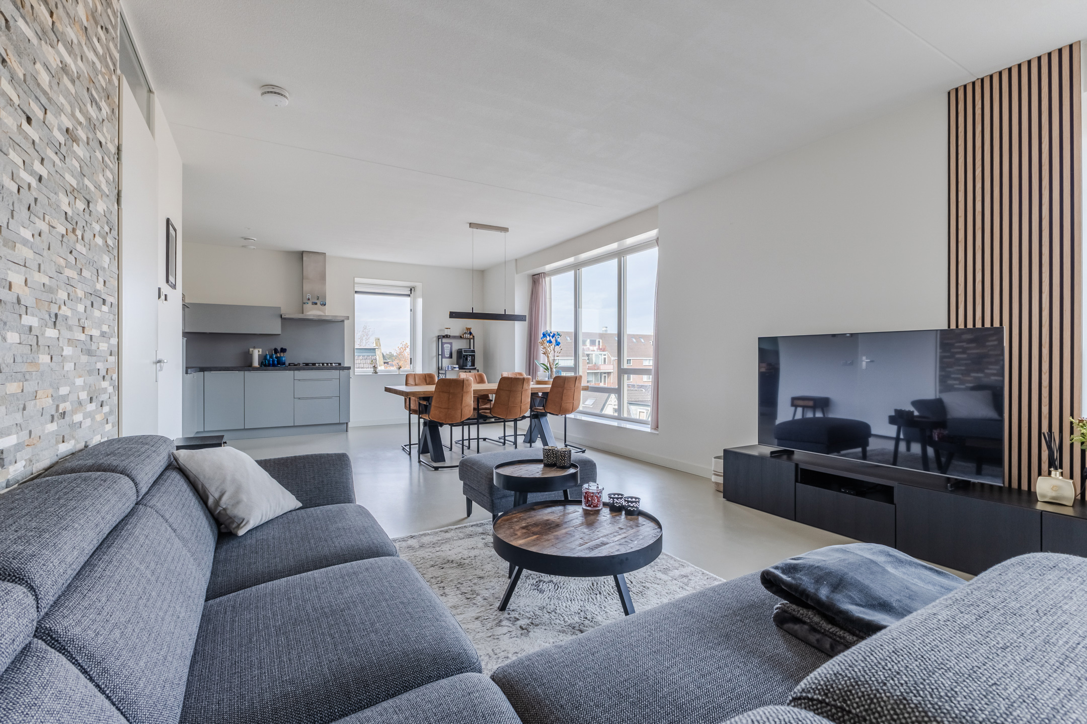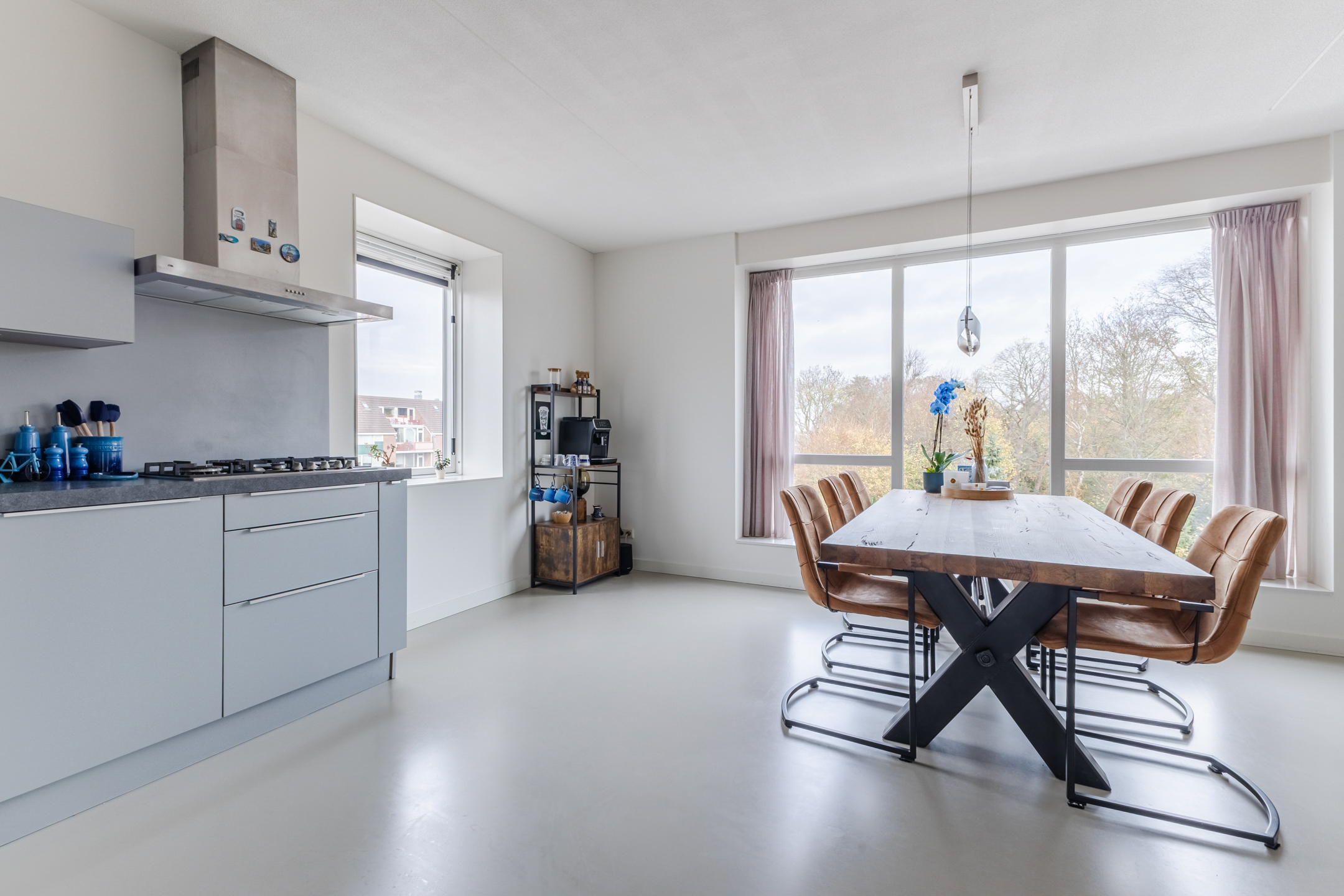 De sfeervolle en ruime woonkamer vormt het hart van het appartement. Hier is gekozen voor een nette vloer en zijn de wanden fraai afgewerkt. Dankzij de aanwezigheid van meerdere grote raampartijen geniet de woonkamer van een overvloed aan natuurlijk licht. Vanuit hier kijk je prachtig uit op de groene omgeving. De woonkamer heeft een openslaande deur naar het overdekte balkon. Het balkon is ruim van formaat en netjes aangelegd. Hier is genoeg ruimte om een fijne loungeplek in te richten. Op het balkon geniet je ultiem van het lekkere weer en een fraai uitzicht op de omgeving.