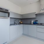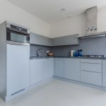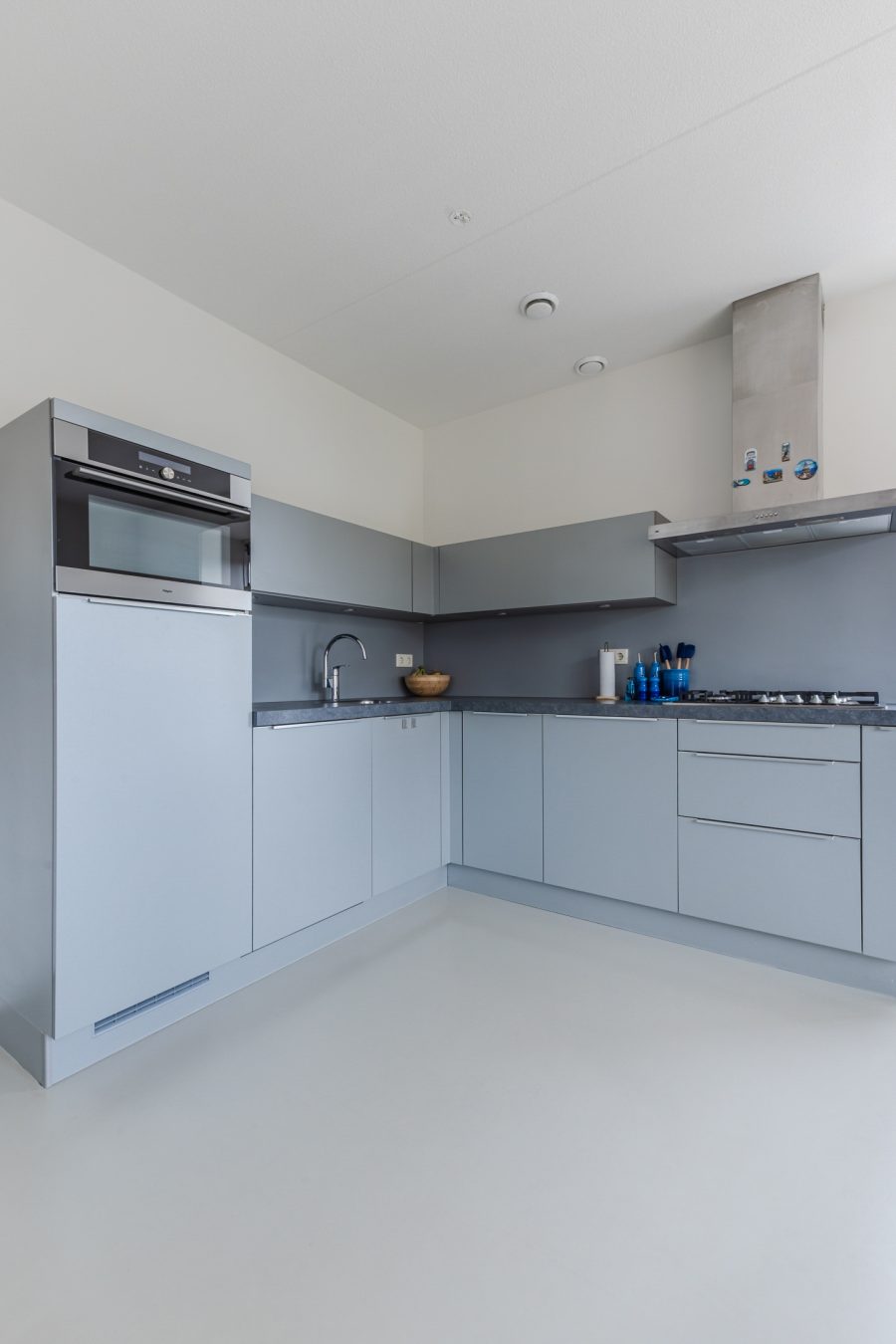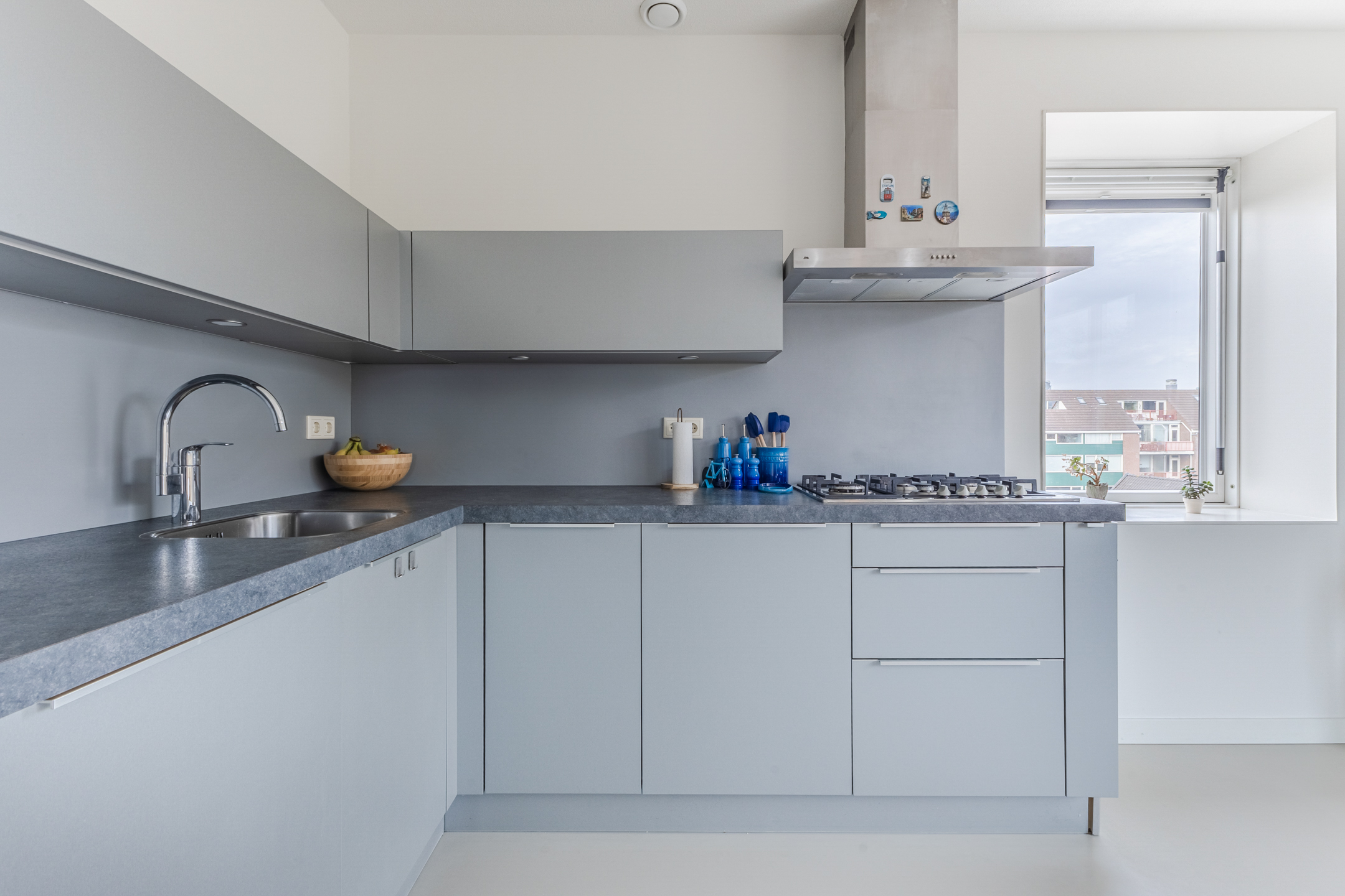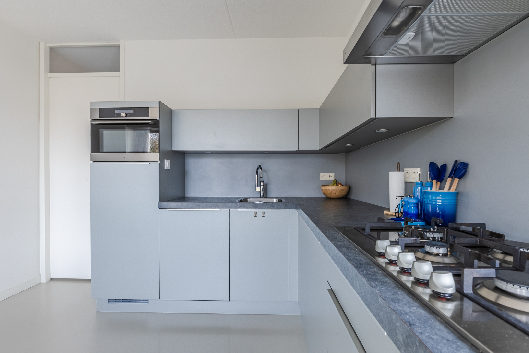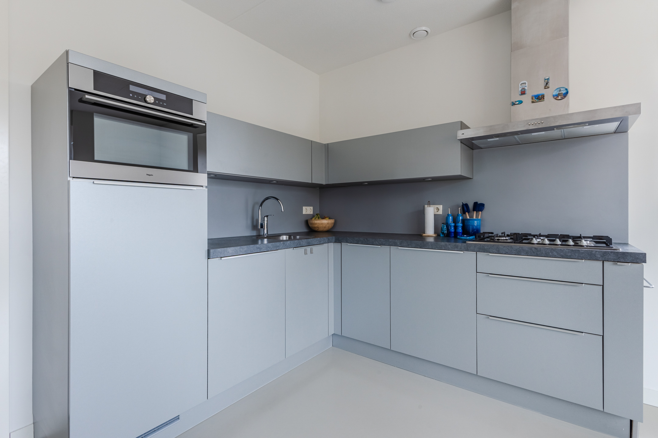 De open keuken staat in een hoekopstelling en heeft een mooi design met grijsblauwe keukenkastjes en een donker werkblad. Hier tref je een vaatwasser (2024), gasfornuis, afzuigkap, oven en koelkast aan. Er zijn twee slaapkamers in het appartement, waarvan één aan de voorzijde en één aan de achterzijde. Beide kamers zijn ruim opgezet, netjes afgewerkt en heerlijk licht.