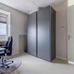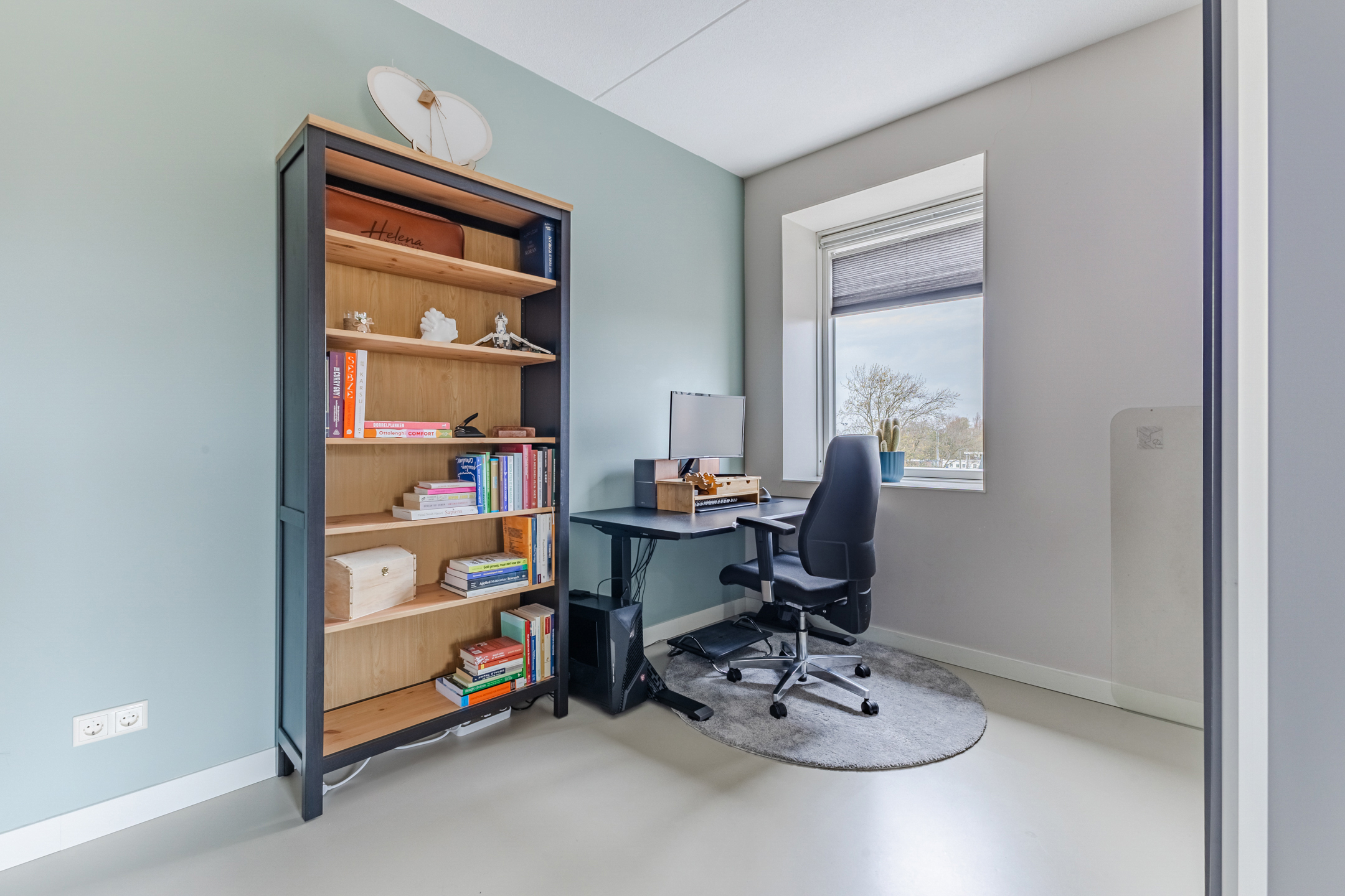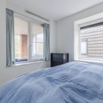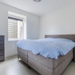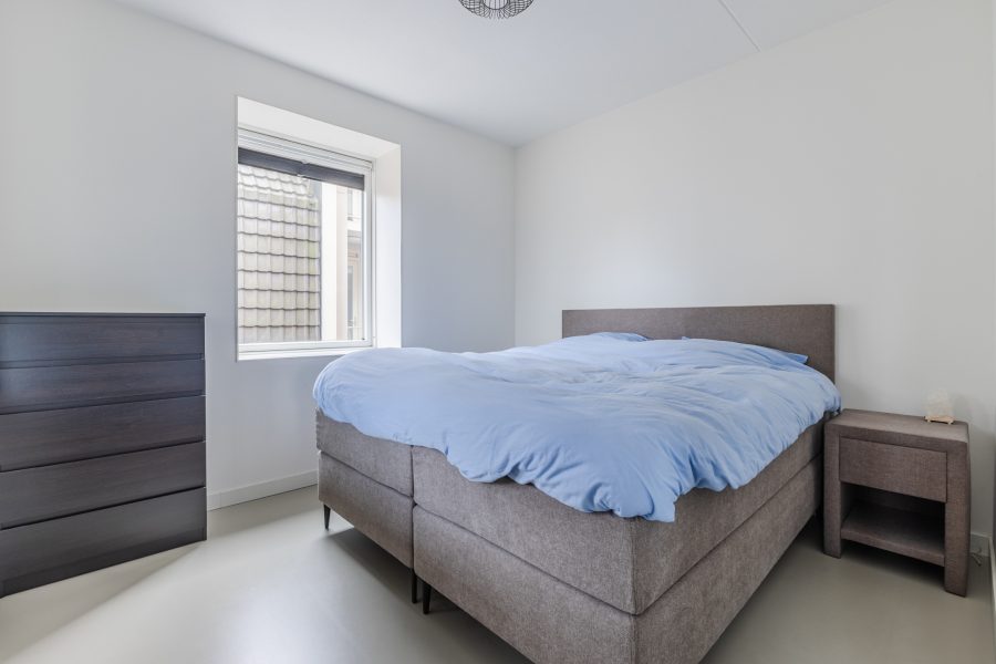 The open kitchen is in a corner unit and has a beautiful design with gray-blue kitchen cabinets and a dark countertop. Here you will find a dishwasher (2024), gas stove, extractor hood, oven and refrigerator. There are two bedrooms in the apartment, one at the front and one at the back. Both rooms are spacious, neatly finished and wonderfully light.