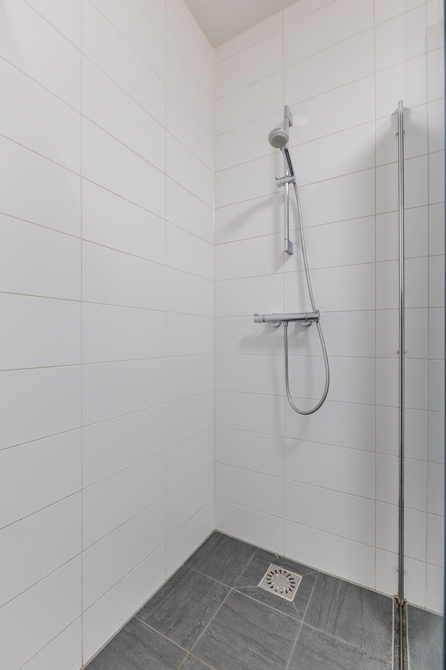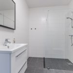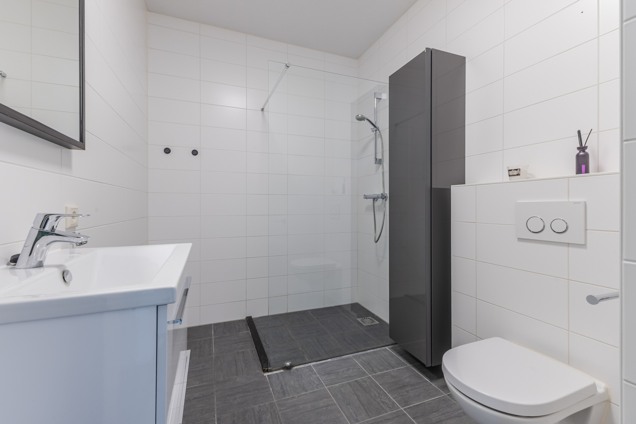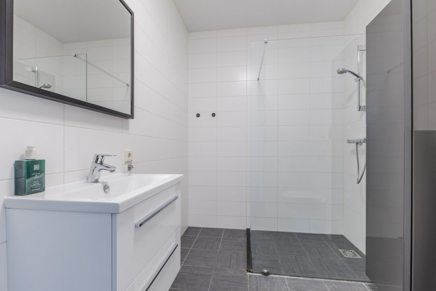 In the spacious bathroom you will find dark gray floor tiles and white wall tiles. This room is equipped with a floating toilet, vanity unit with sink and a walk-in shower.