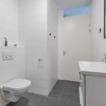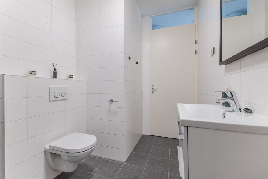 De royale badkamer is voorzien van donkergrijze vloertegels en witte wandtegels. Deze ruimte is uitgerust met een zwevend toilet, badmeubel met wastafel en een inloopdouche.