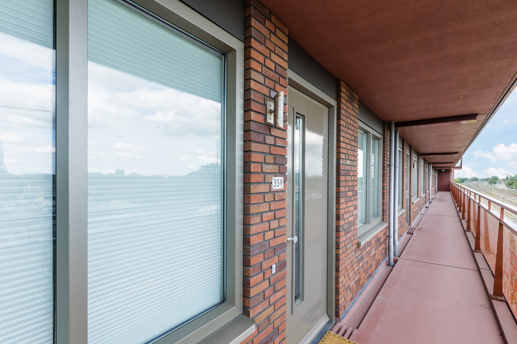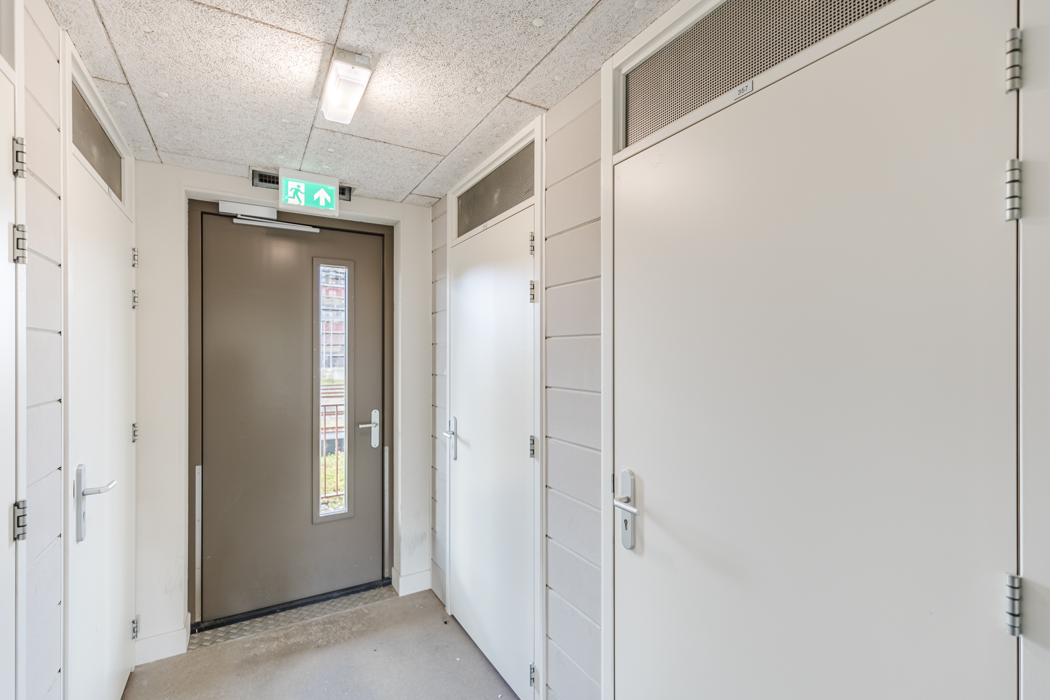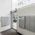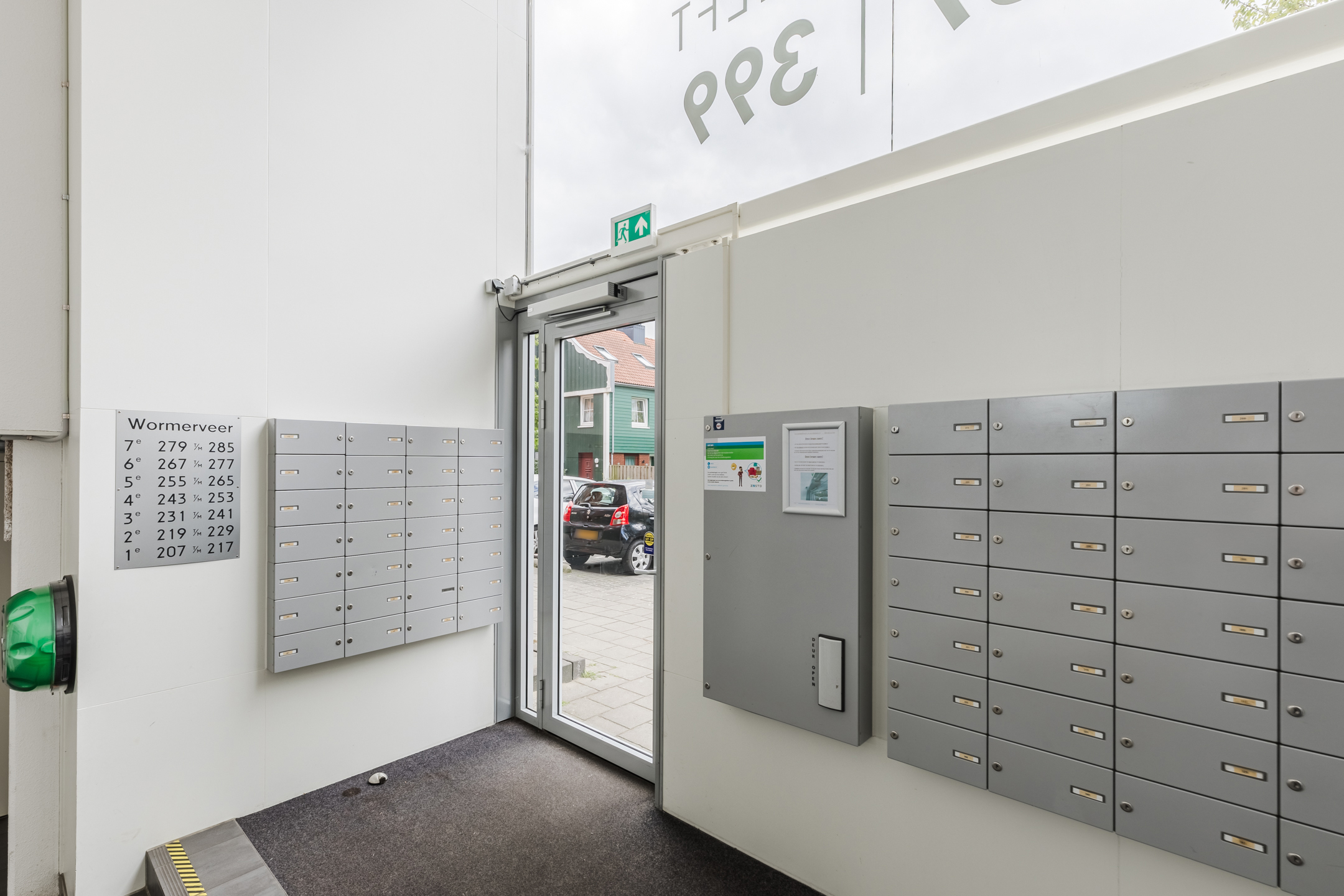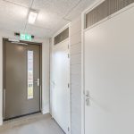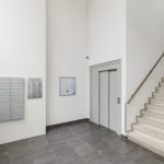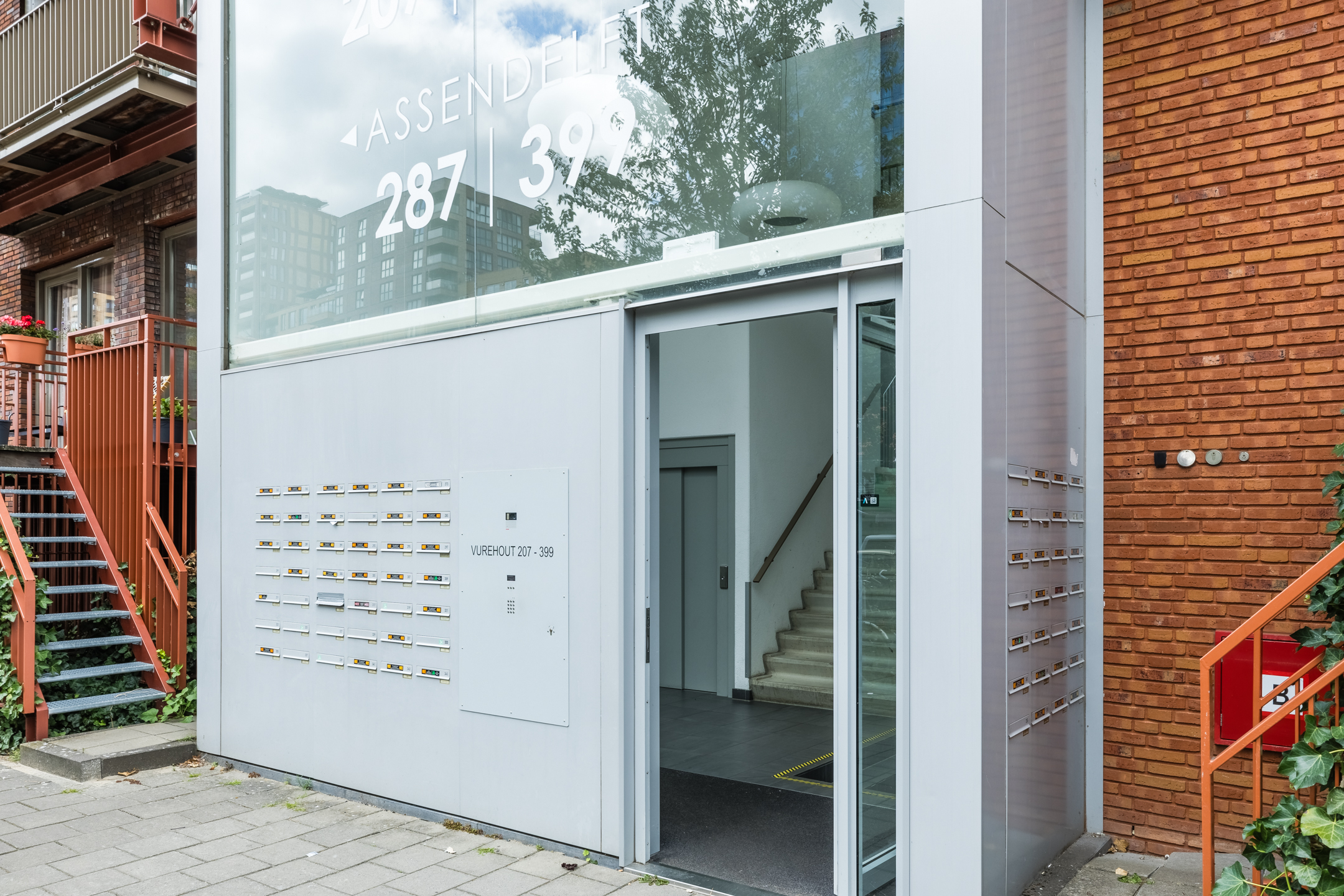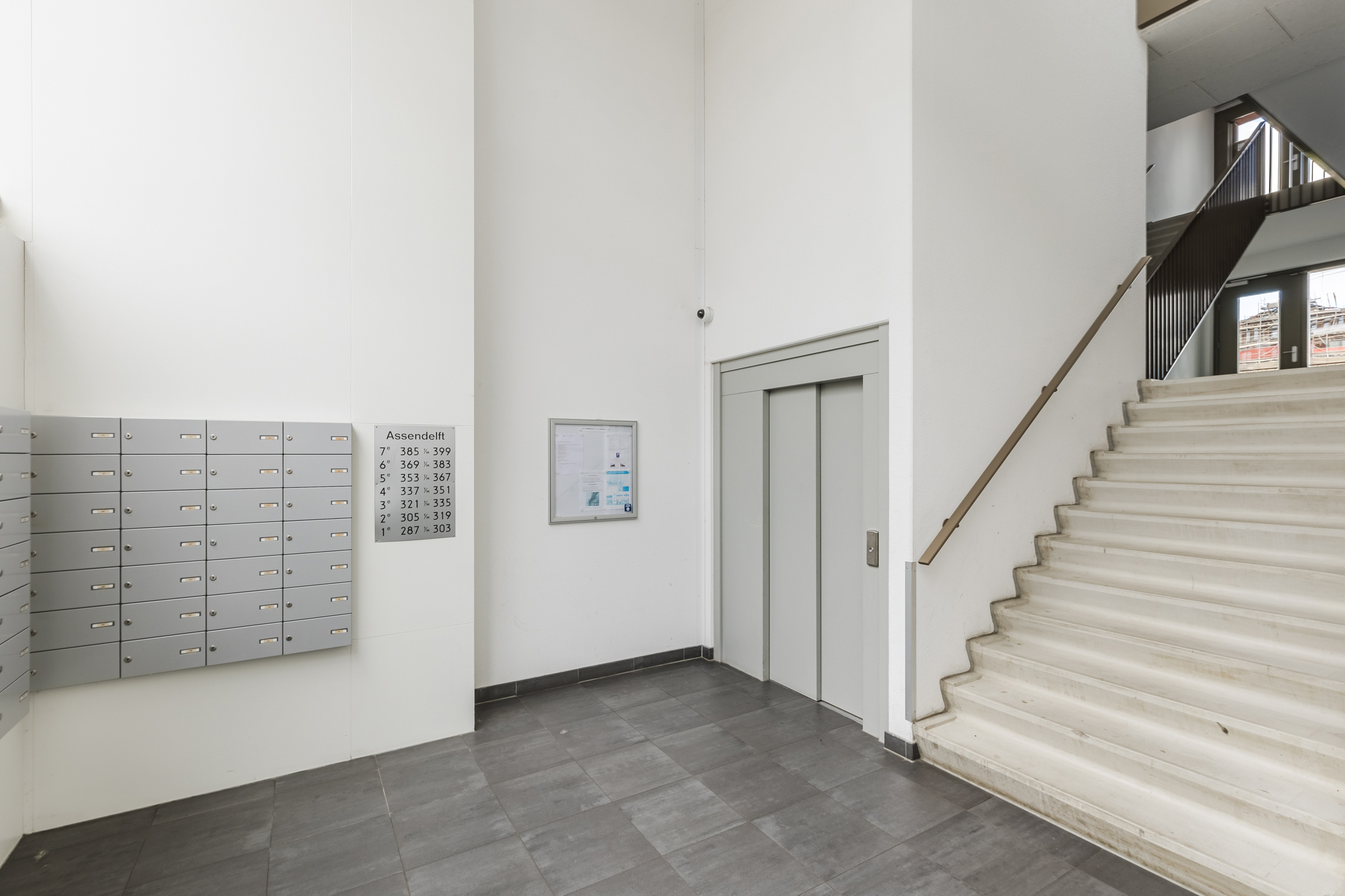 Gesloten entree met brievenbussen. Na binnenkomst beland je in een gemeenschappelijke hal met trappenhuis en lift.