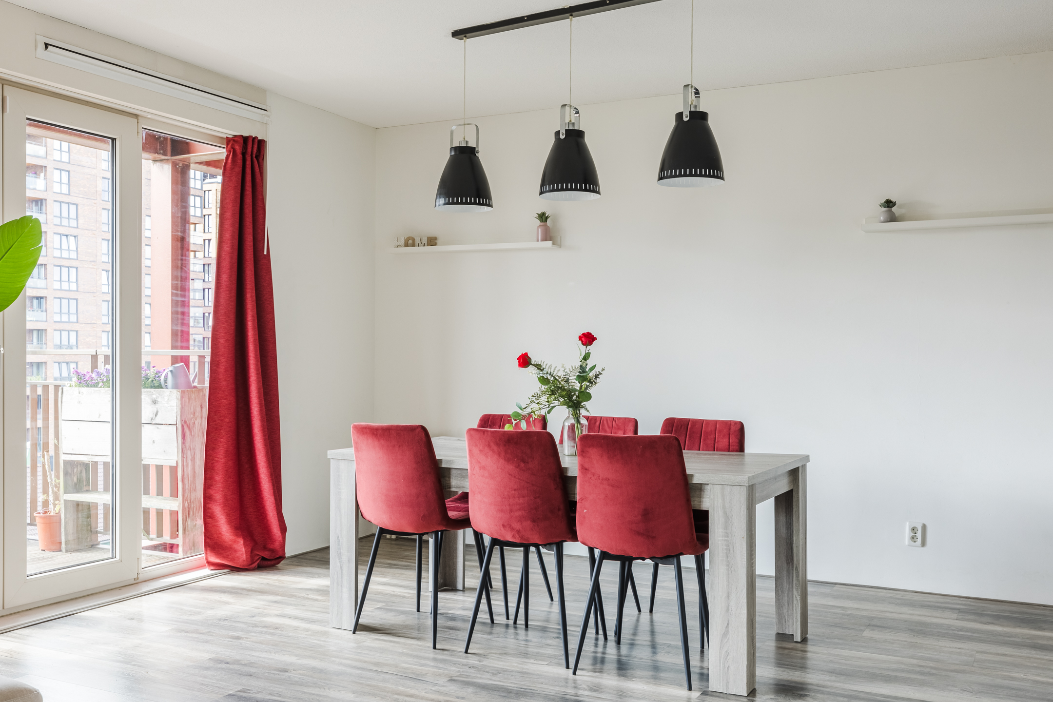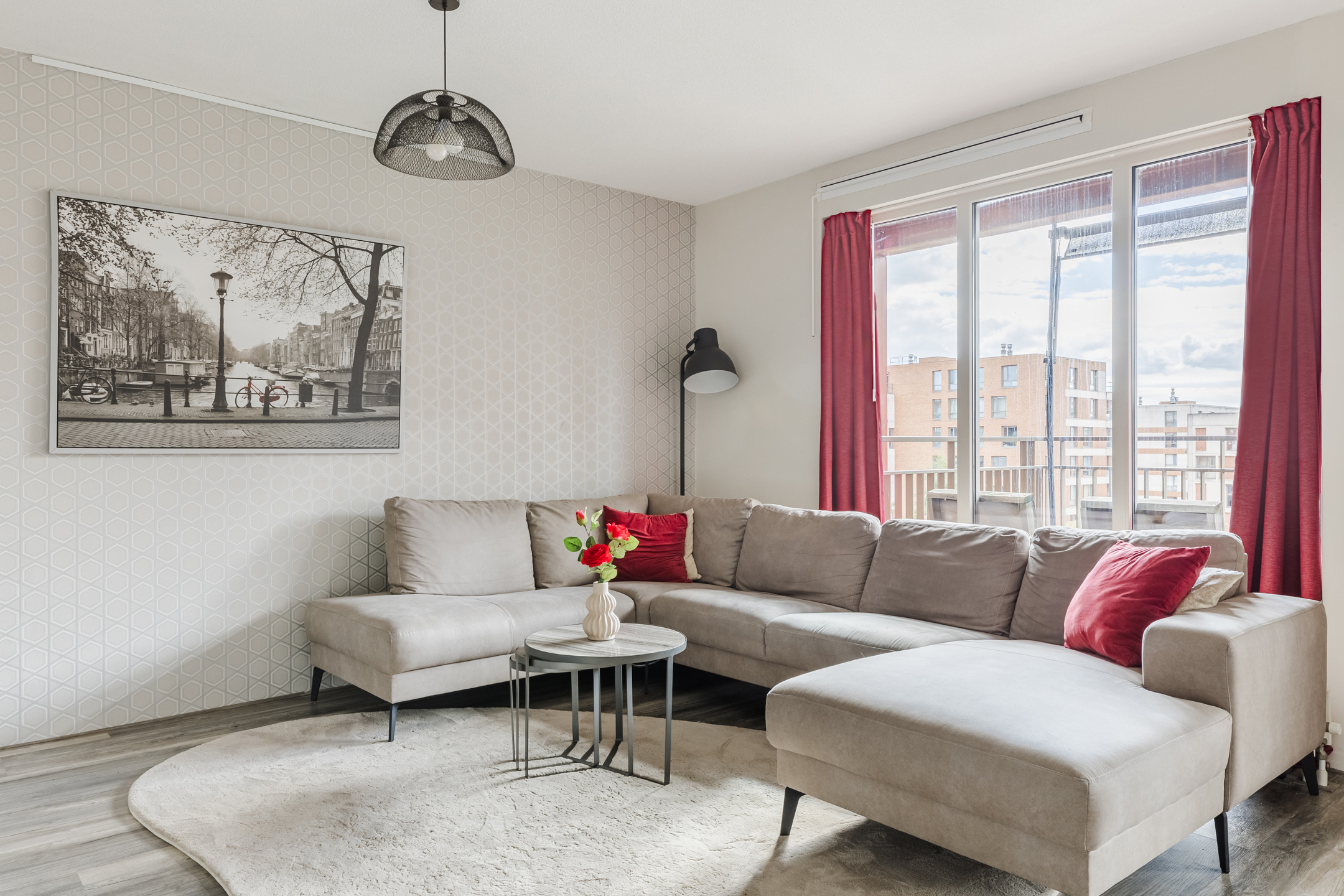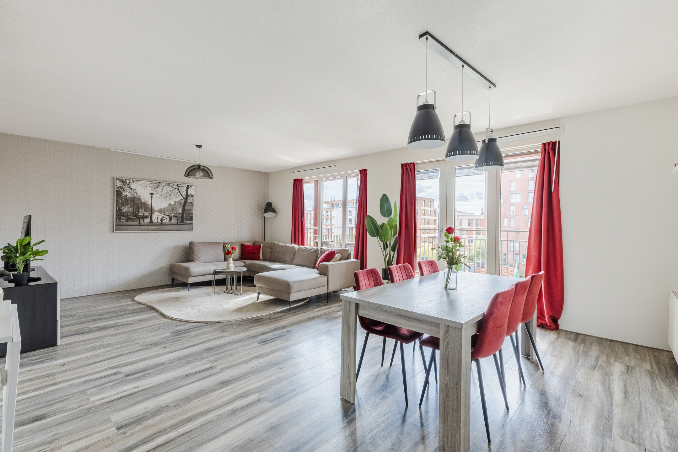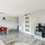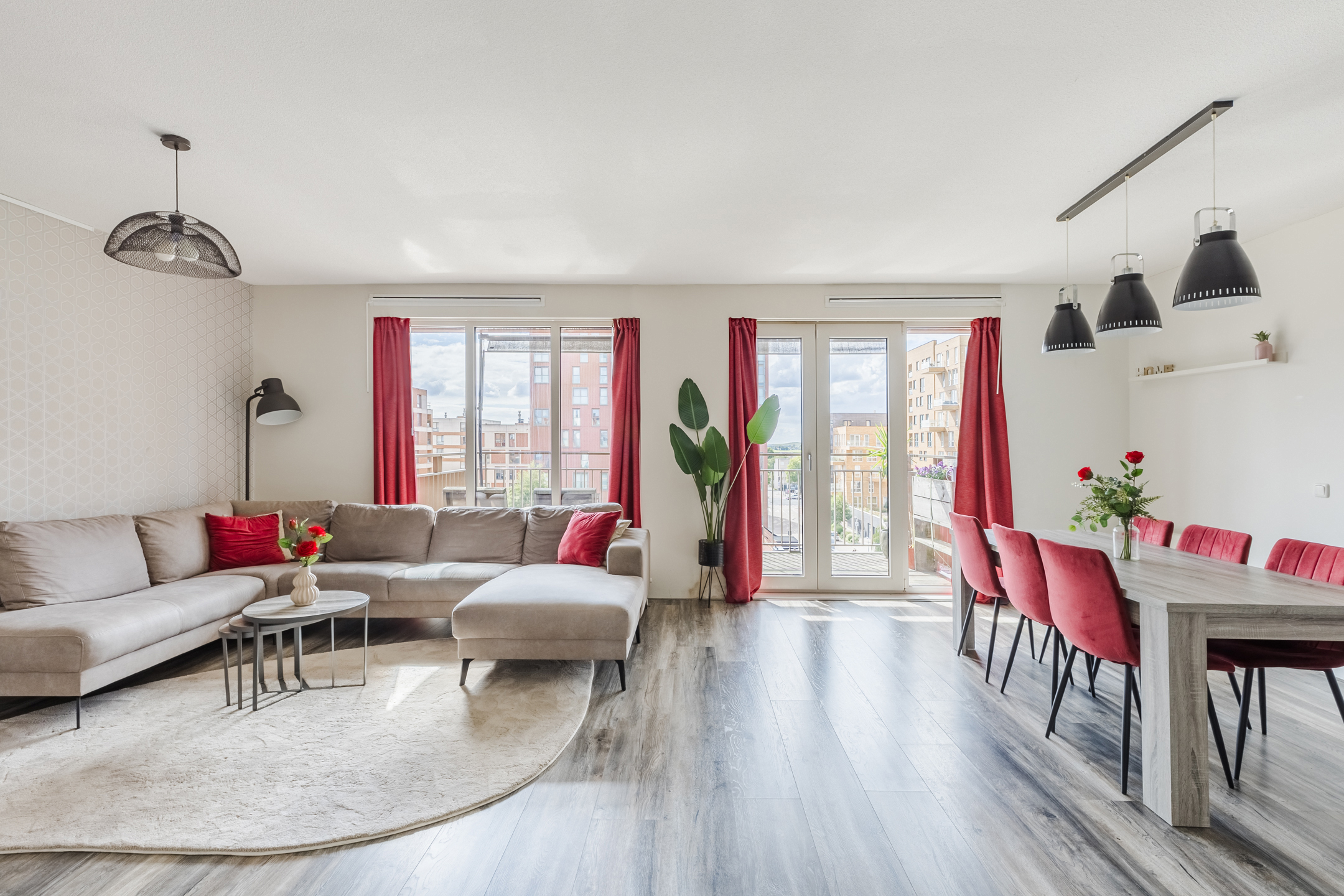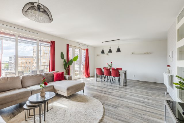 In de royale woonkamer ligt een nette laminaatvloer en zijn de wanden fraai afgewerkt in rustige en warme tinten. Dankzij het hoge raam en de openslaande balkondeuren geniet je van veel natuurlijk licht en een prettig uitzicht op de omgeving.