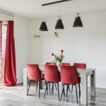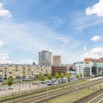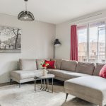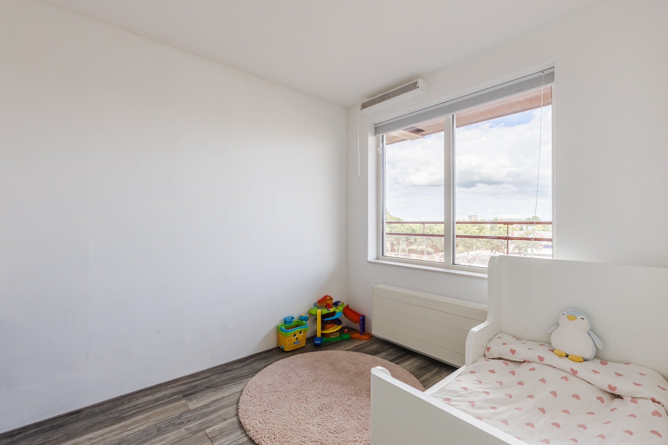 In the spacious living room, you will find neat laminate flooring. The walls are beautifully finished in calm and warm tones. Thanks to the high window and balcony doors, the living room enjoys plenty of natural light and a pleasant view of the surroundings.