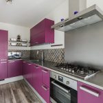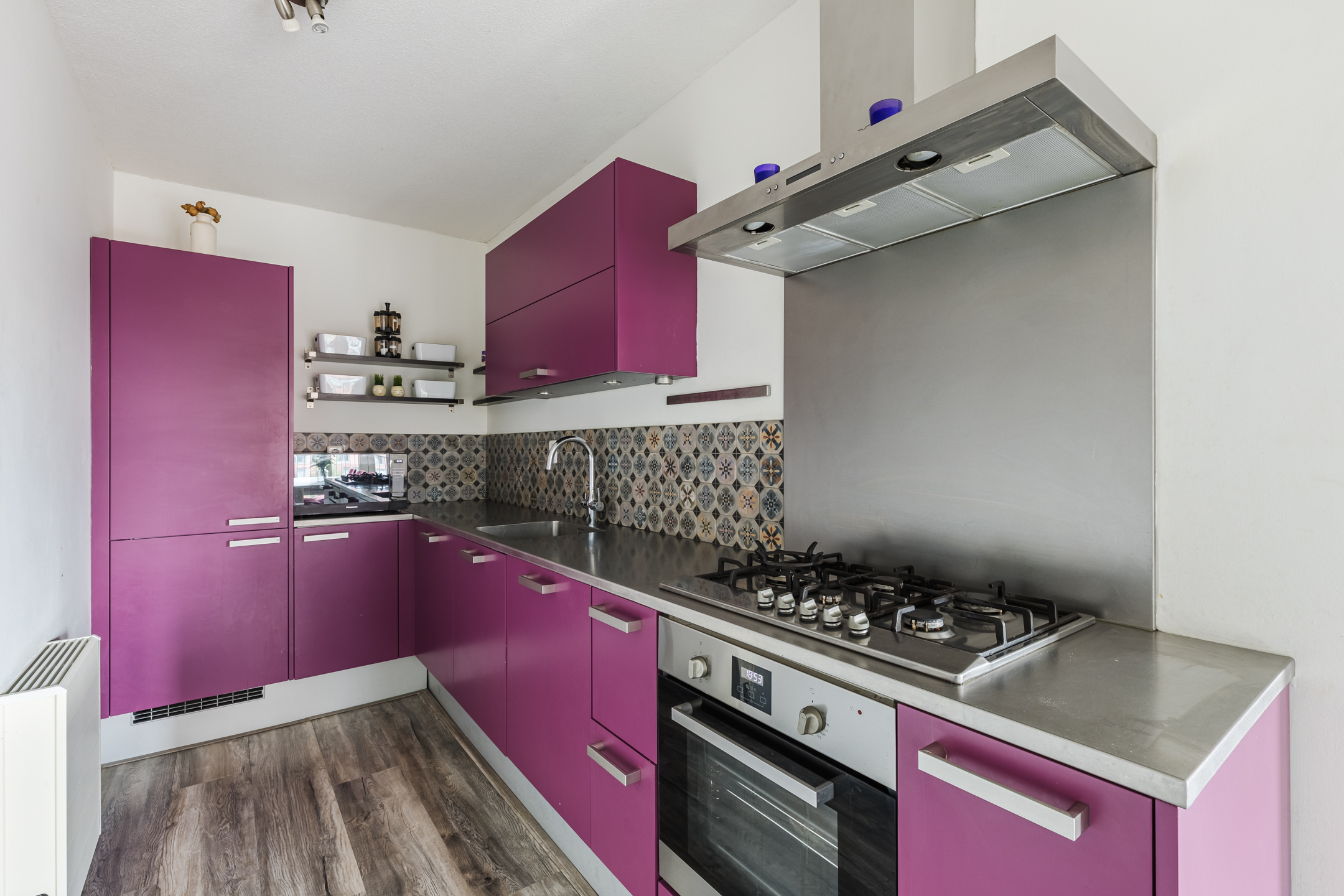 The semi-open kitchen was renovated in 2016 and has a corner layout. It has a striking design with purple kitchen cabinets, a gray countertop and a cheerful backsplash. The kitchen is equipped with the following appliances: dishwasher (2023), gas stove, range hood, oven, Quooker (2024) and refrigerator.