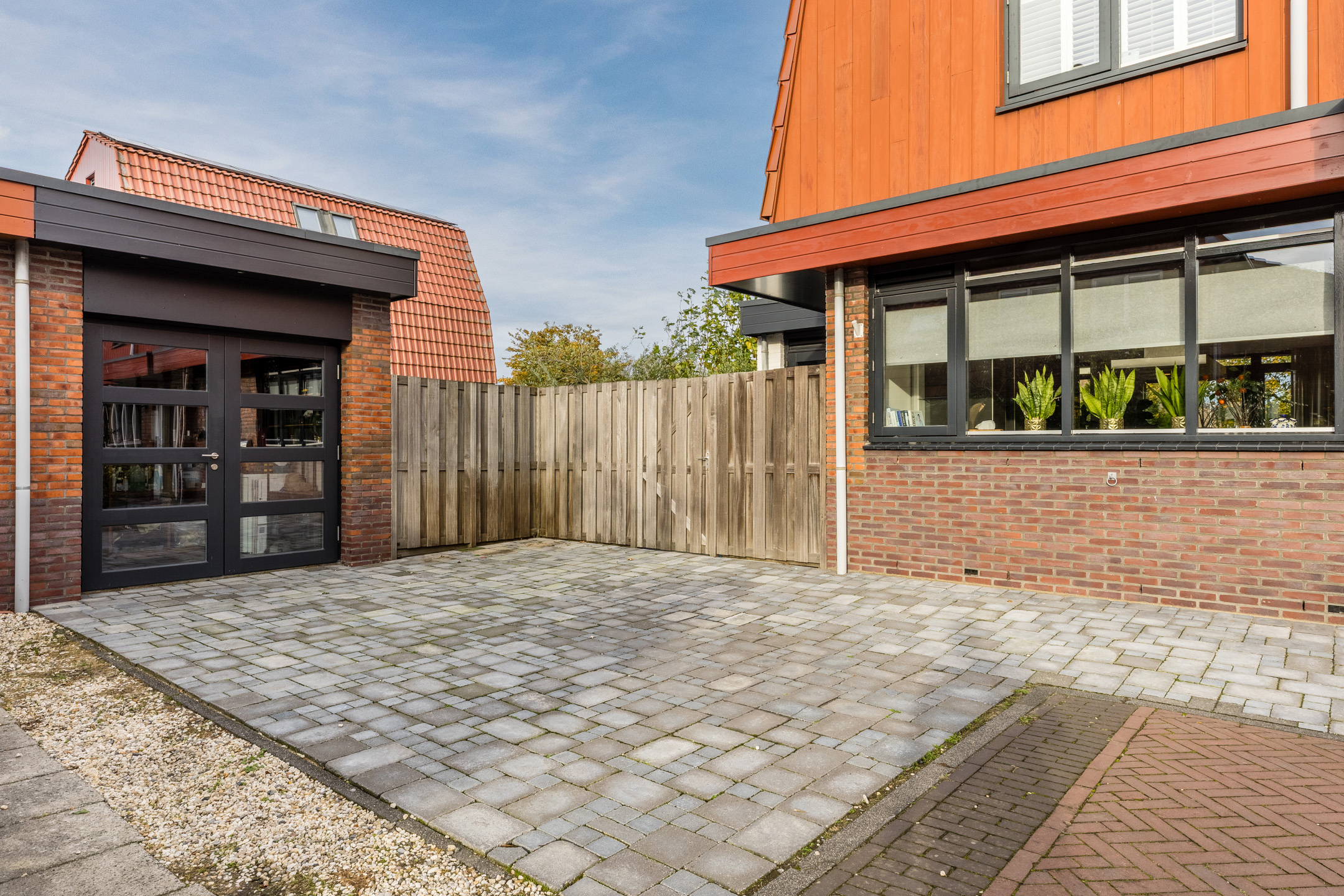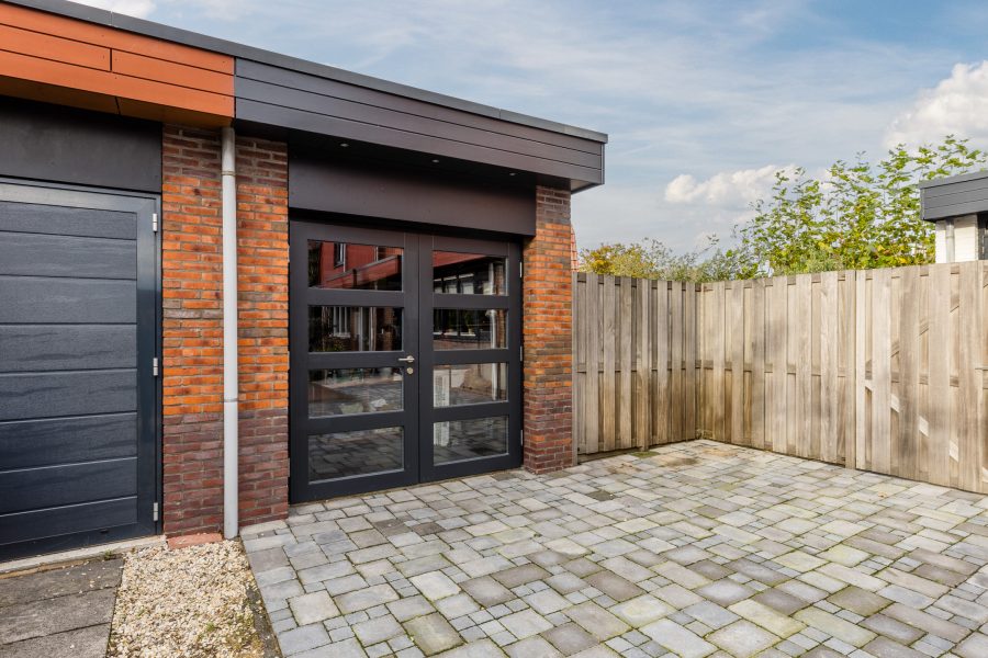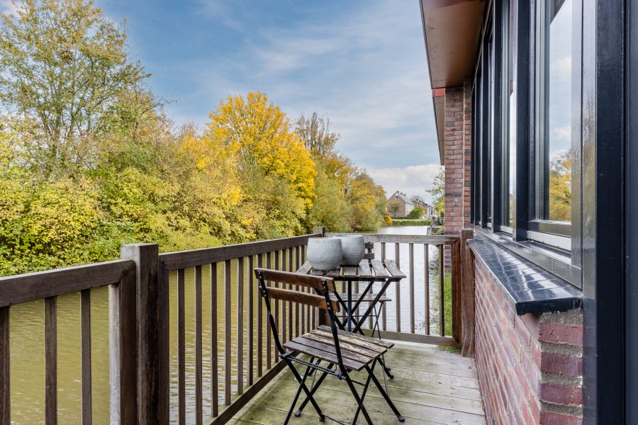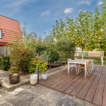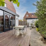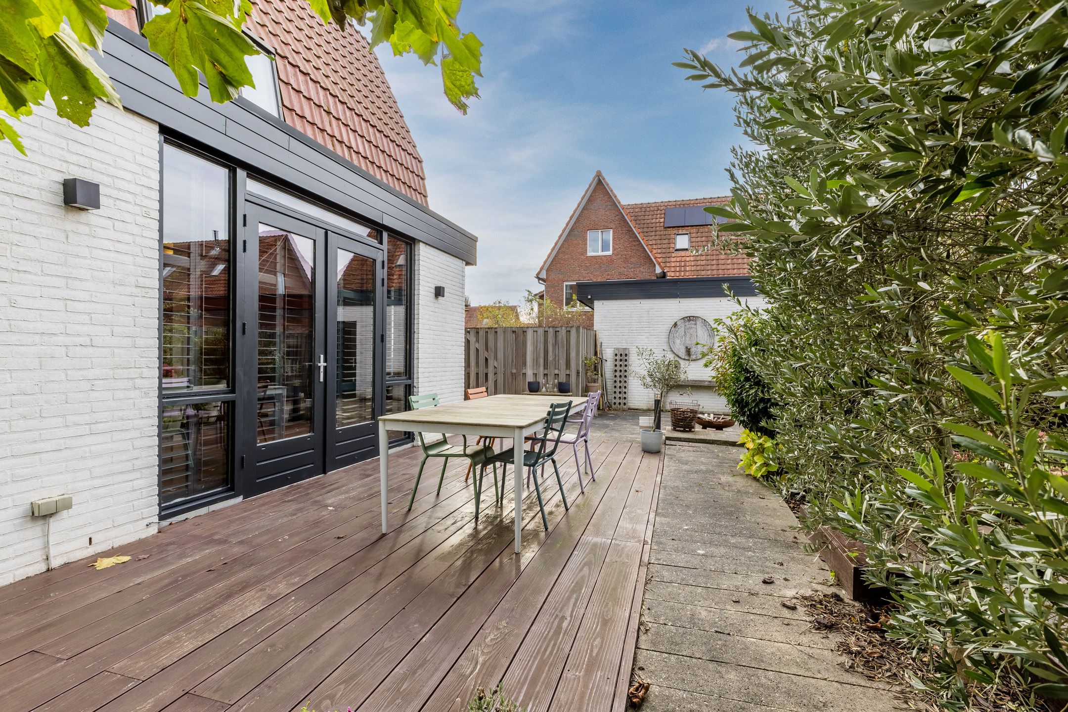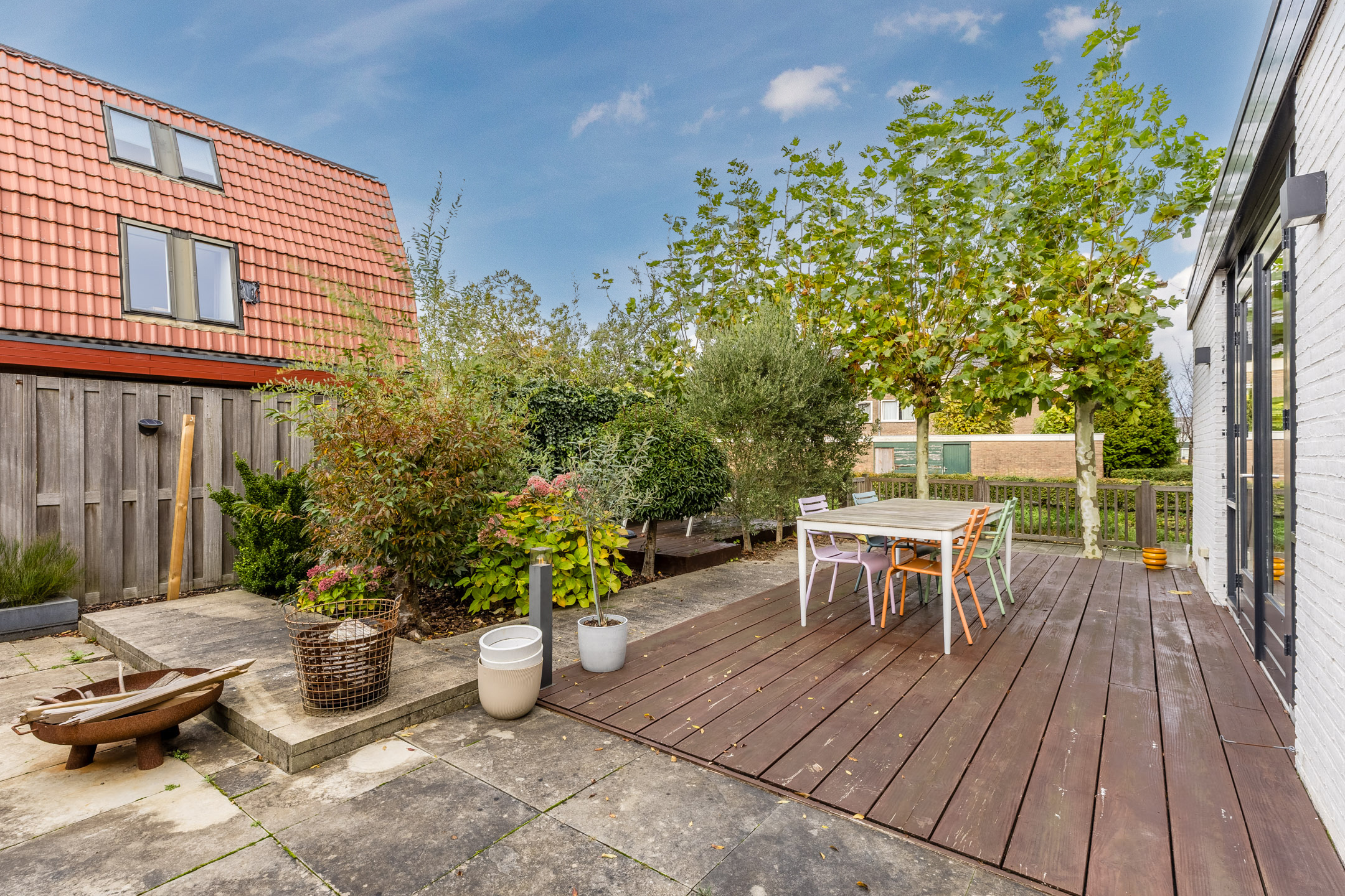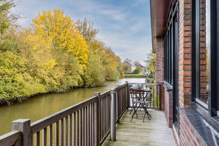The house has a lovely, large garden. It is decorated with a combination of tiles, greenery and decking. At the back of the house, you will find a terrace by the water, where you can fully relax. The garden offers space for several cozy seating areas. Thanks to its sheltered location, you can enjoy a lot of privacy here.