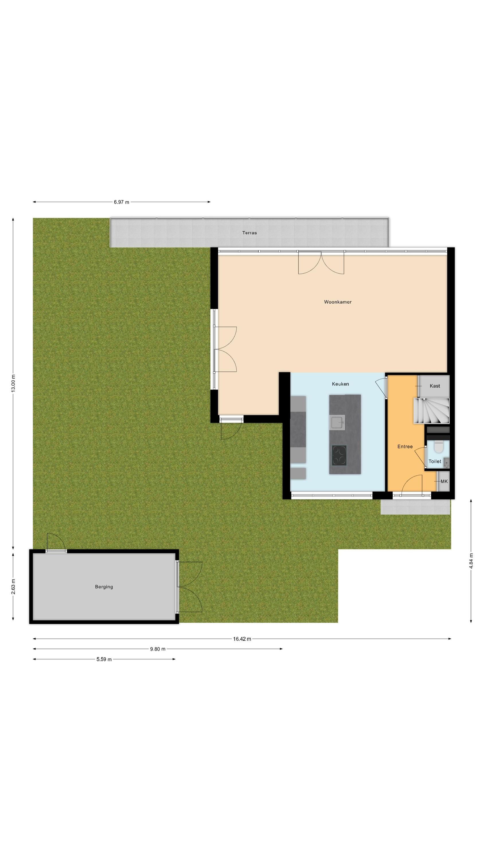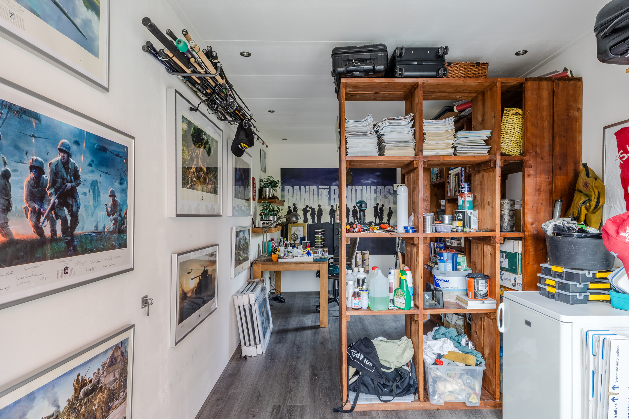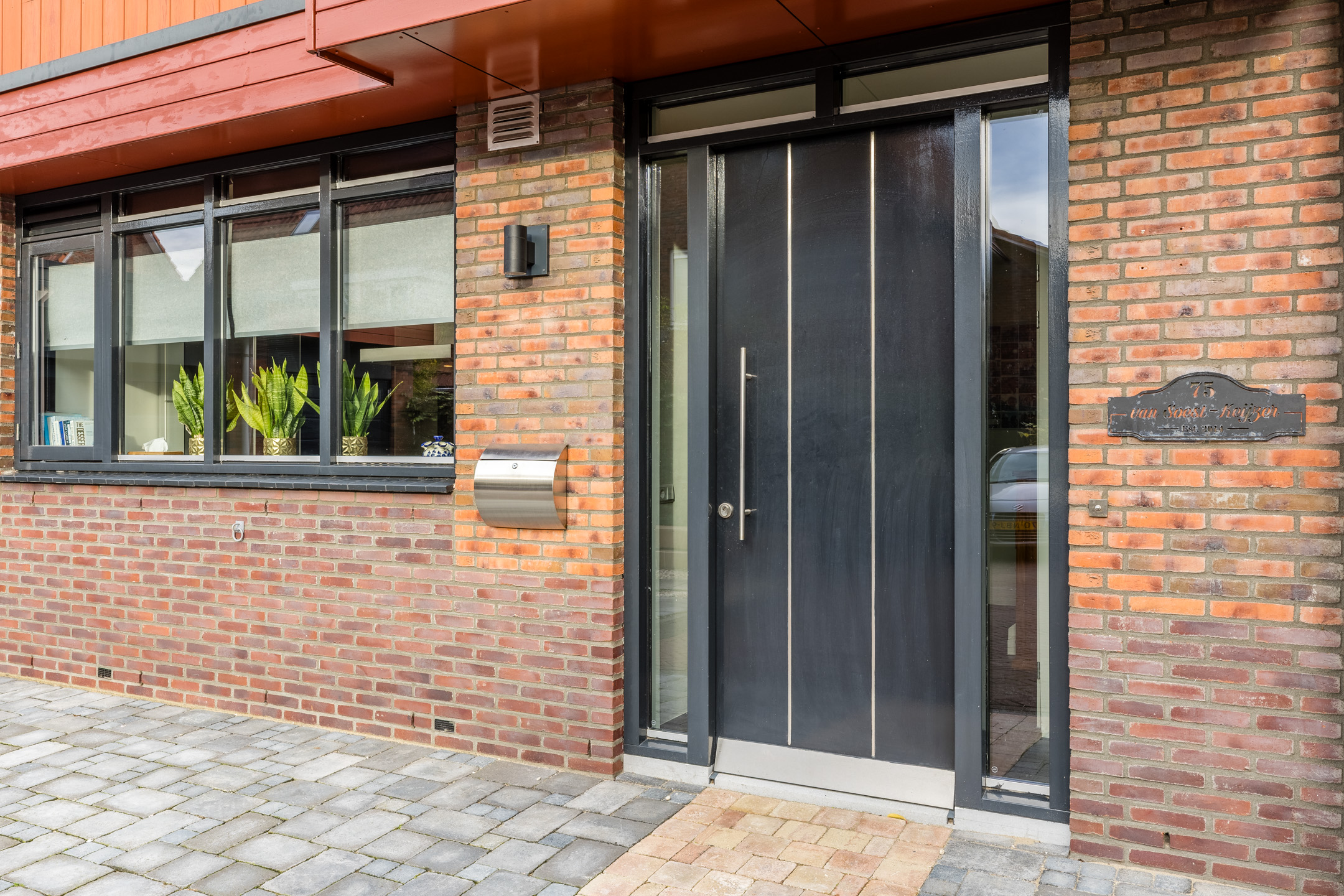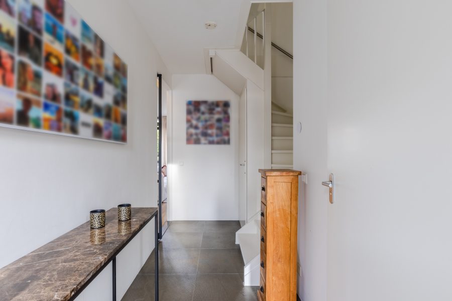 Through the well-maintained front garden, you reach the former garage and the covered front door of this house. The garage is fully insulated and converted into a man cave/storage room. Behind the front door is a spacious entrance hall, which is neatly finished with a tiled floor with underfloor heating. From here you have access to the meter cupboard, a toilet room with a floating toilet and washbasin, the stairs to the first floor, a storage cupboard and the living room with open kitchen.