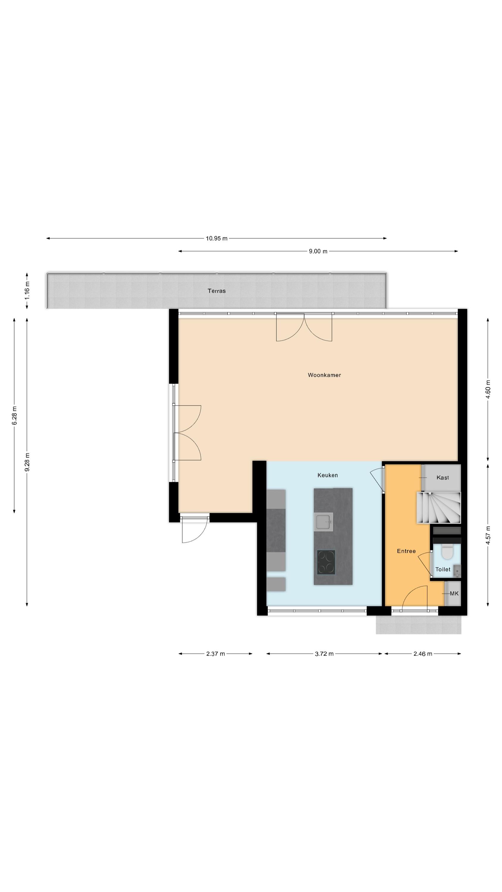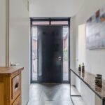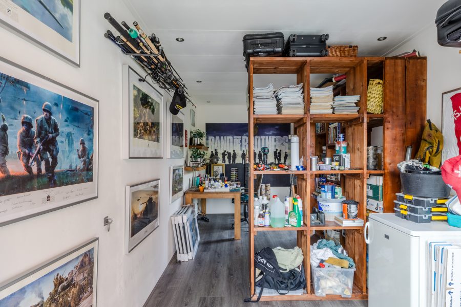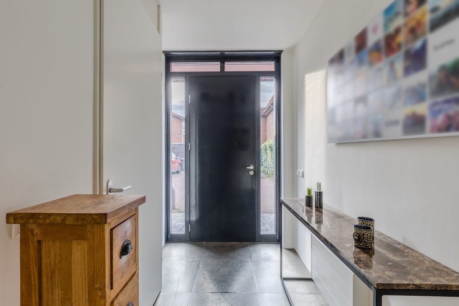 Via de netjes verzorgde voortuin bereik je de voormalige garage en de overdekte voordeur van deze woning. De garage is volledig geïsoleerd en omgebouwd tot een mancave/opslagruimte. Achter de voordeur bevindt zich een ruime entreehal, die netjes is afgewerkt met een tegelvloer met vloerverwarming. Vanuit hier heb je toegang tot de meterkast, een toiletruimte met zwevend toilet en fonteintje, de trap naar de eerste verdieping, een bergkast en de woonkamer met open keuken.