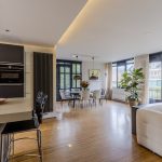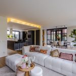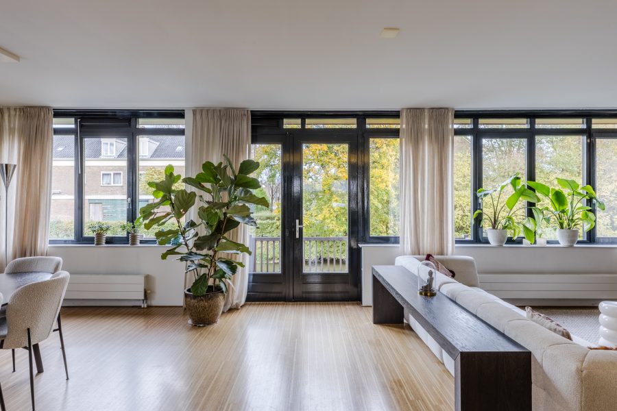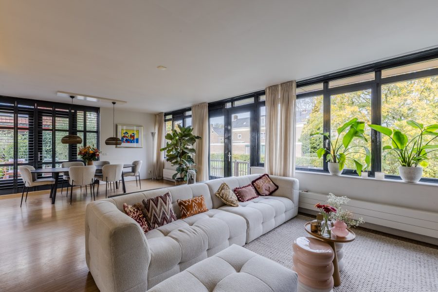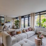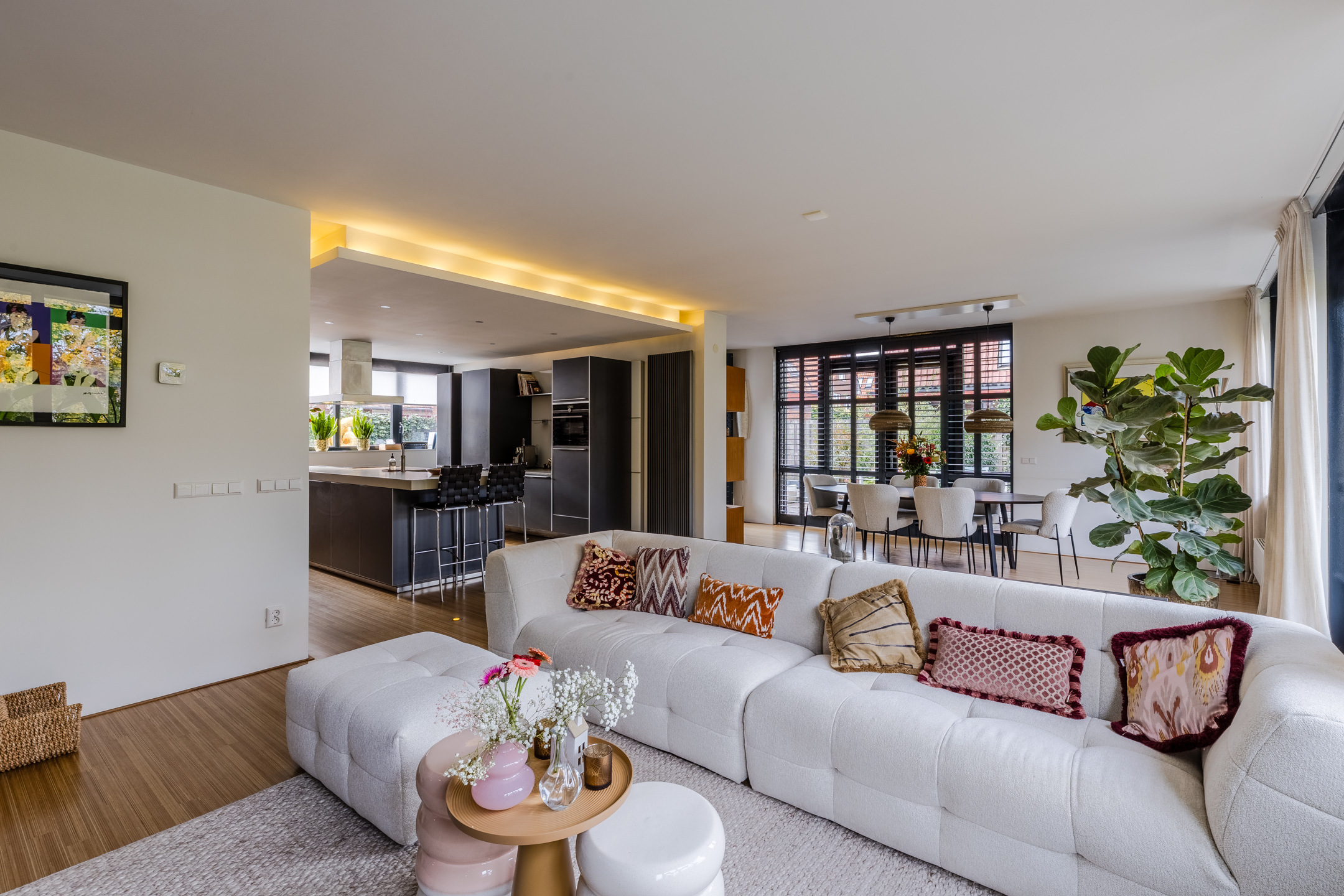 • Royale en moderne woonkamer met grote ramen en openslaande tuindeuren