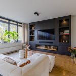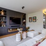 The spacious and cozy living room has beautiful flooring and sleek walls. Thanks to the presence of several large windows and garden doors, the room enjoys an abundance of natural light. The living room features a beautiful TV wall with an electric fireplace.