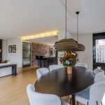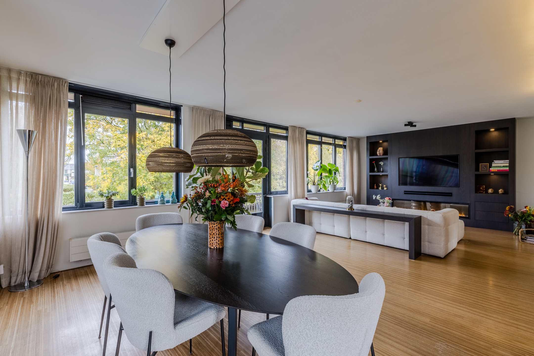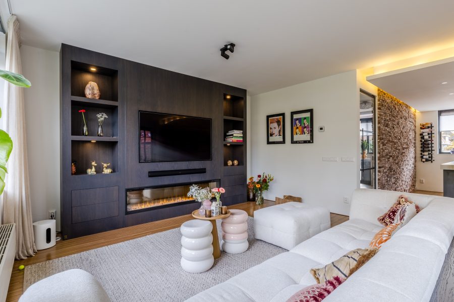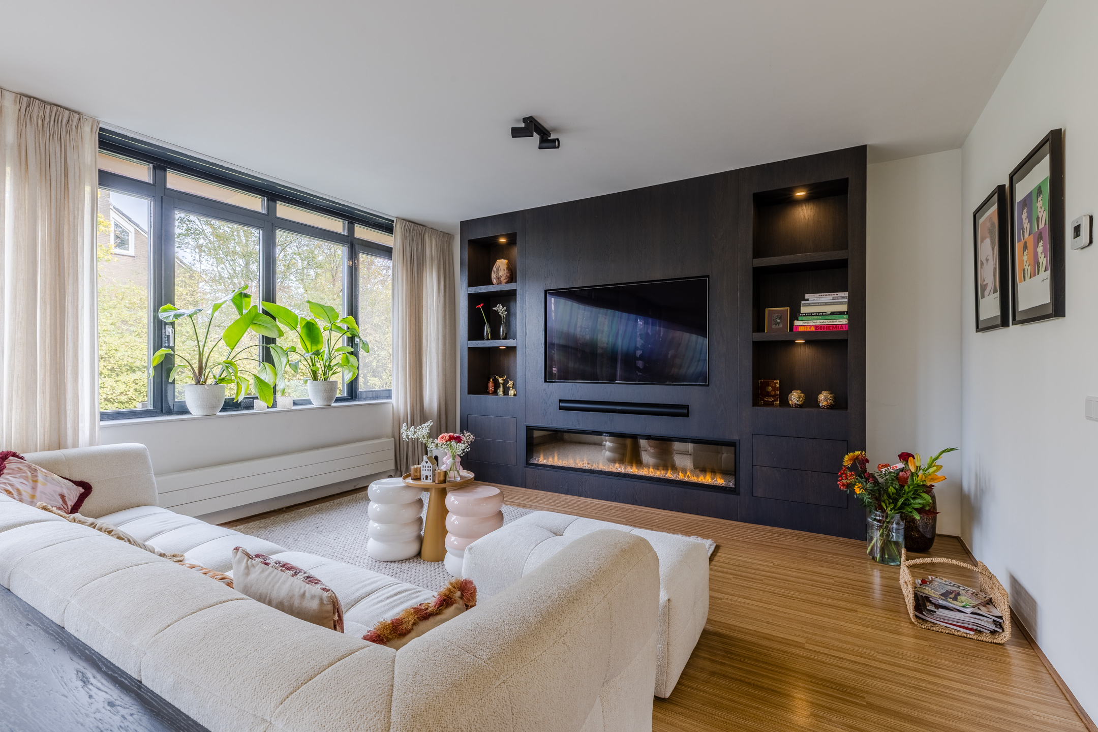 De royale en sfeervolle woonkamer is voorzien van een fraaie vloer en strak afgewerkte wanden. Dankzij de aanwezigheid van meerdere grote ramen en openslaande tuindeuren geniet de woonkamer van een overvloed aan natuurlijk licht. In de living bevindt zich een prachtige tv-wand met een elektrische haard.