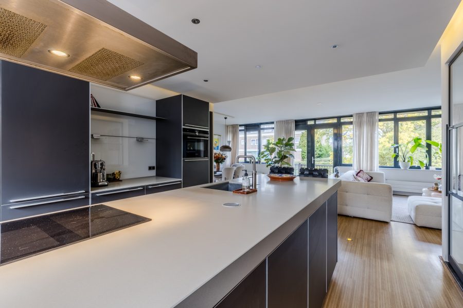De moderne keuken bestaat uit een kookeiland en een strakke kastenwand met een open nis. Het geheel heeft een fraai design met donkere keukenkastjes en lichte werkbladen. De keuken is uitgerust met de volgende hoogwaardige apparatuur (2023): vaatwasser, inductie fornuis, afzuigkap, oven, koelkast, vriezer en Quooker. Er is volop kastruimte aanwezig, waaronder diverse lades. De keuken wordt verlicht met inbouwspots.