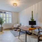 The modern kitchen consists of a cooking island and sleek cabinetry with an open niche. The whole has a beautiful design with dark kitchen cabinets and light countertops. The kitchen is equipped with the following high-quality appliances (2023): dishwasher, induction stove, range hood, oven, refrigerator, freezer and Quooker. There is plenty of cupboard space, including various drawers. The kitchen is lit with recessed spotlights.