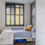 On this floor, you will find the fourth bedroom, second bathroom and a laundry room. The spacious bedroom on the second floor has beautiful herringbone flooring and sleek walls.