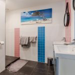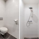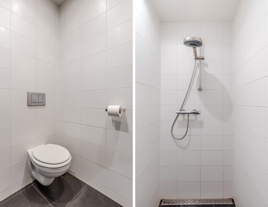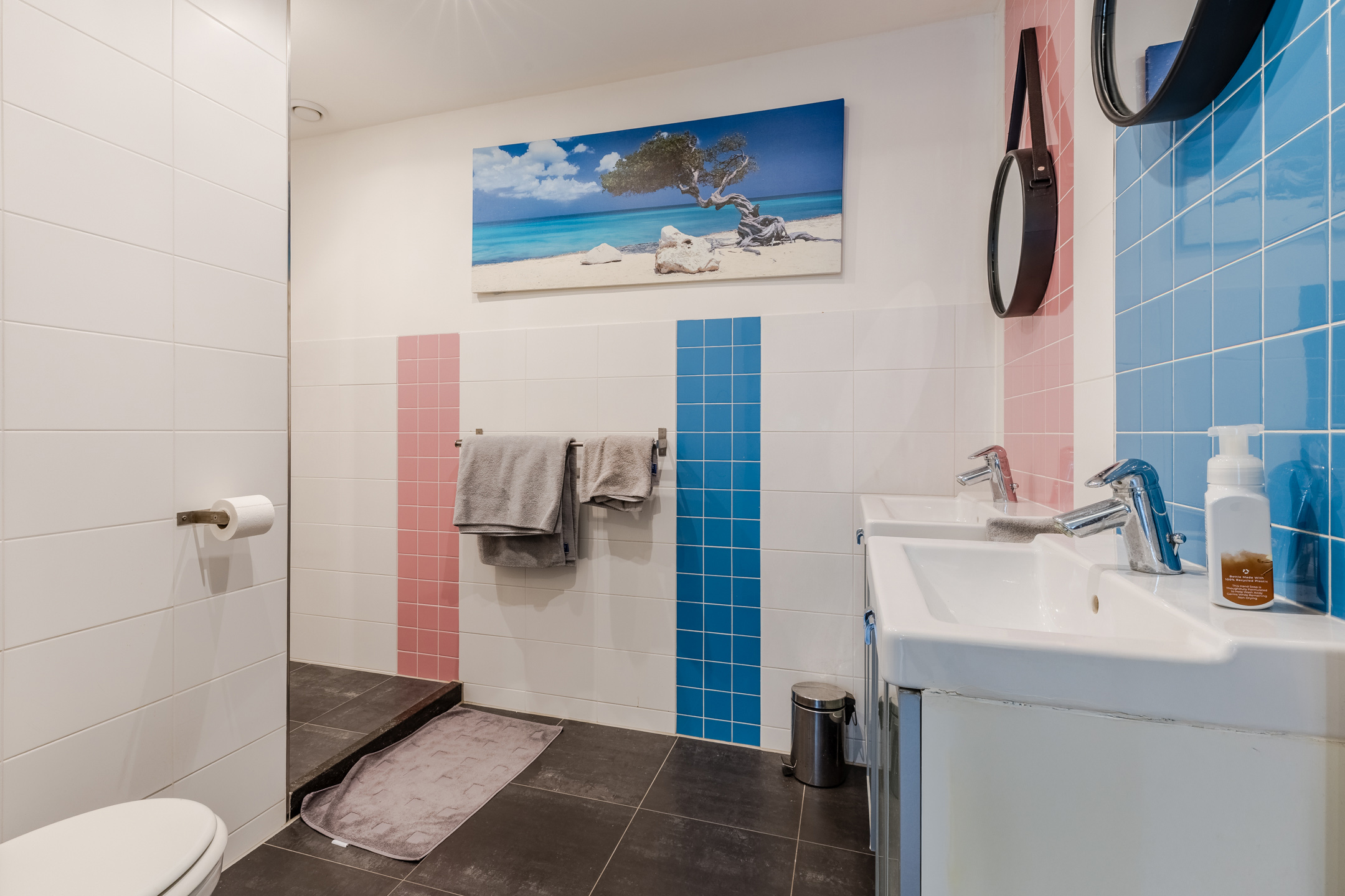 The bathroom is spacious and has a modern look. The room is fitted with beautiful green tiles. Here you will find a double sink, bathtub and walk-in shower with rain shower. The bathroom is lit with recessed spotlights and has underfloor heating.
