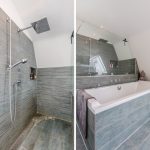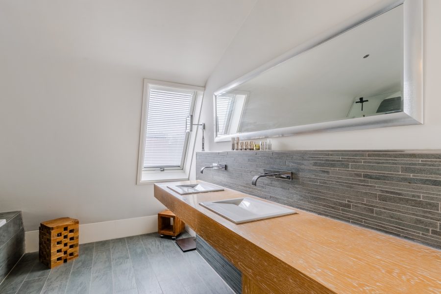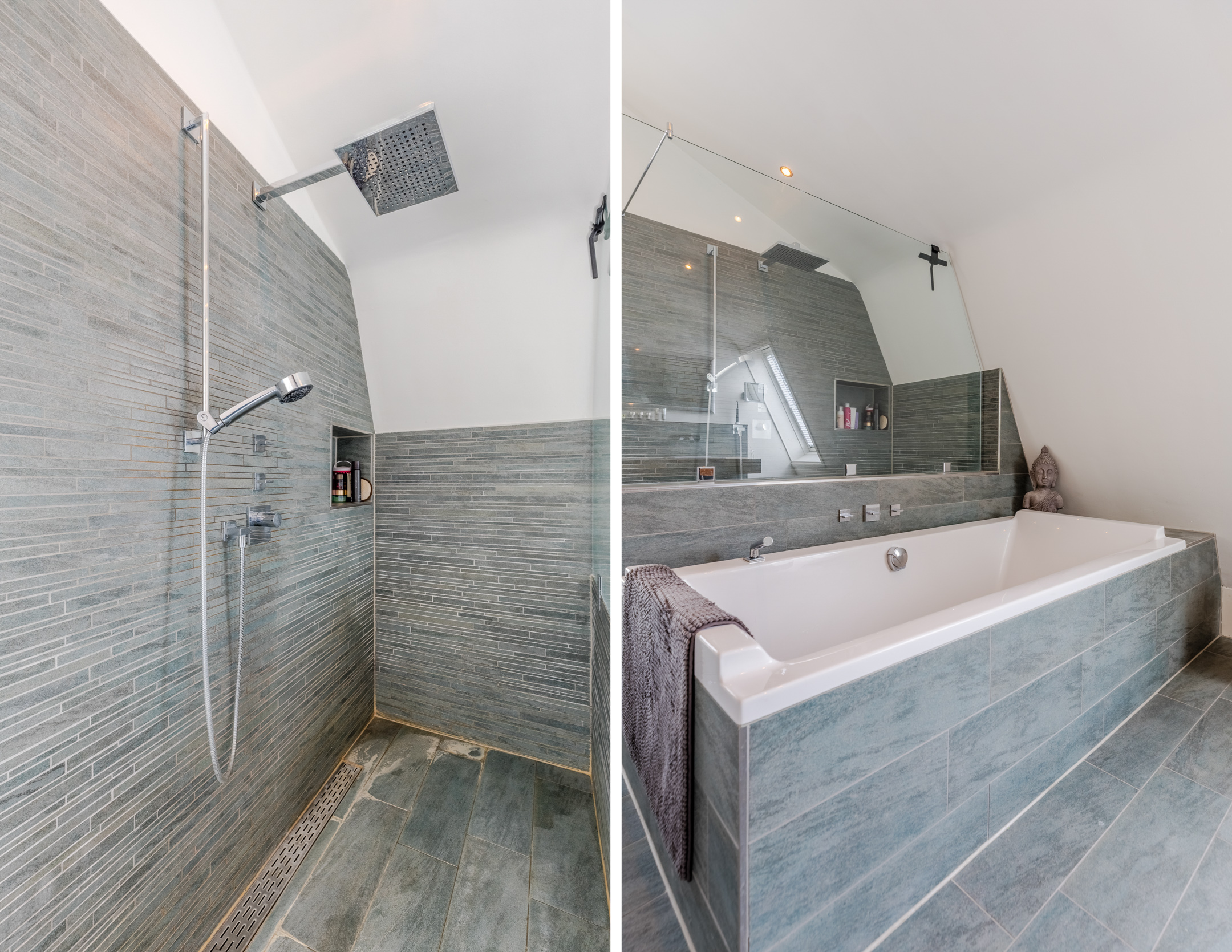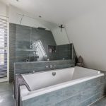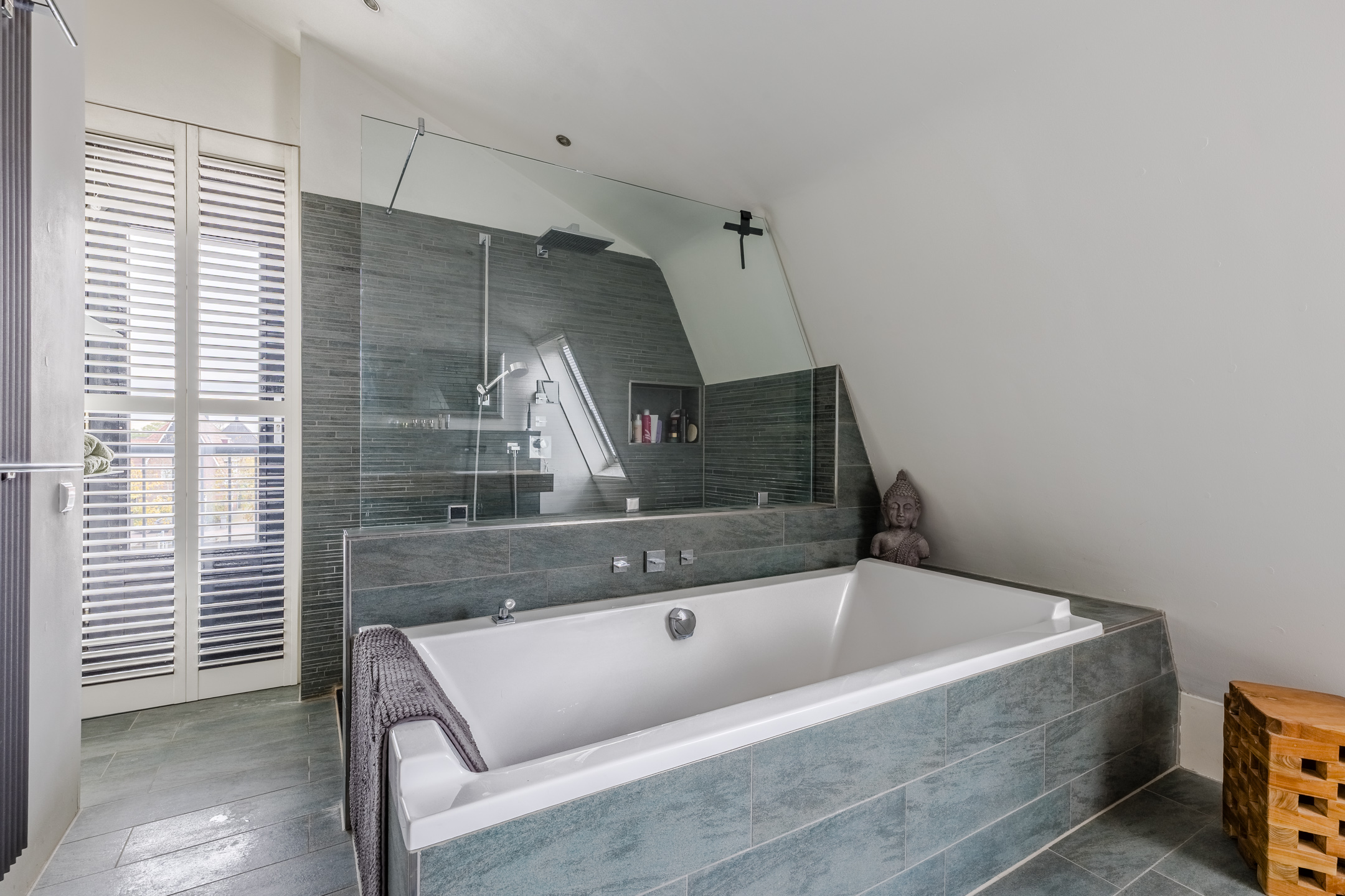 De badkamer is royaal van formaat en heeft een moderne uitstraling. De ruimte is voorzien van mooie groene tegels. Hier tref je een dubbele wastafel, ligbad en een inloopdouche met regendouche aan. De badkamer wordt verlicht met inbouwspots en is voorzien van vloerverwarming.