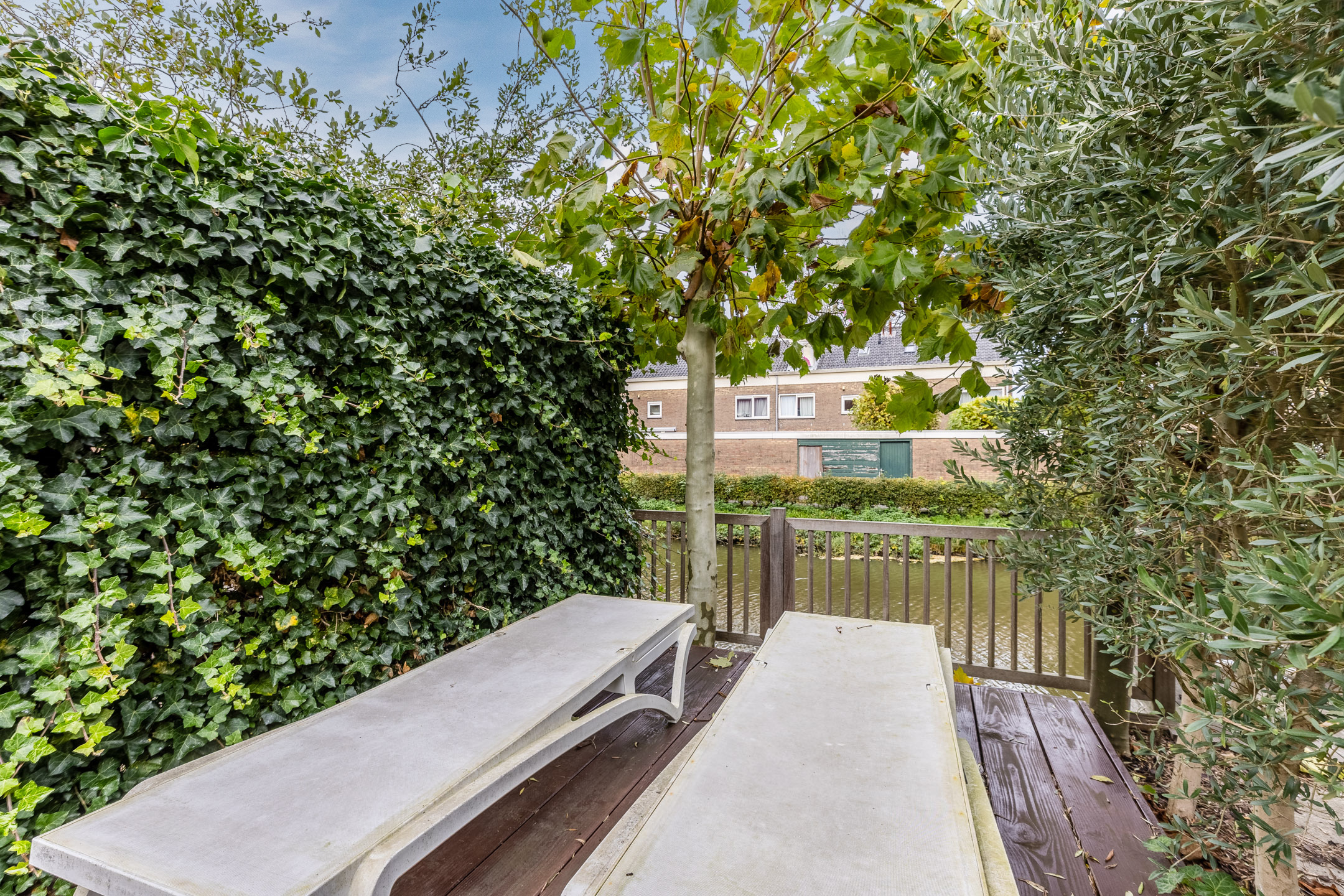 Het huis heeft een heerlijke, grote tuin. Deze is ingericht met een combinatie van tegels, groen en vlonderplanken. Aan de achterzijde van het huis vind je een terras aan het water, waar je ultiem kunt ontspannen. De tuin biedt ruimte voor meerdere gezellige zitjes. Dankzij de beschutte ligging geniet je van veel privacy.