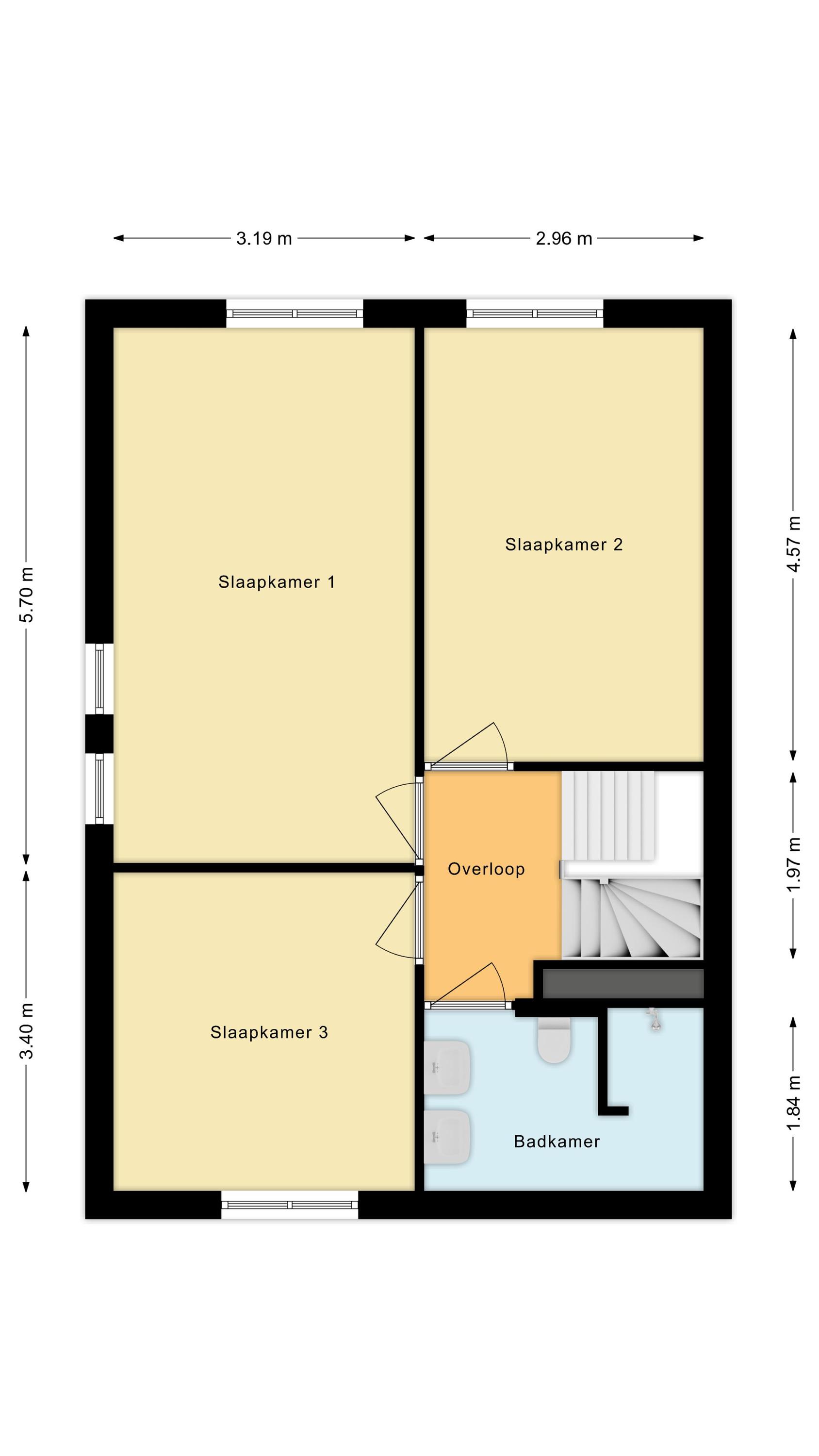 Deze verdieping telt drie slaapkamers en een badkamer. Twee slaapkamers zijn voorzien van vloerbedekking en één van een visgraatvloer. Alle kamers zijn ruim van formaat, modern afgewerkt en heerlijk licht. De badkamer is netjes betegeld en uitgerust met een zwevend toilet, badmeubel met dubbele wastafel en een inloopdouche. Er is elektrische vloerverwarming aanwezig in de badkamer.
