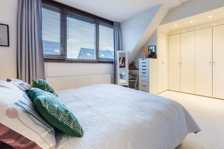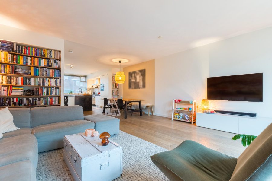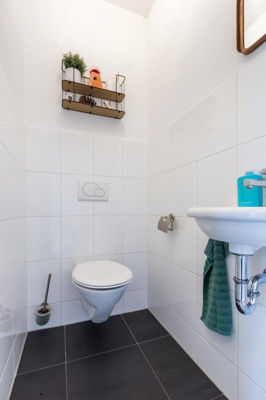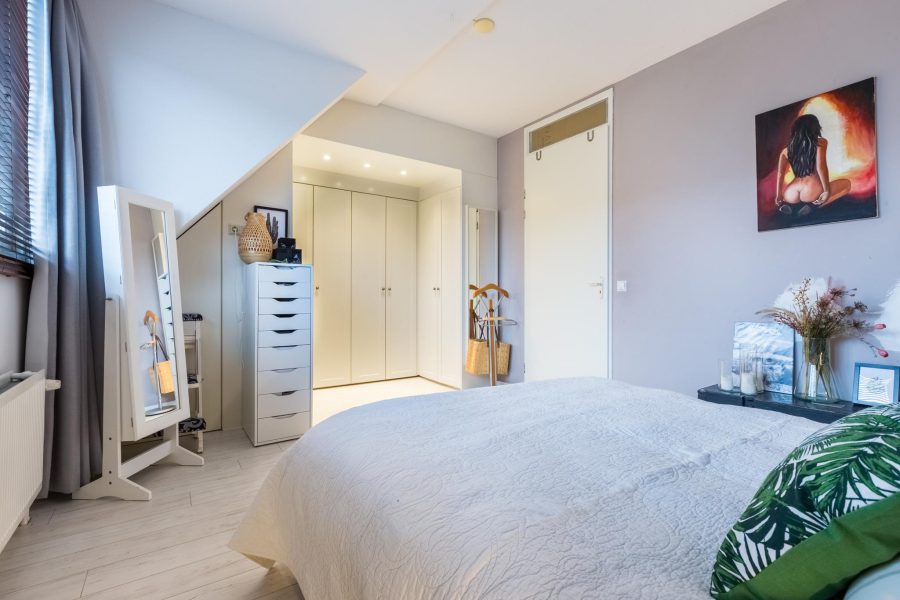 We put the car on the private driveway or in the garage and reach the front door of the house via the front garden. Entrance with meter closet and wardrobe, floating toilet with hand basin and access to the living room with open kitchen. The spacious, garden-oriented living room has a wide window at the rear with French doors to the garden. Here is room for a spacious seating area. At the front you will find the open kitchen. The kitchen has white fronts and a dark counter top from Belgian natural stone and is equipped with various appliances and a kitchen island. The kitchen also has a wide window overlooking the front garden. Near the kitchen is room for a spacious dining table. There are oak wooden floorboards with underfloor heating and the walls have a partly neutral, partly decorative finish. In the living room, you will find the staircase to the first floor and a staircase closet.
