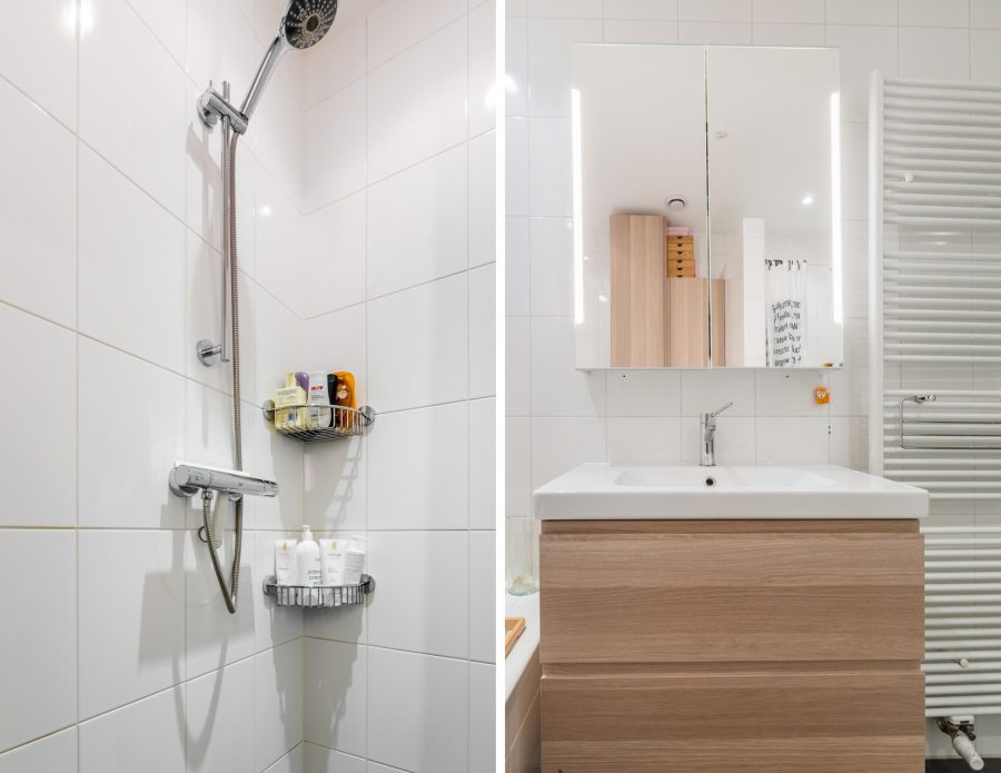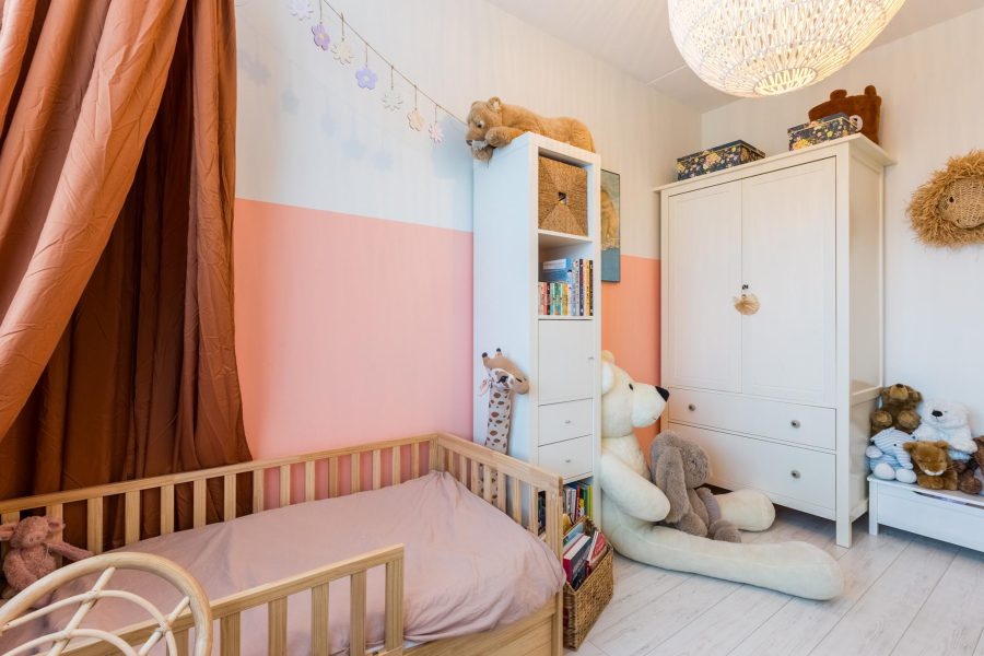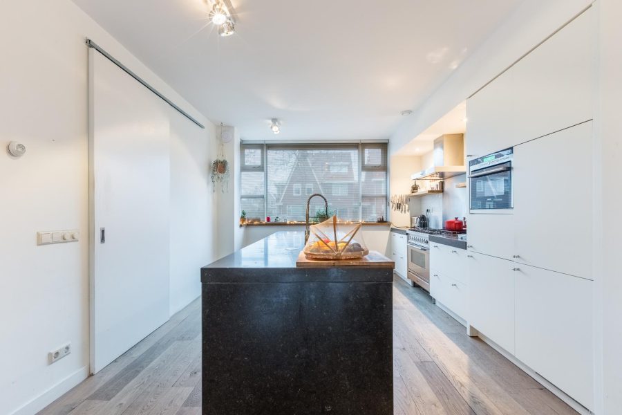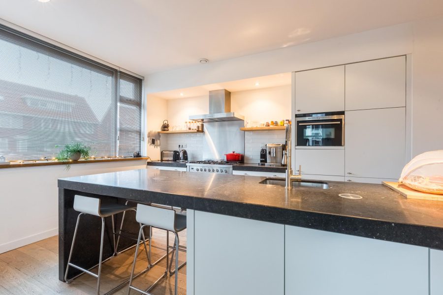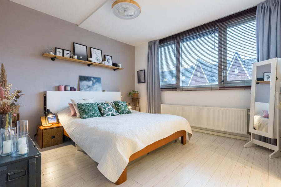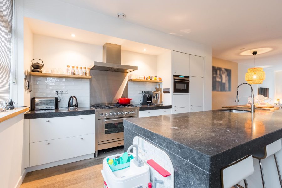 We put the car on the private driveway or in the garage and reach the front door of the house via the front garden. Entrance with meter closet and wardrobe, floating toilet with hand basin and access to the living room with open kitchen. The spacious, garden-oriented living room has a wide window at the rear with French doors to the garden. Here is room for a spacious seating area. At the front you will find the open kitchen. The kitchen has white fronts and a dark counter top from Belgian natural stone and is equipped with various appliances and a kitchen island. The kitchen also has a wide window overlooking the front garden. Near the kitchen is room for a spacious dining table. There are oak wooden floorboards with underfloor heating and the walls have a partly neutral, partly decorative finish. In the living room, you will find the staircase to the first floor and a staircase closet.