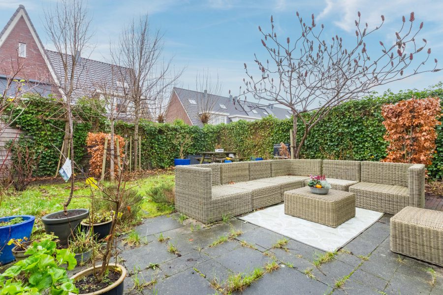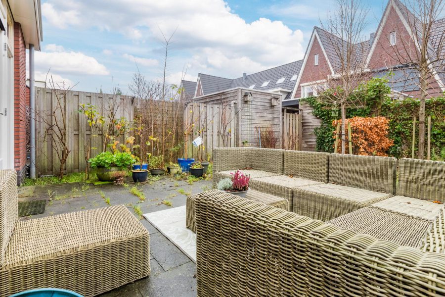 De woning heeft een voortuin en een diepe, beschutte en omhaagde achtertuin. De tuin is deels groen en deels betegeld. Er is ruimte voor een loungeplek en om een eettafel buiten te plaatsen. Kinderen kunnen hier heerlijk en veilig spelen.