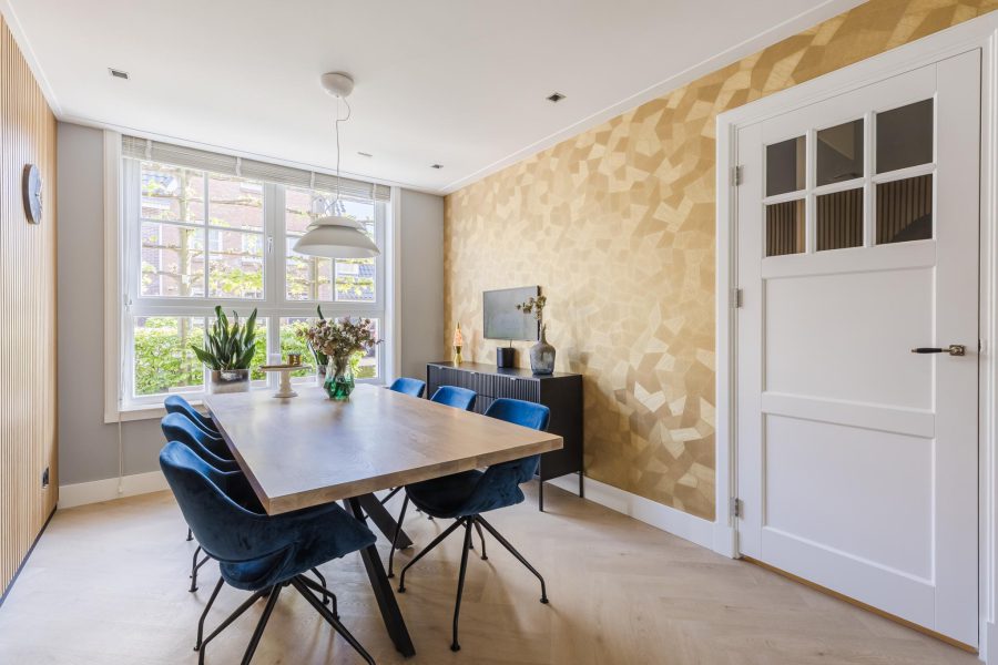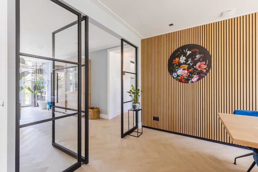 A beautifully landscaped front garden (partly green, partly paved) leads to the front door. Entry hall with fuse box, coat rack, floating toilet with hand basin, staircase to the first floor, storage closet, and access to the dining and living area with open access to the kitchen. The dining room offers enough space for a large table and connects through a steel-framed pivot door to the atmospheric living room. This garden-facing room features large rear windows and French doors that open to the backyard. At the front, the open kitchen is accessible through a wide opening.