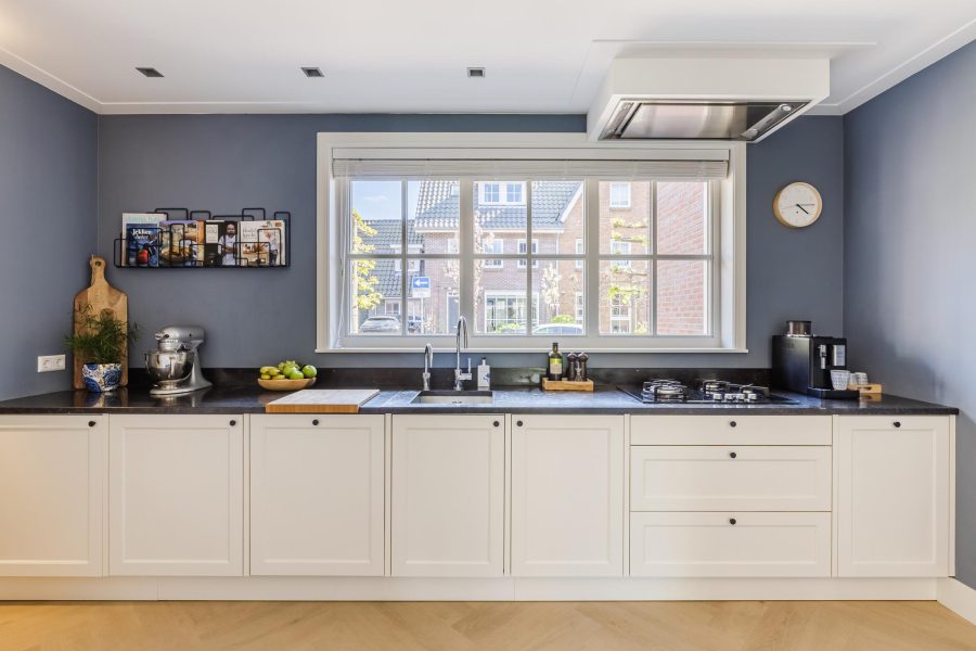 The spacious kitchen (renovated in 2024) features white cabinetry and various built-in appliances including a combi steam oven (2019), a Quooker (2019), and a water softening system (serving the entire home). The kitchen has a wide window with unobstructed views.
