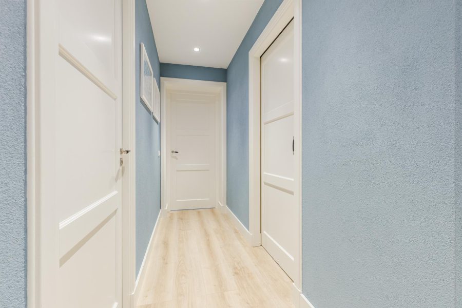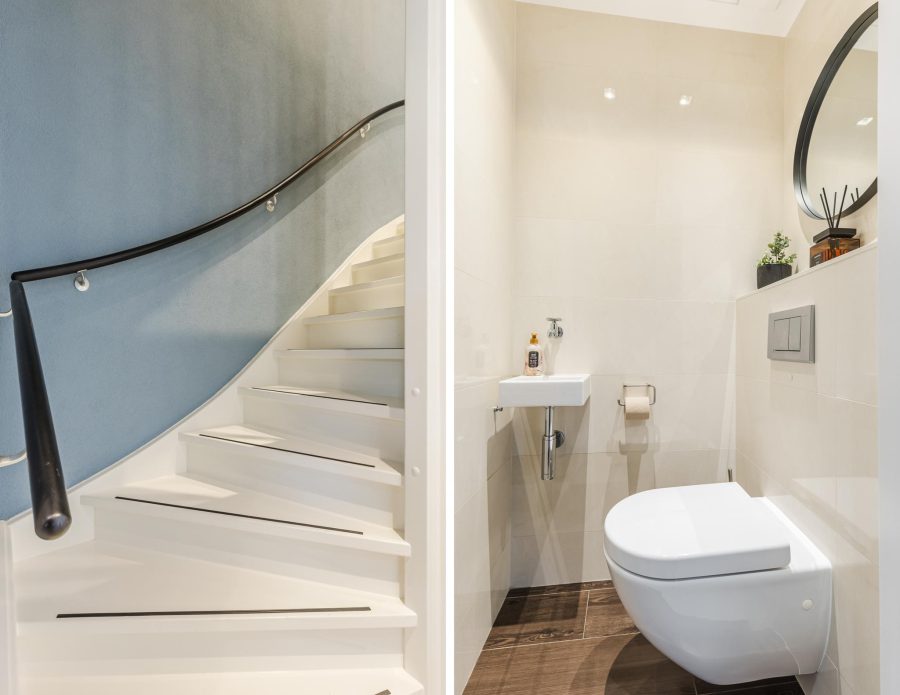 The staircase leads to the first-floor landing, where you’ll find three bedrooms and a bathroom with direct access to a walk-in closet. All three bedrooms are located at the rear, including the spacious master bedroom. The large, luxurious bathroom is situated at the front and includes two washbasins, a mirror, floating toilet, designer radiator, bathtub, and a deluxe steam shower cabin. The bathroom provides access to the generous walk-in closet and also has underfloor heating.