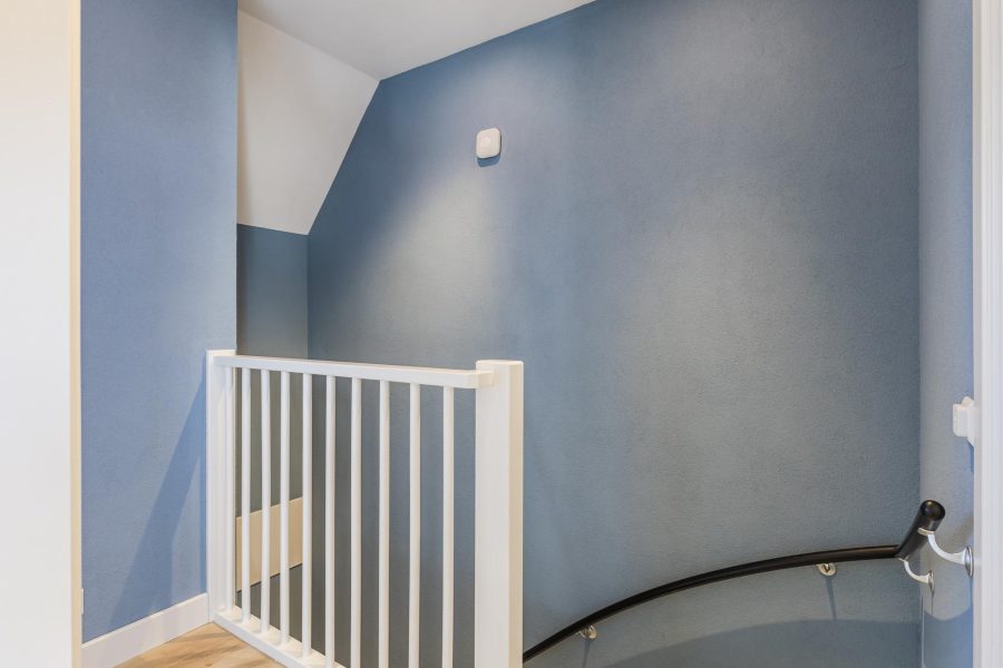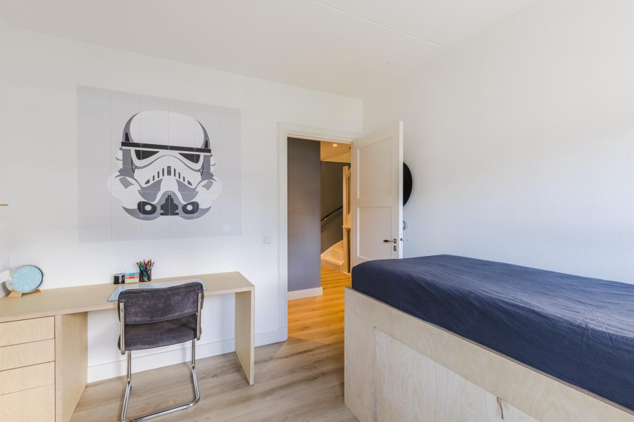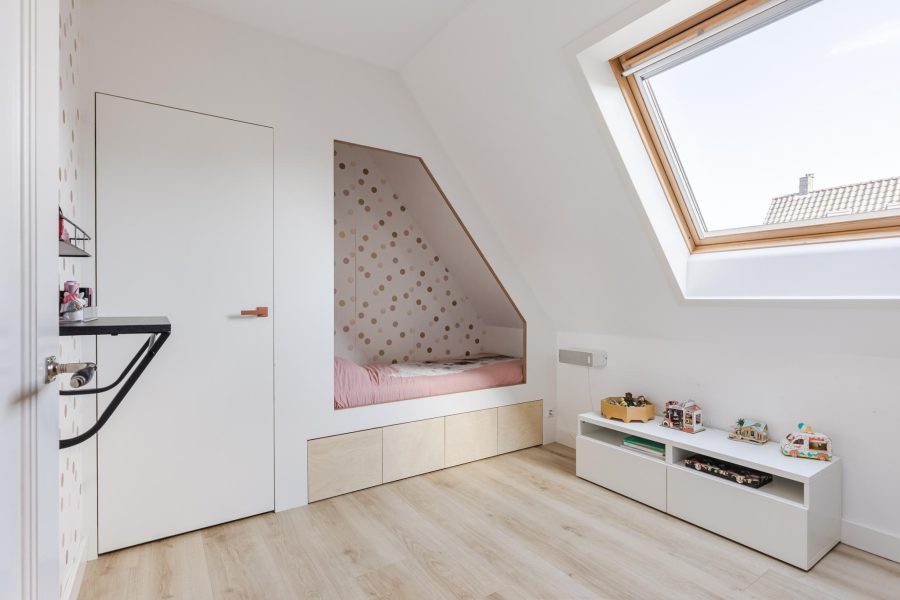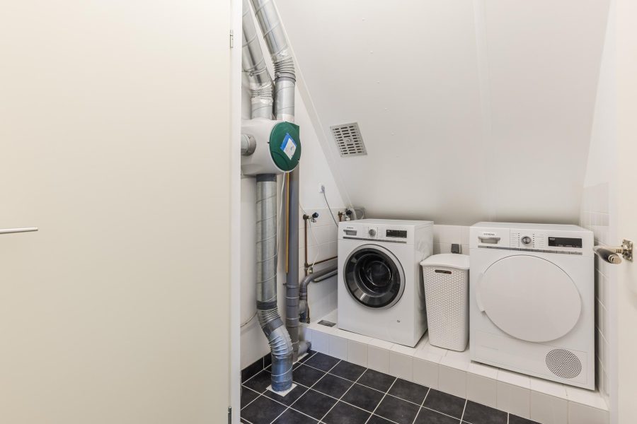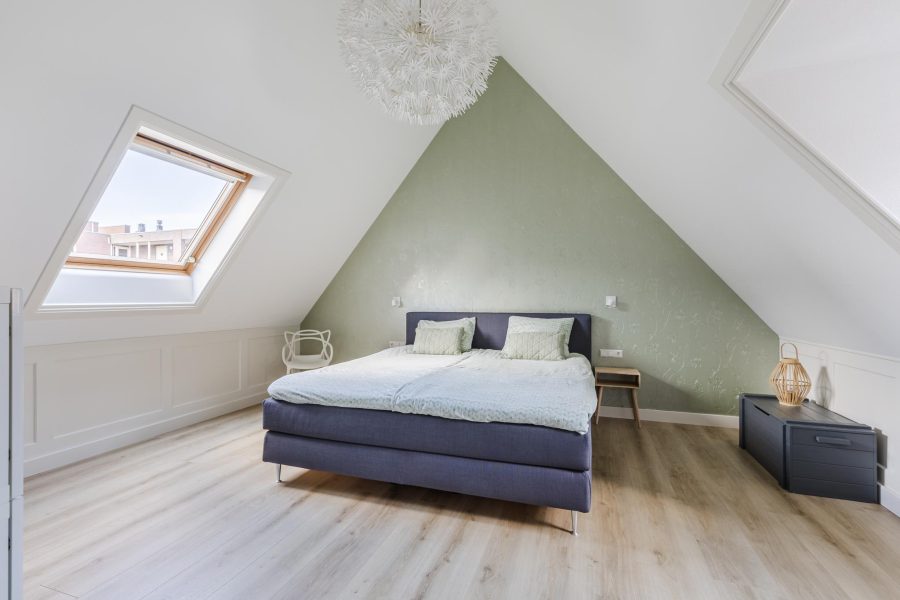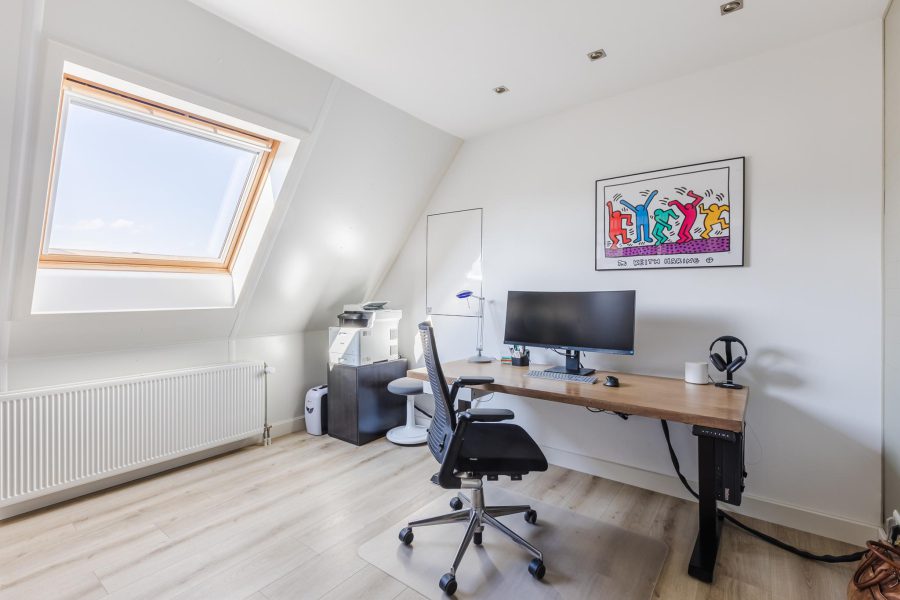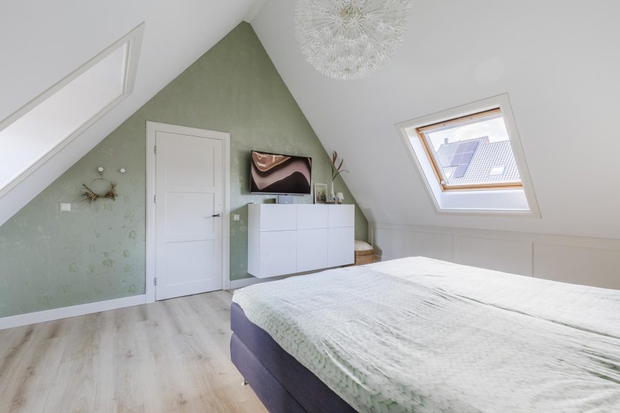 Hier zijn nog twee ruime, keurig afgewerkte slaapkamers te vinden, en een afgesloten ruimte voor het witgoed en de technische installatie. Je vindt hier nog een bergkast en een vlizo trap naar de bergvliering. Het daglicht komt hier via Velux dakramen binnen en op de vloer ligt laminaat.