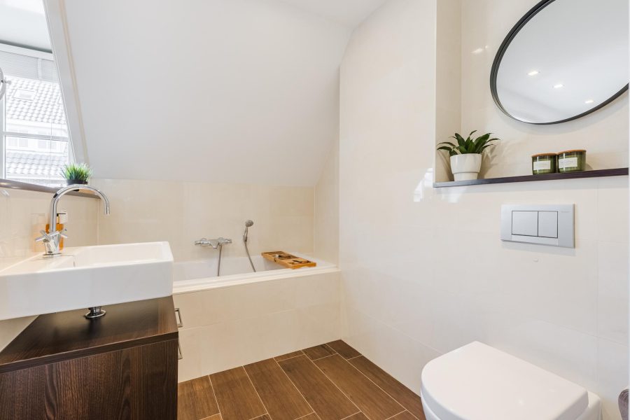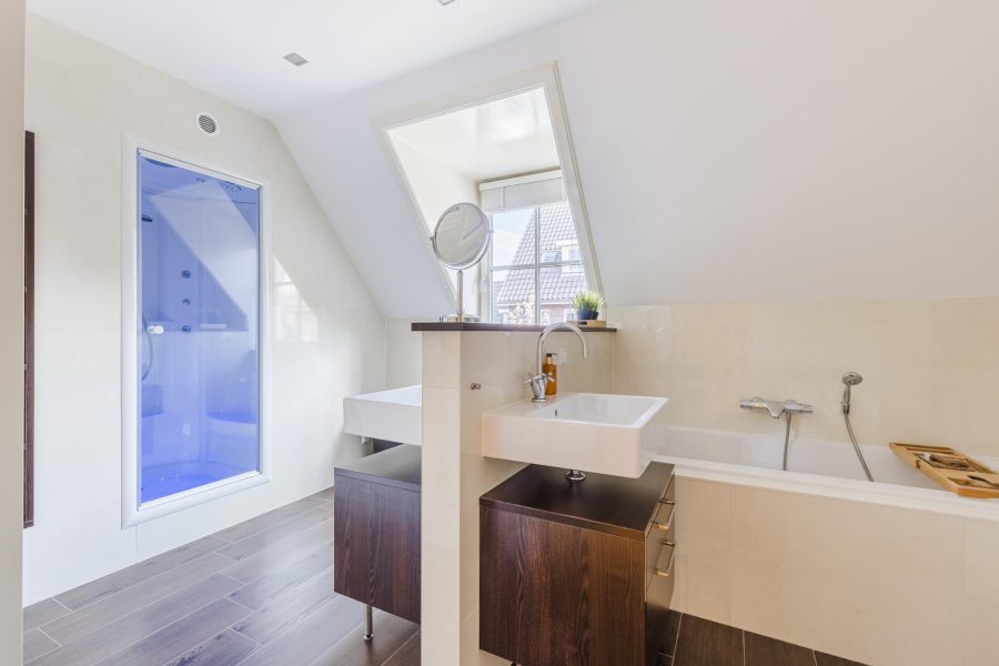 Via de trap in de entreehal bereiken we de overloop. Hier tref je drie slaapkamers en de badkamer met toegang tot de inloopkast aan. De drie slaapkamers liggen aan de achterzijde. De hoofdslaapkamer is ruim bemeten. Aan de voorzijde is de ruime, comfortabele en luxe badkamer gelegen. In de badkamer tref je 2 badmeubels met wastafel, een spiegel, een zwevend toilet, een designradiator, een ligbad en een luxe douchecabine aan. Via de badkamer bereik je de ruime inloopkast. De badkamer is voorzien van vloerverwarming.